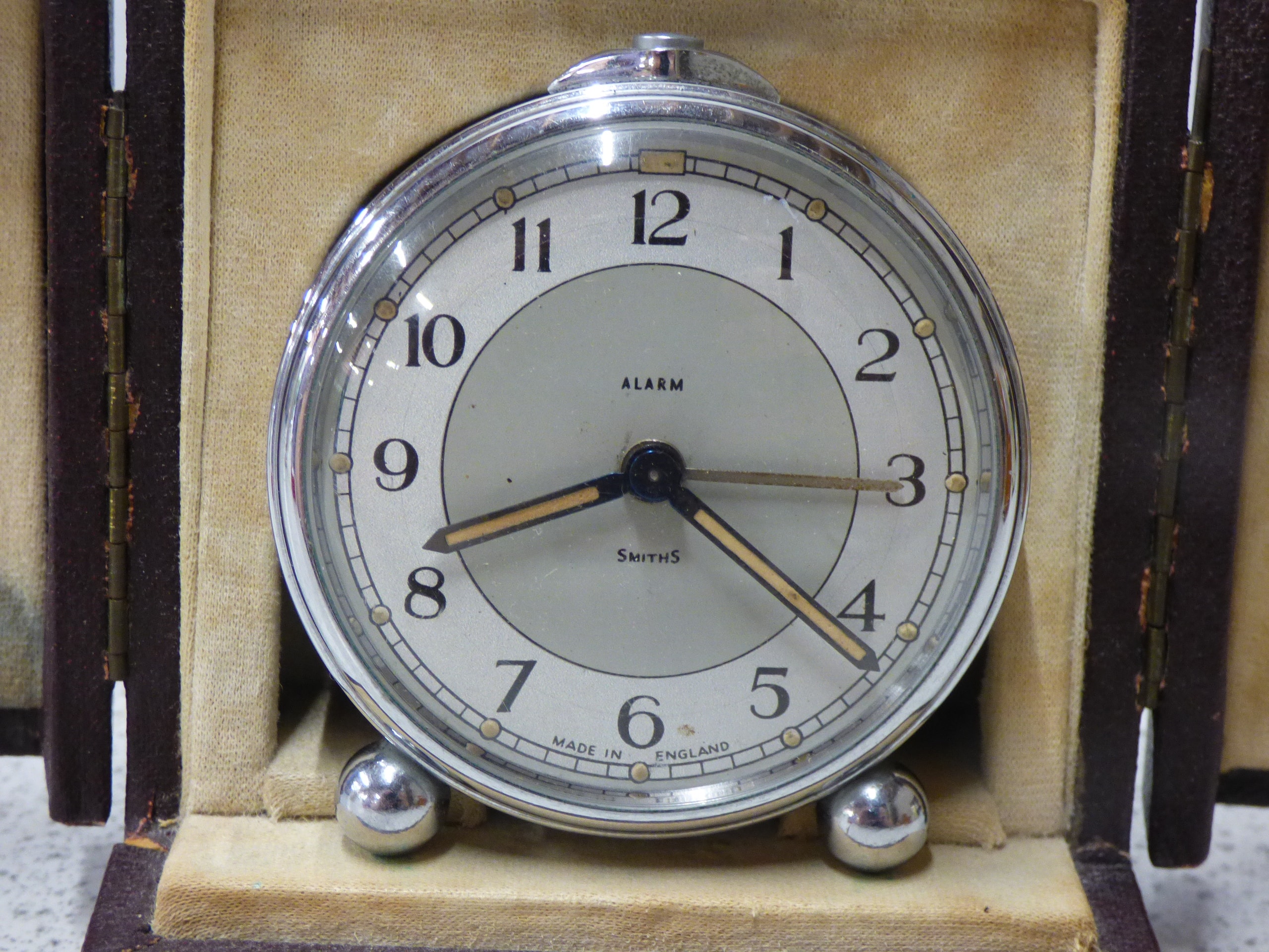 A single silver-toned travel alarm clock with a light grey face and black hands, marked ‘ALARM’, ‘SMITHS’, and ‘MADE IN ENGLAND’, housed in a dark brown folding case with a tan interior.