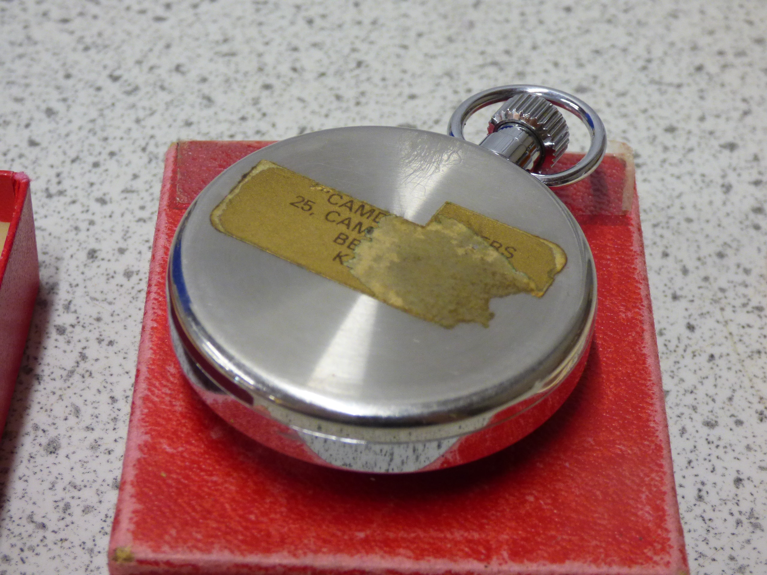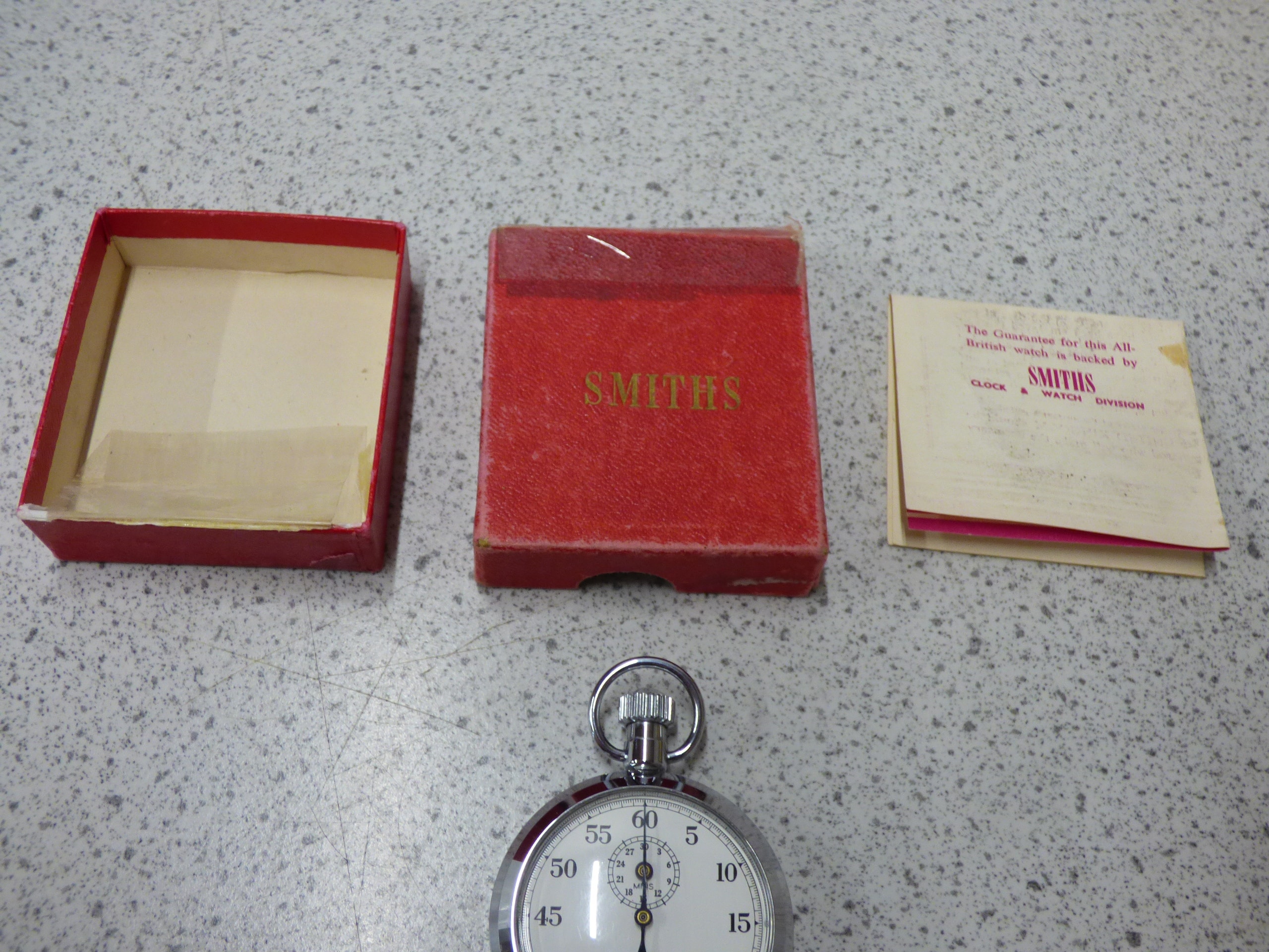 A silver-toned Smiths Shockproof 1/5th Secs. stopwatch features a white dial marked “SMITHS”, “SHOCKPROOF”, and “MADE IN ENGLAND”, accompanied by its red “SMITHS” box and a beige Smiths Clock & Watch Division guarantee leaflet.