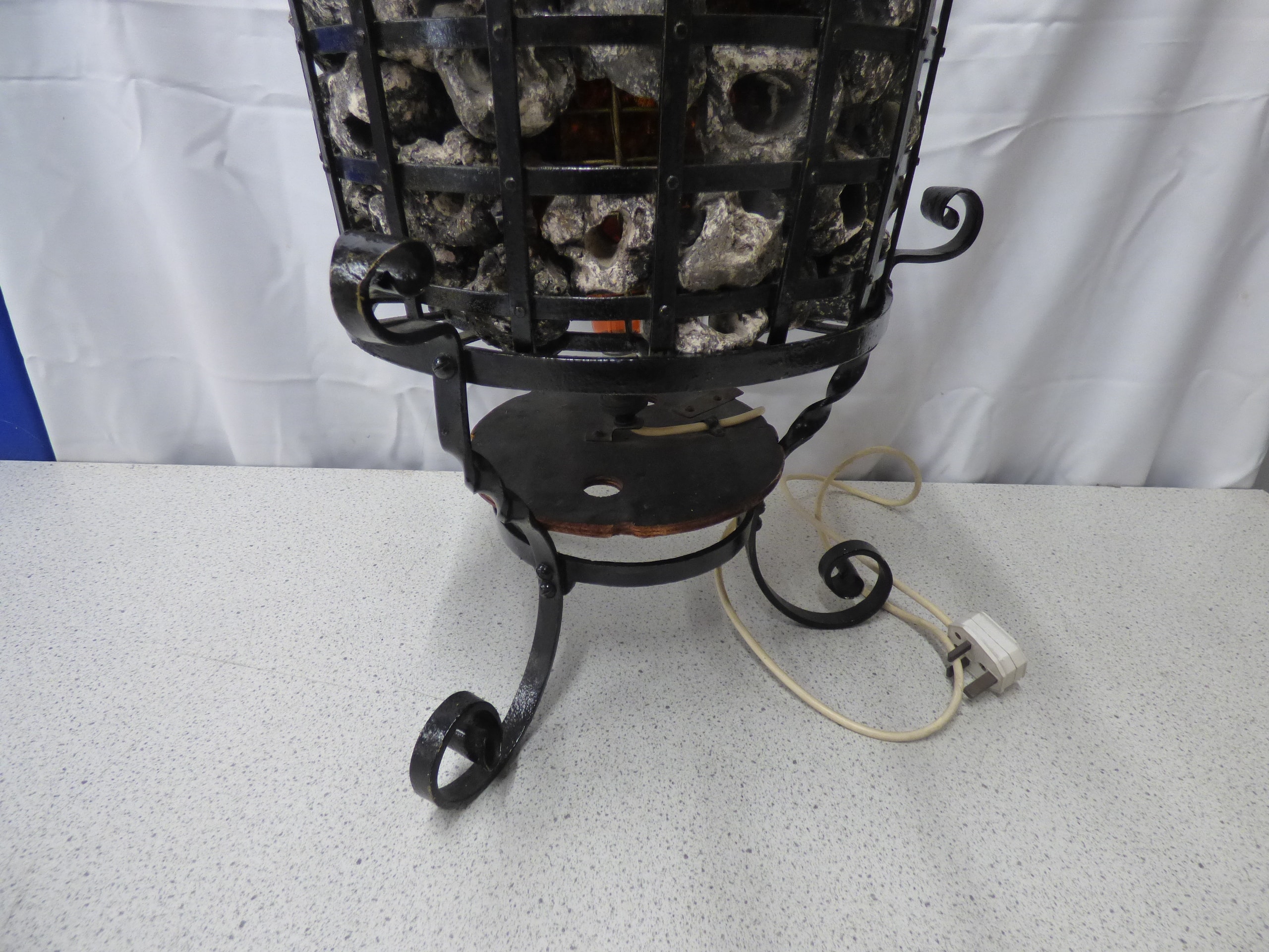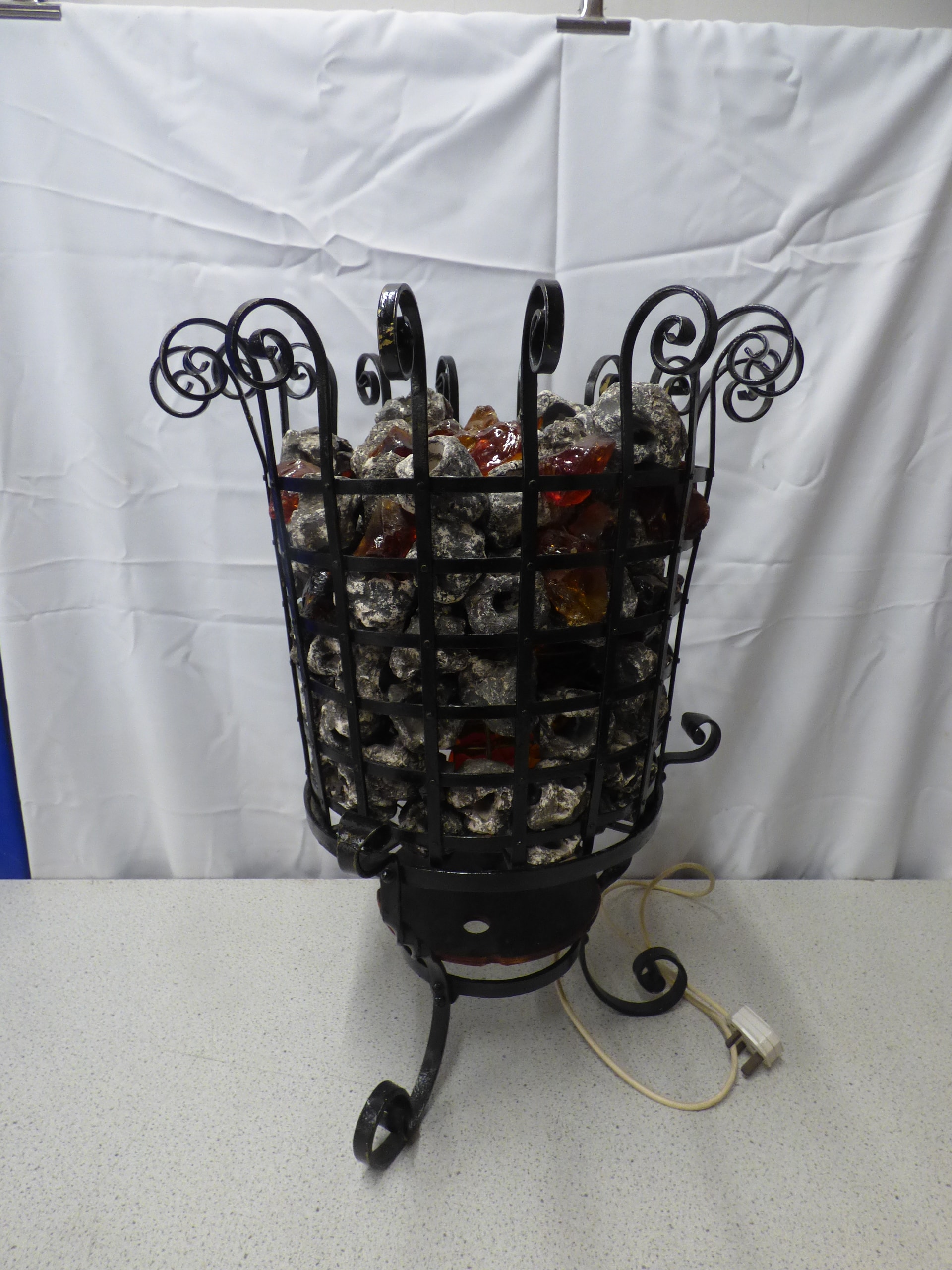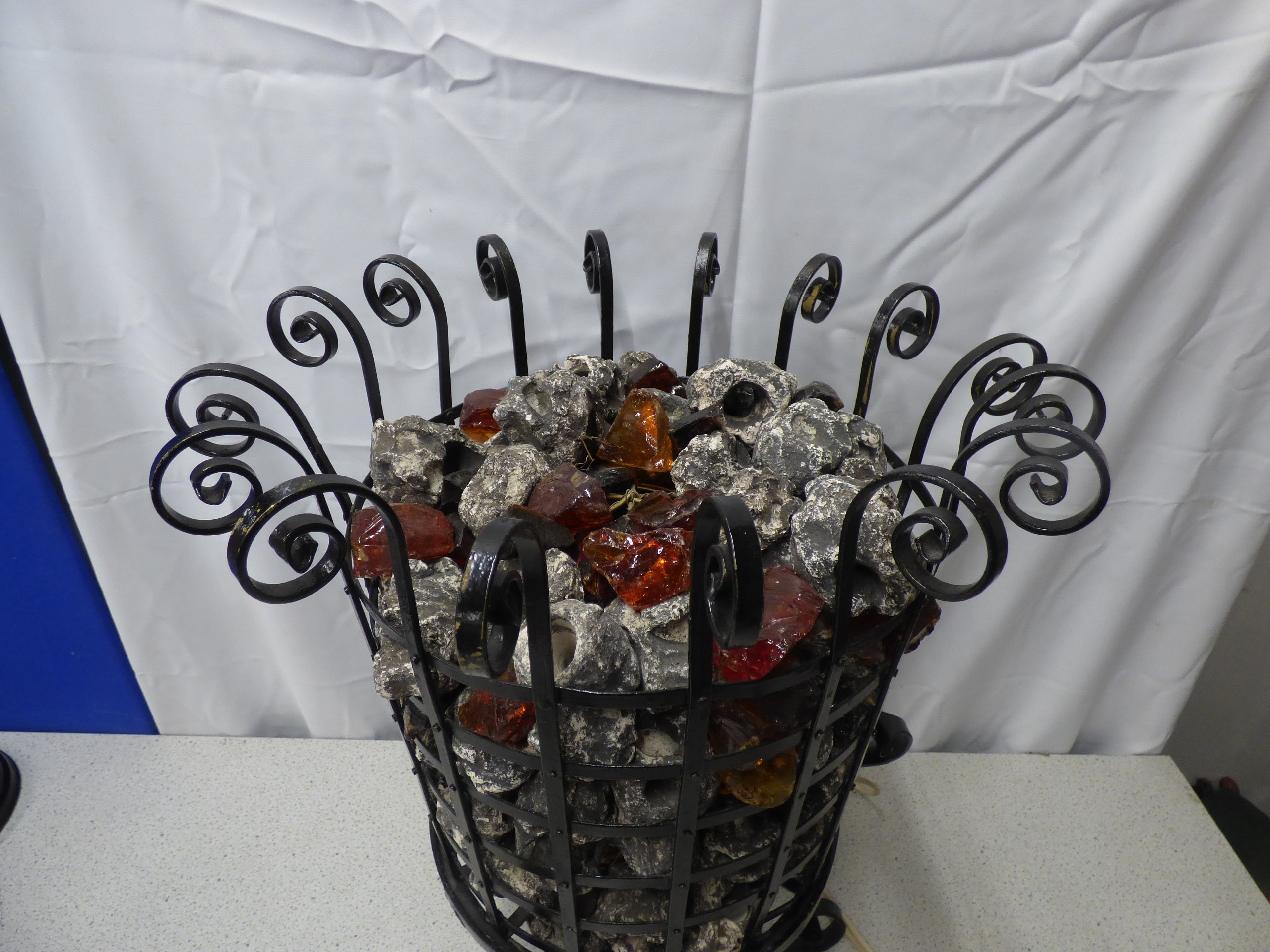 A black metal electric fireplace basket/heater, filled with grey faux rocks and amber/orange/red decorative glass pieces. 65cm Tall. Untested