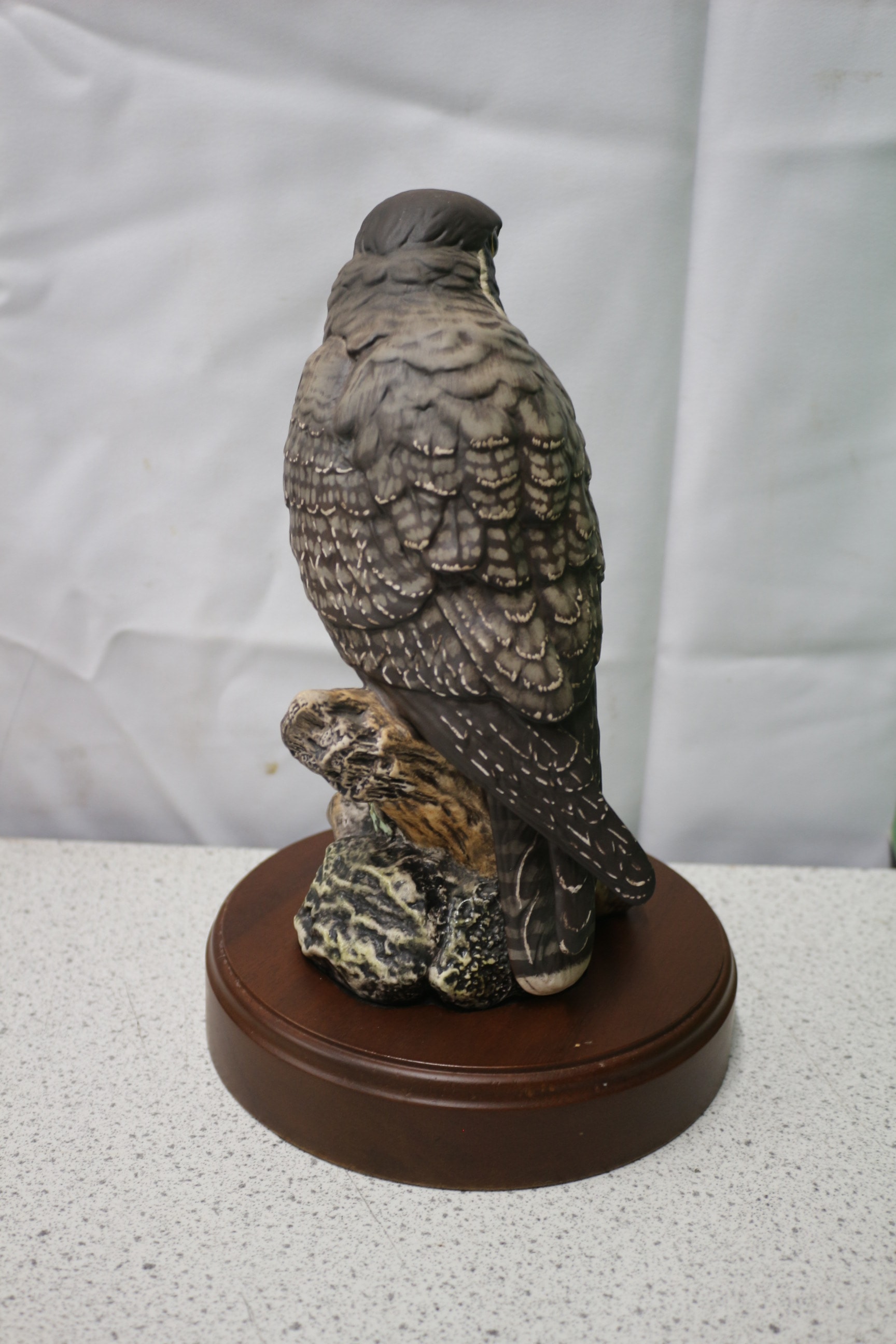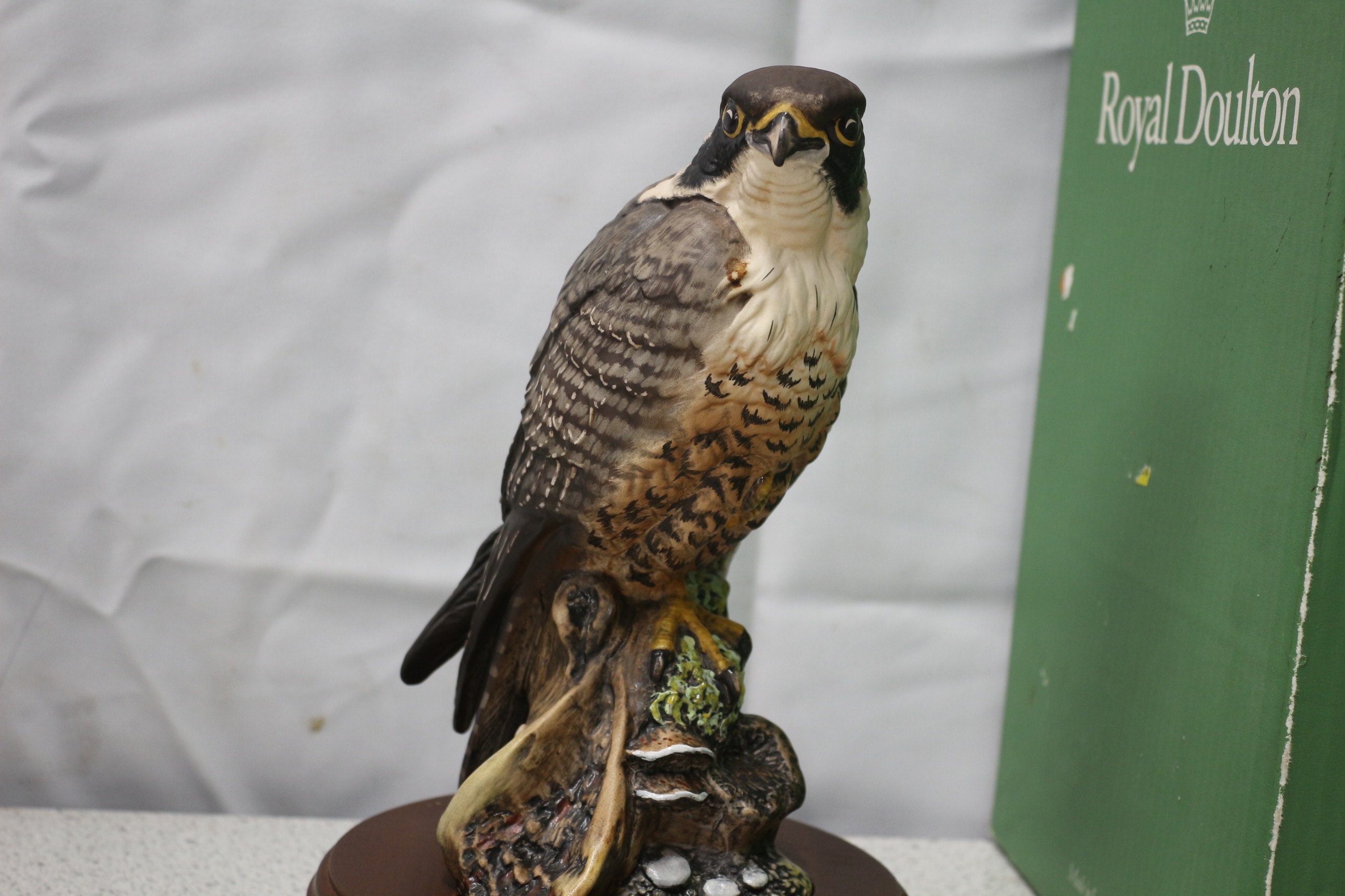 A multi-colored ceramic figurine of a Peregrine Falcon, labeled “Peregrine Falcon” and “FALCO PEREGRINUS”, on a dark brown wooden base, accompanied by its green Royal Doulton box.