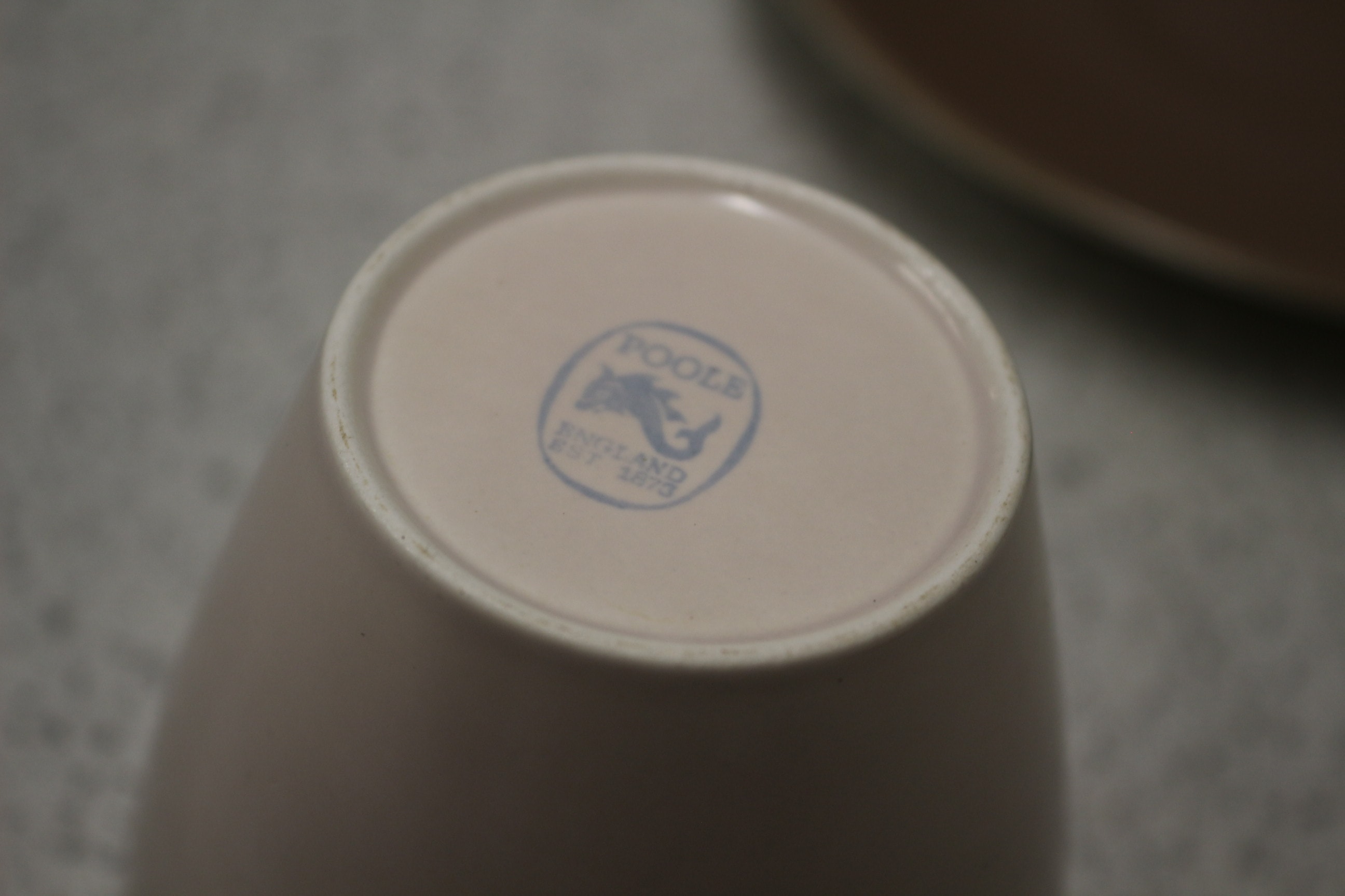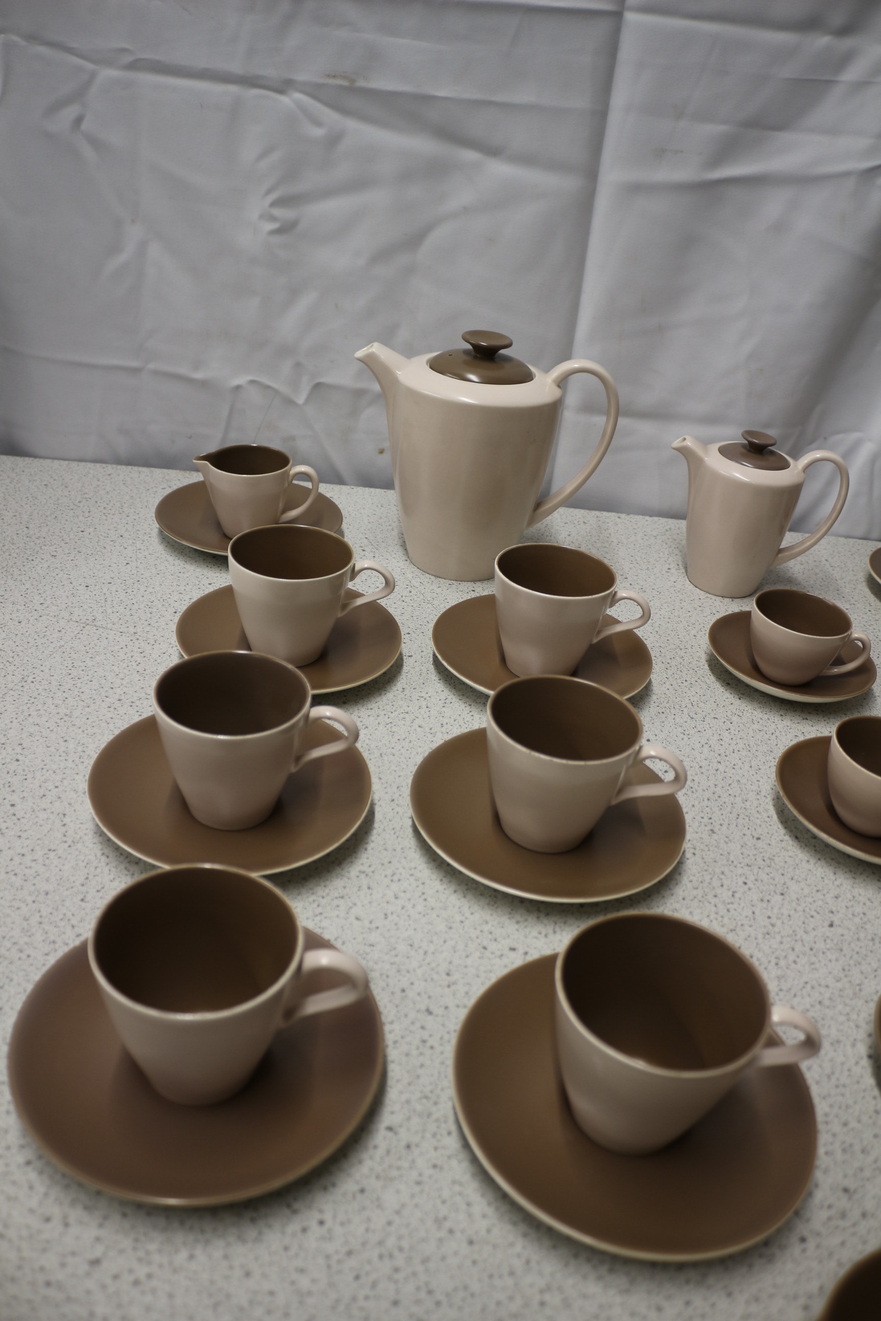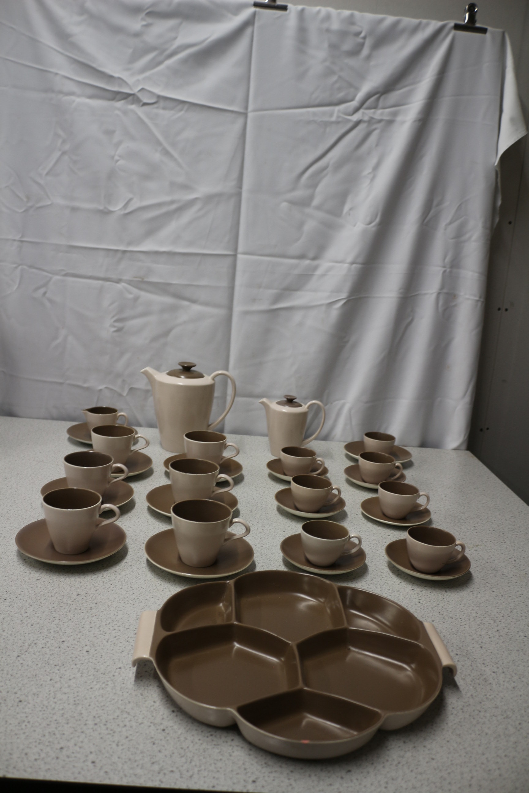 The lot consists of two two-tone light brown and dark brown teapots with lids, two-tone light brown and dark brown cups, dark brown saucers, and one two-tone light brown and dark brown segmented serving platter, all marked “POOLE ENGLAND EST 1873” with a dolphin logo. AF