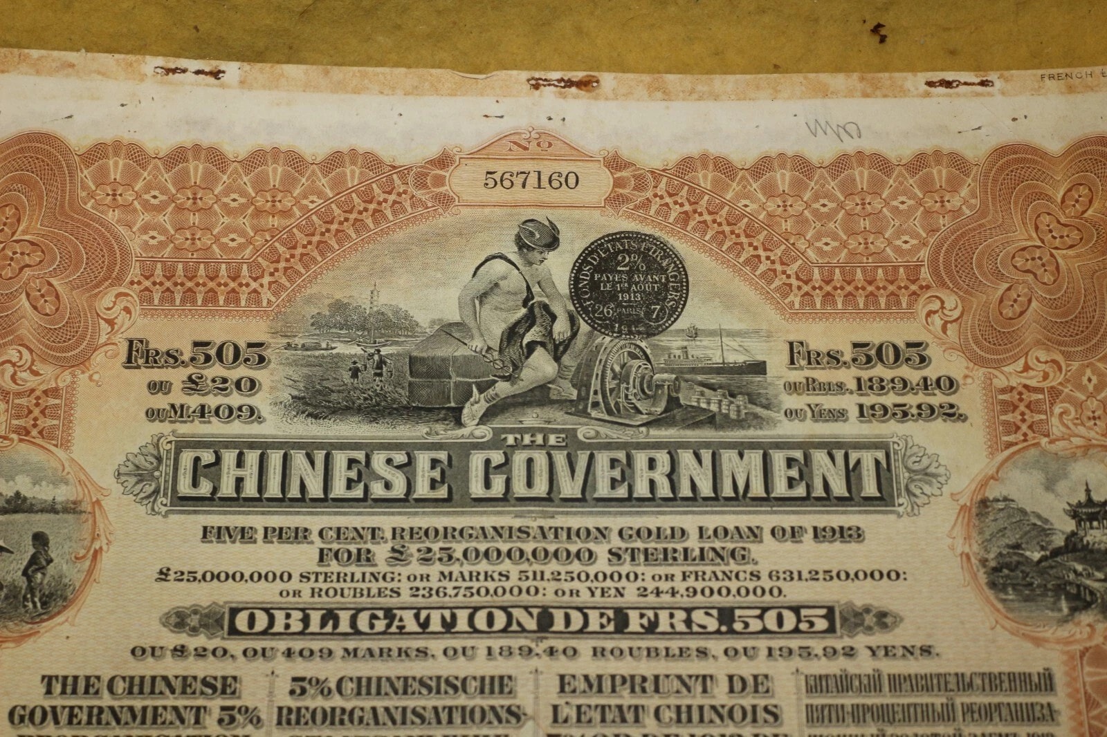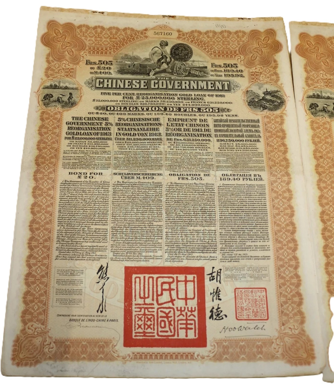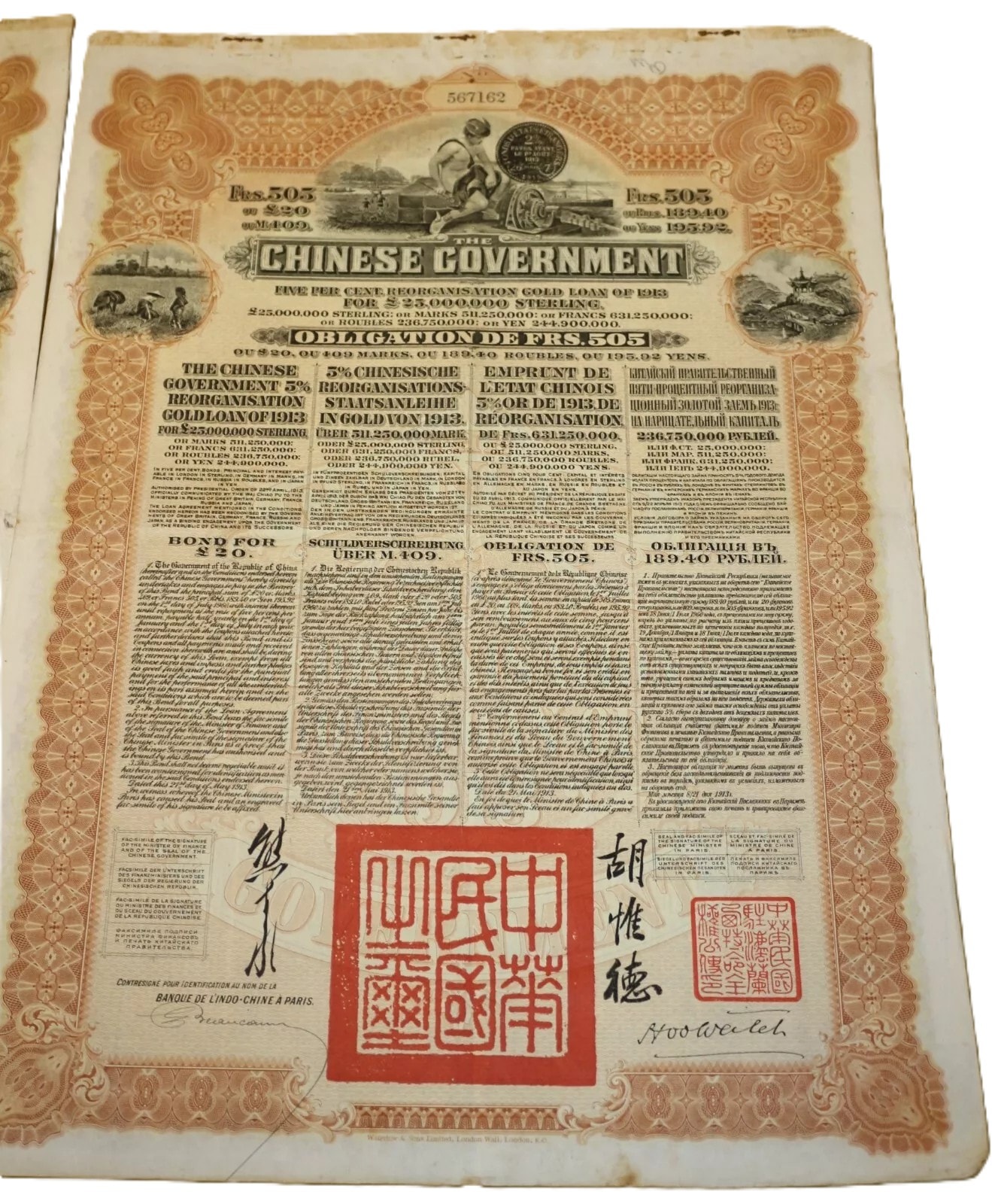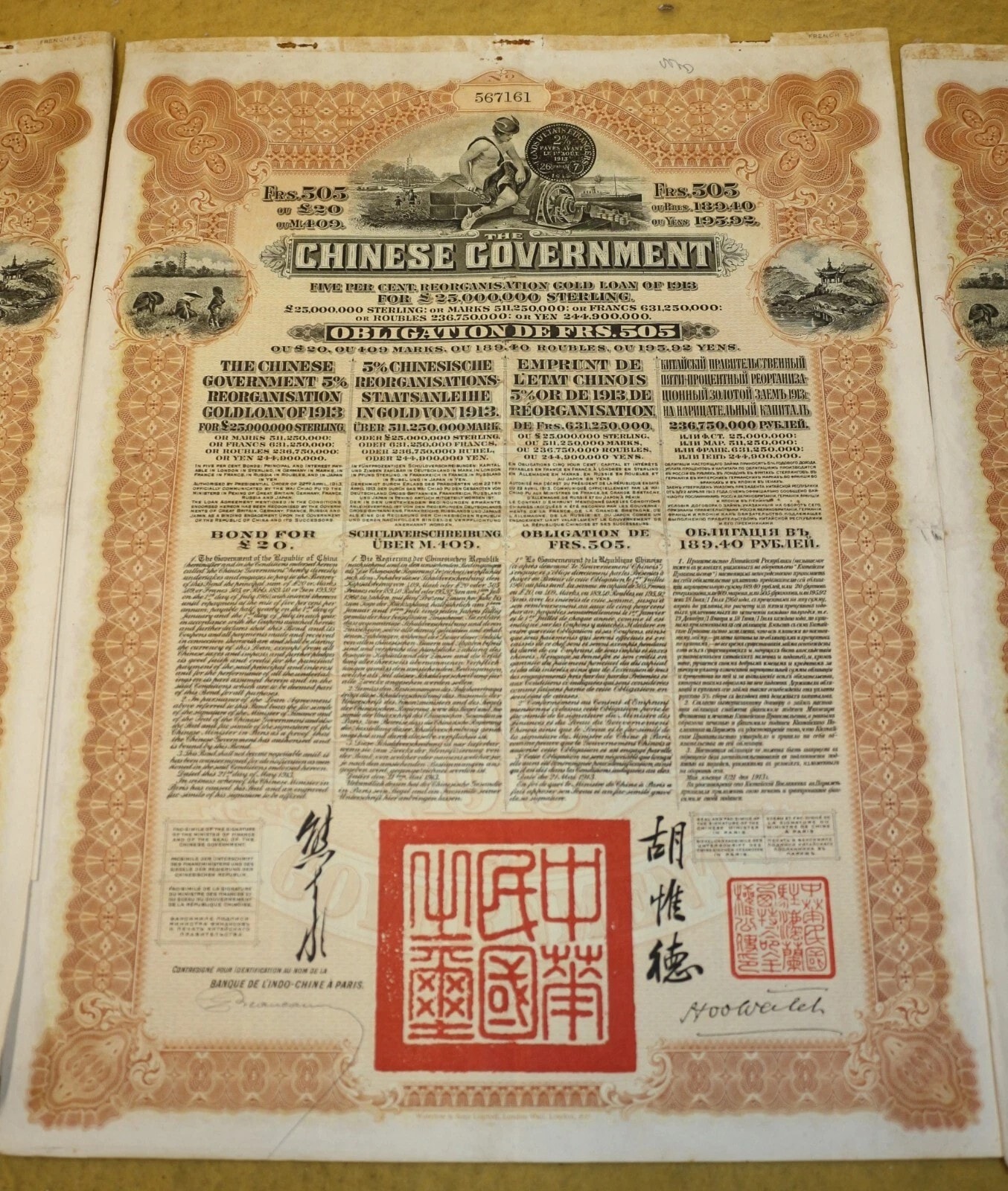 Three Chinese Government 5% Reorganisation Gold Loan of 1913 bonds, each valued at Frs. 505 (or equivalents in Sterling, Marks, Roubles, and Yen). The lot includes three sheets of corresponding, unsevered interest coupons. Printed on paper, the bonds feature an elaborate design with a central allegorical vignette and Chinese landscape scenes. They bear serial numbers 567160, 567161, and 567162. The documents are multilingual, presenting text in English, German, French, and Russian, and are marked with prominent red seals featuring Chinese characters, notably “中華民國之寶” (Seal of the Republic of China). Issued in 1913.