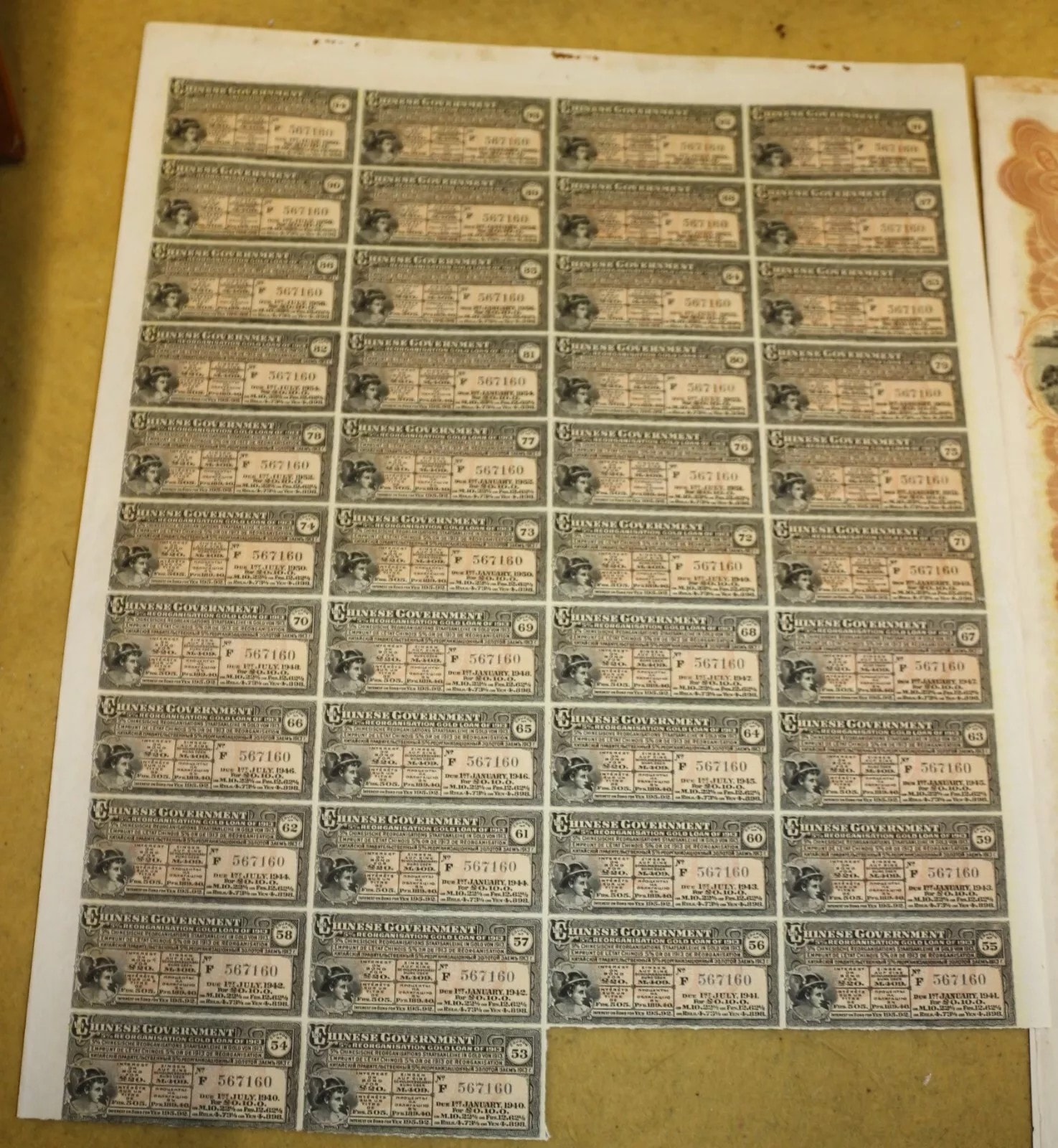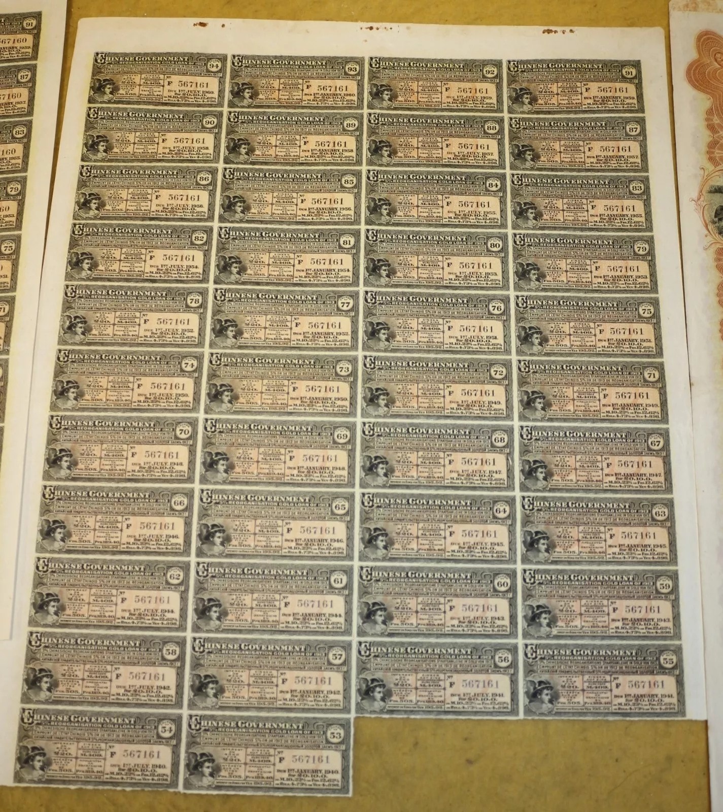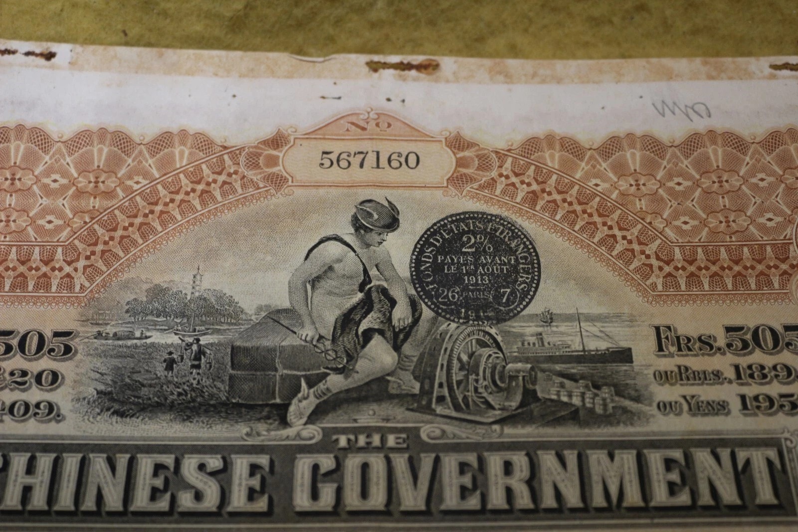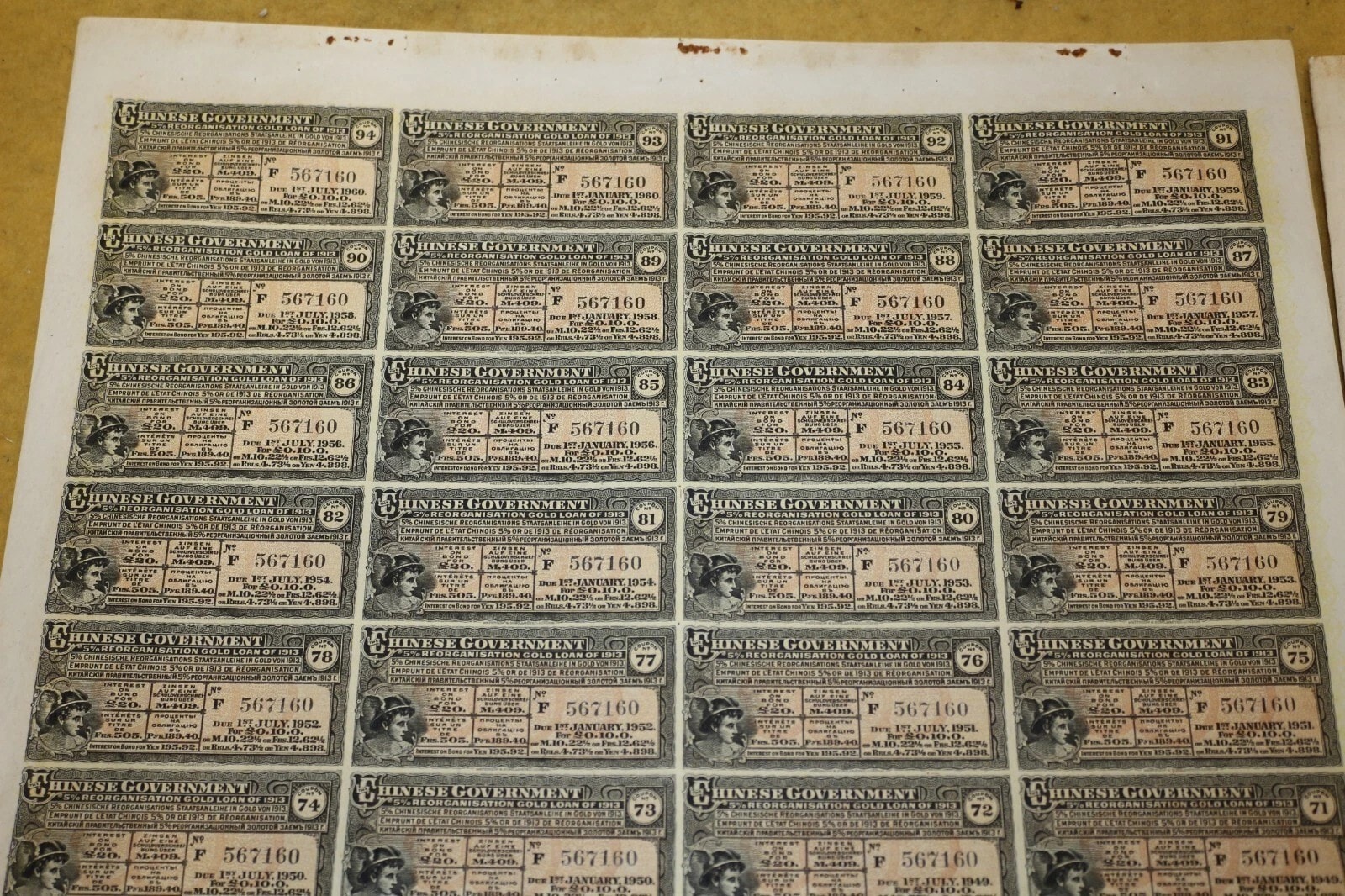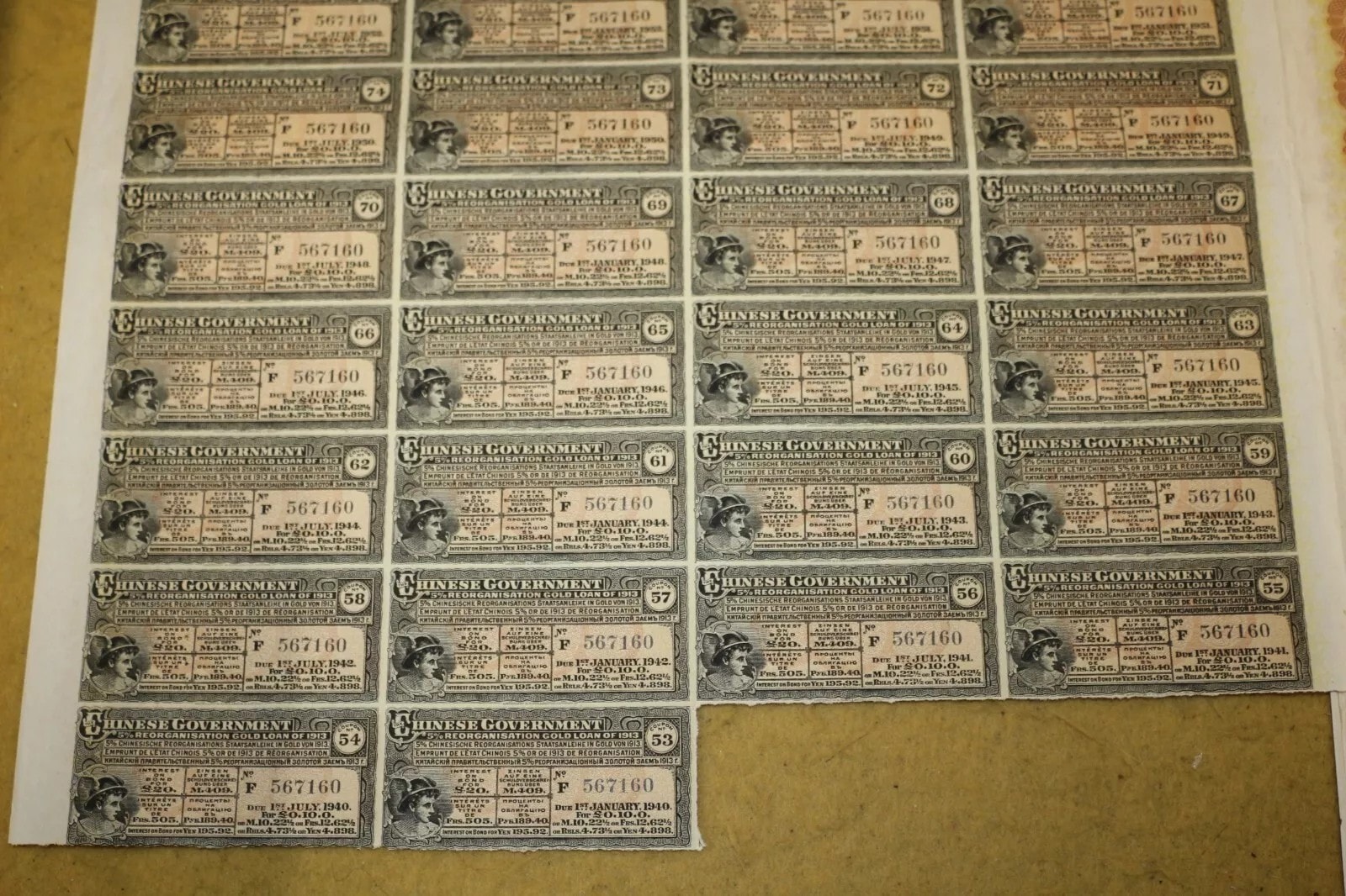 Three Chinese Government 5% Reorganisation Gold Loan of 1913 bonds, each valued at Frs. 505 (or equivalents in Sterling, Marks, Roubles, and Yen). The lot includes three sheets of corresponding, unsevered interest coupons. Printed on paper, the bonds feature an elaborate design with a central allegorical vignette and Chinese landscape scenes. They bear serial numbers 567160, 567161, and 567162. The documents are multilingual, presenting text in English, German, French, and Russian, and are marked with prominent red seals featuring Chinese characters, notably “中華民國之寶” (Seal of the Republic of China). Issued in 1913.