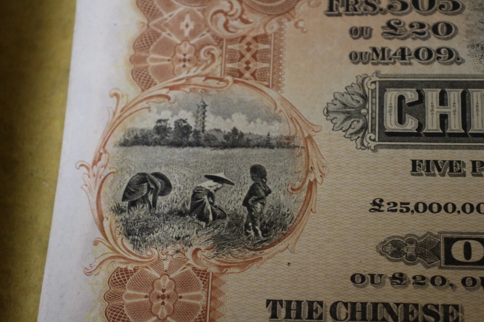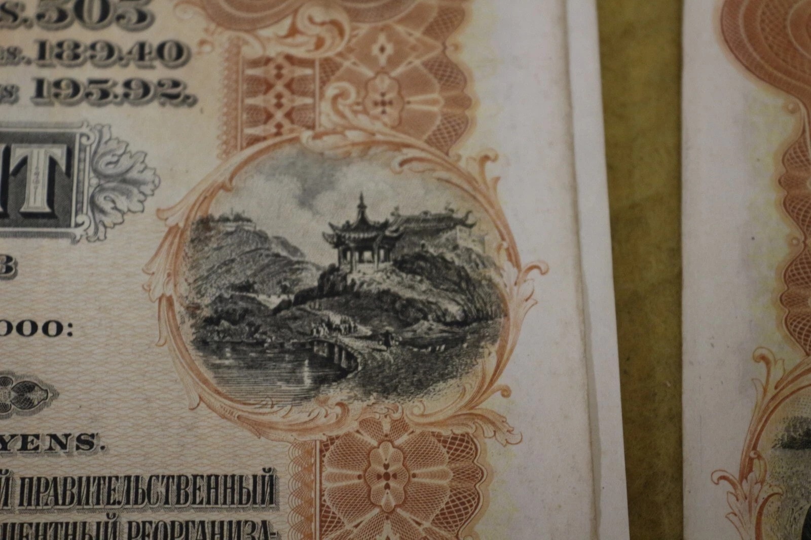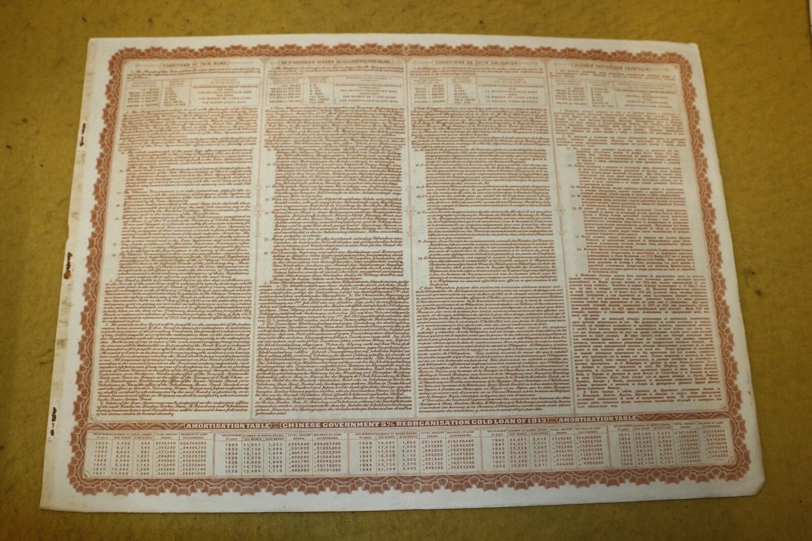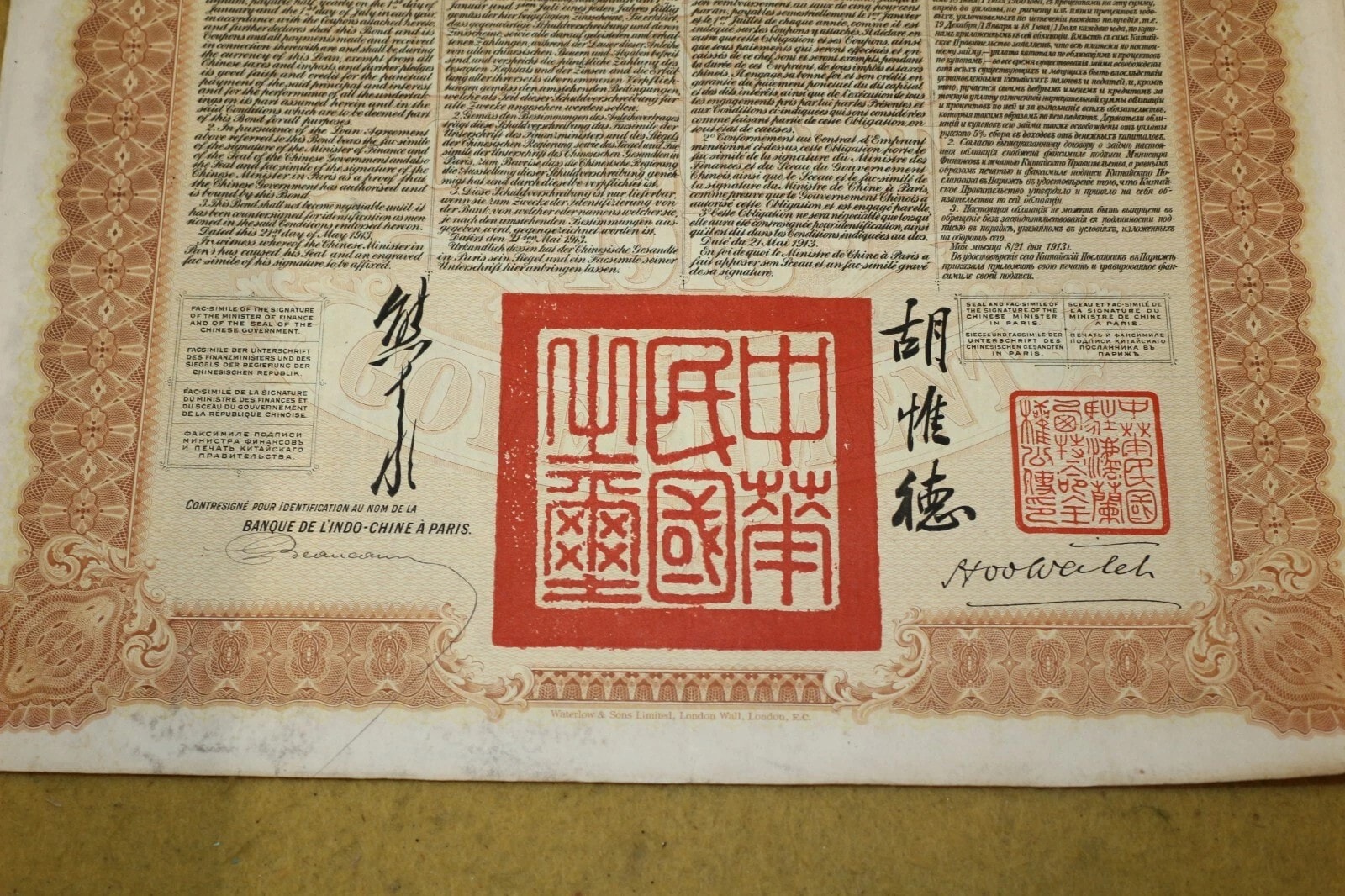 Three Chinese Government 5% Reorganisation Gold Loan of 1913 bonds, each valued at Frs. 505 (or equivalents in Sterling, Marks, Roubles, and Yen). The lot includes three sheets of corresponding, unsevered interest coupons. Printed on paper, the bonds feature an elaborate design with a central allegorical vignette and Chinese landscape scenes. They bear serial numbers 567160, 567161, and 567162. The documents are multilingual, presenting text in English, German, French, and Russian, and are marked with prominent red seals featuring Chinese characters, notably “中華民國之寶” (Seal of the Republic of China). Issued in 1913.