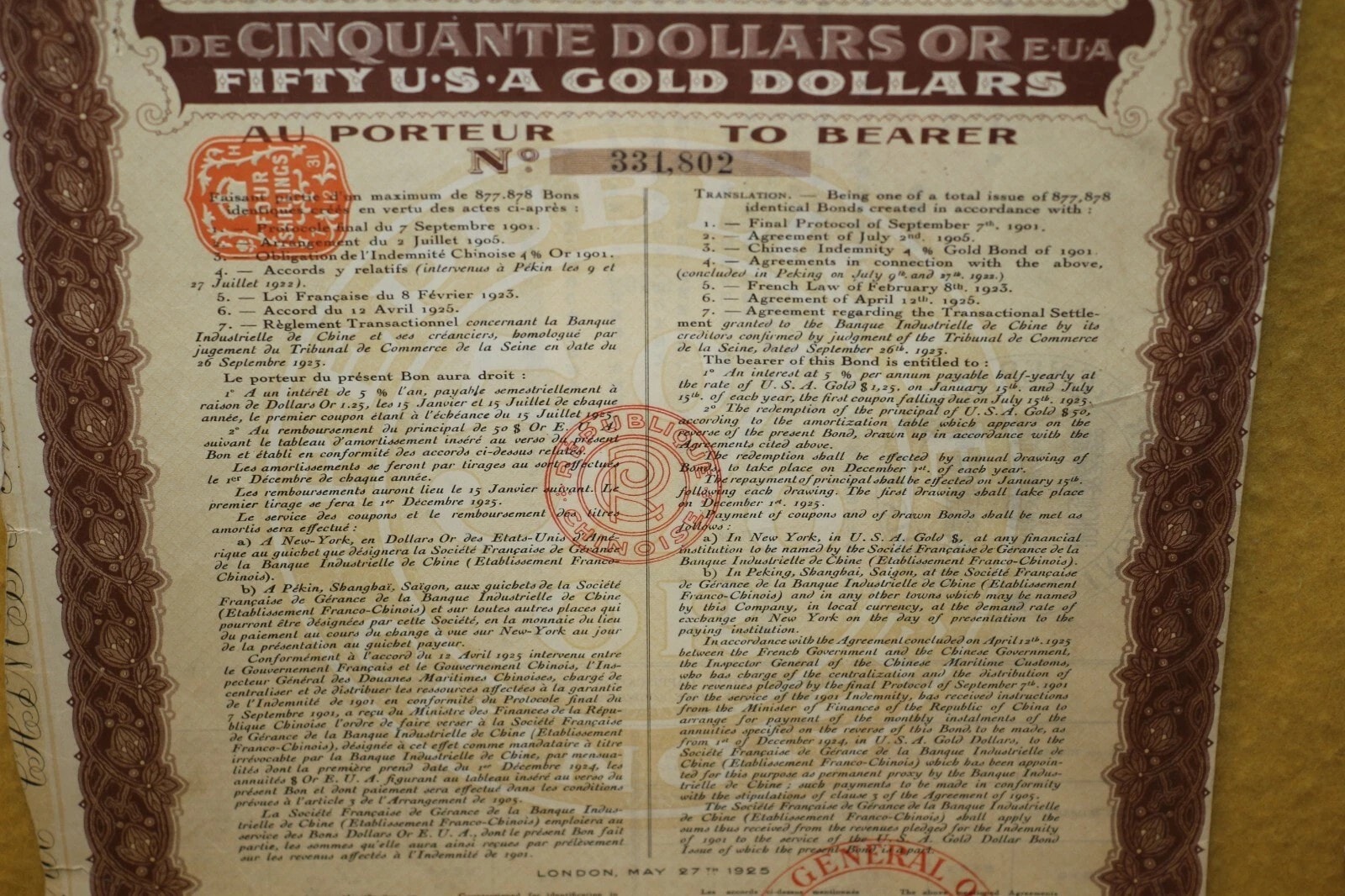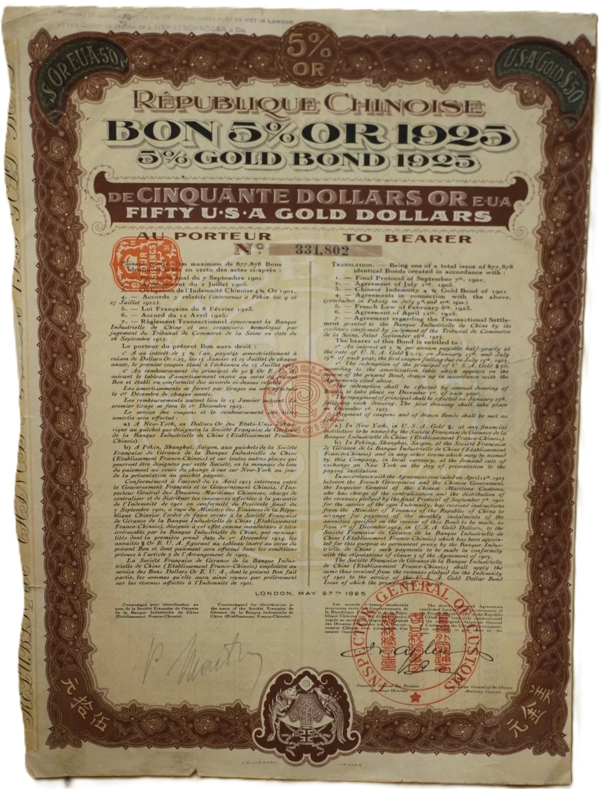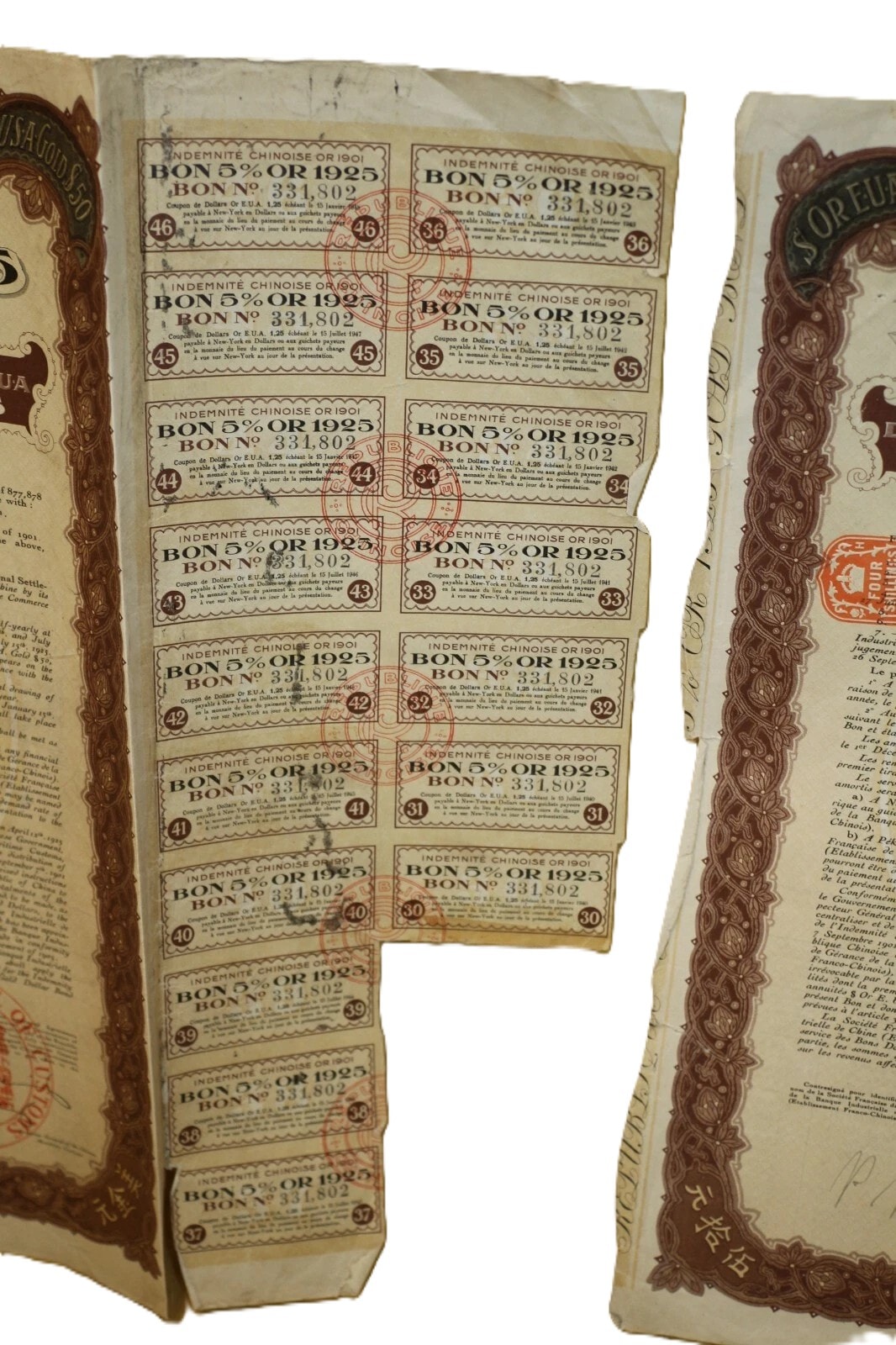 A pair of historical paper securities, specifically 5% Gold Bonds issued by the Chinese Republic (République Chinoise) on May 27, 1925, from London. Each bond is denominated for Fifty U.S.A. Gold Dollars (“DE CINQUANTE DOLLARS OR EUA / FIFTY U.S.A GOLD DOLLARS”) and issued “AU PORTEUR” (To Bearer). The documents feature decorative borders and extensive bilingual text in French and English detailing terms, alongside Chinese characters (“天陆伍拾元” and “陆伍拾元” confirming the “Fifty Yuan” denomination. Visible bond numbers are 331.802 and 331.806. Numerous red official stamps and seals are present, including those from the “GENERAL INSPECTORATE OF CUSTOMS” and “BUREAU GENERAL DES DOUANES MARITIMES CHINOISES.” Each main bond document includes a perforated sheet of detachable coupons, individually numbered and bearing the inscription “INDEMNITÉ CHINOISE OR 1901” (Chinese Indemnity Gold 1901), with payment dates extending into the 1940s, linking them to the Boxer Protocol indemnity payments. An additional document, an amortization table (“TABLEAU D’AMORTISSEMENT”), details repayment schedules.