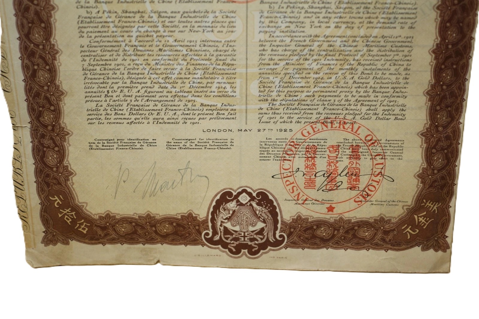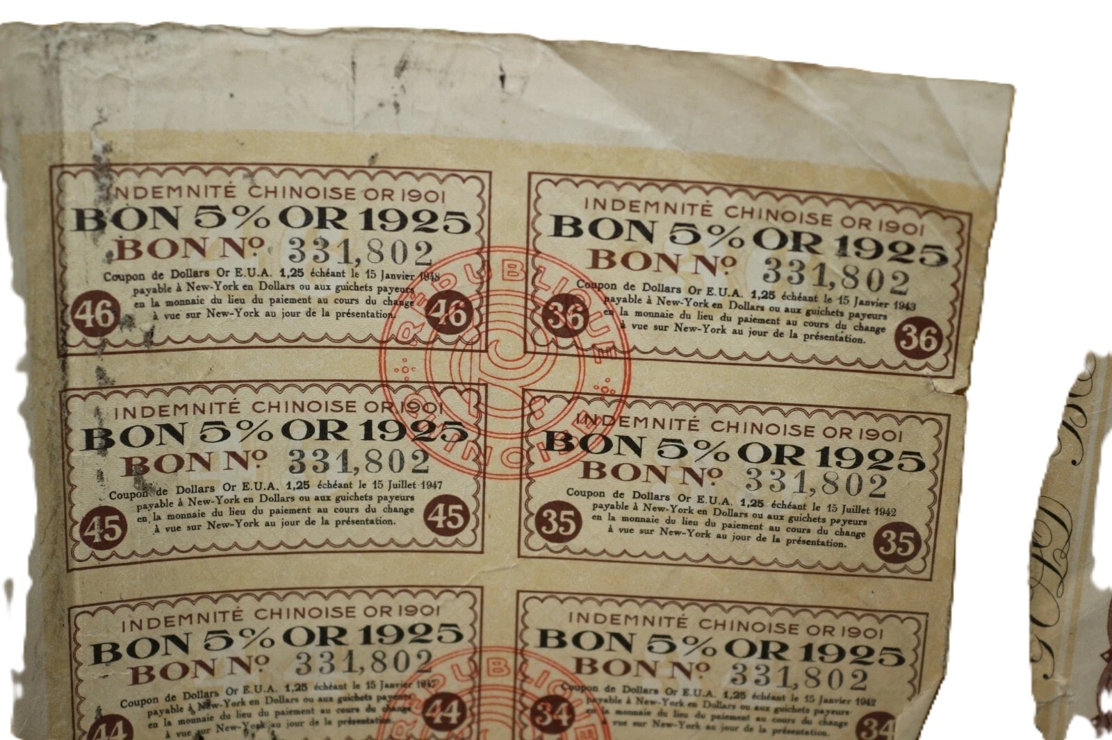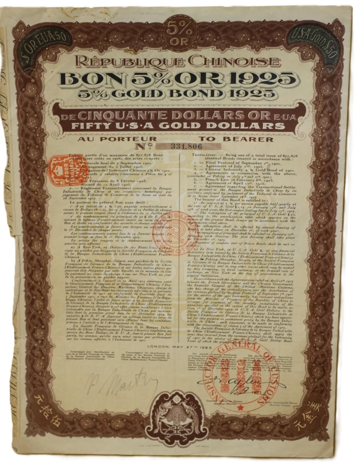 A pair of historical paper securities, specifically 5% Gold Bonds issued by the Chinese Republic (République Chinoise) on May 27, 1925, from London. Each bond is denominated for Fifty U.S.A. Gold Dollars (“DE CINQUANTE DOLLARS OR EUA / FIFTY U.S.A GOLD DOLLARS”) and issued “AU PORTEUR” (To Bearer). The documents feature decorative borders and extensive bilingual text in French and English detailing terms, alongside Chinese characters (“天陆伍拾元” and “陆伍拾元” confirming the “Fifty Yuan” denomination. Visible bond numbers are 331.802 and 331.806. Numerous red official stamps and seals are present, including those from the “GENERAL INSPECTORATE OF CUSTOMS” and “BUREAU GENERAL DES DOUANES MARITIMES CHINOISES.” Each main bond document includes a perforated sheet of detachable coupons, individually numbered and bearing the inscription “INDEMNITÉ CHINOISE OR 1901” (Chinese Indemnity Gold 1901), with payment dates extending into the 1940s, linking them to the Boxer Protocol indemnity payments. An additional document, an amortization table (“TABLEAU D’AMORTISSEMENT”), details repayment schedules.
