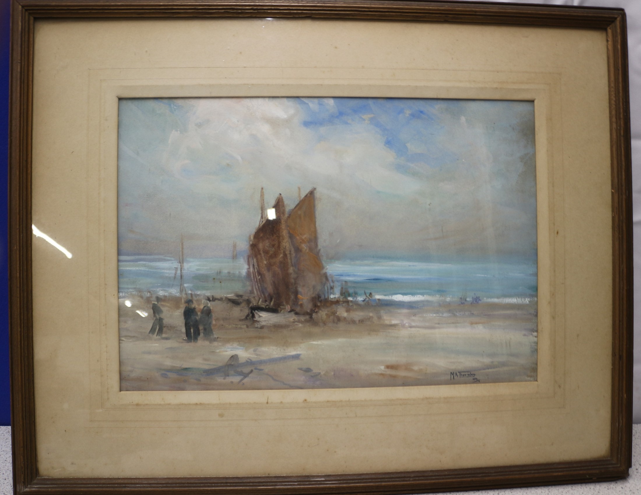 This framed watercolour painting depicts a bustling coastal seascape scene. The artwork features two prominent masted boats with sails on a sandy beach, accompanied by several figures, with breaking waves and a partly cloudy sky in the background. Rendered in a traditional seascape style, it is signed “M.A. Thornley.” in the lower right corner, with the additional marking “NSA” visible beneath the signature. The painting is presented under glass within an off-white mat, all contained within a simple wooden frame. 60x76cm