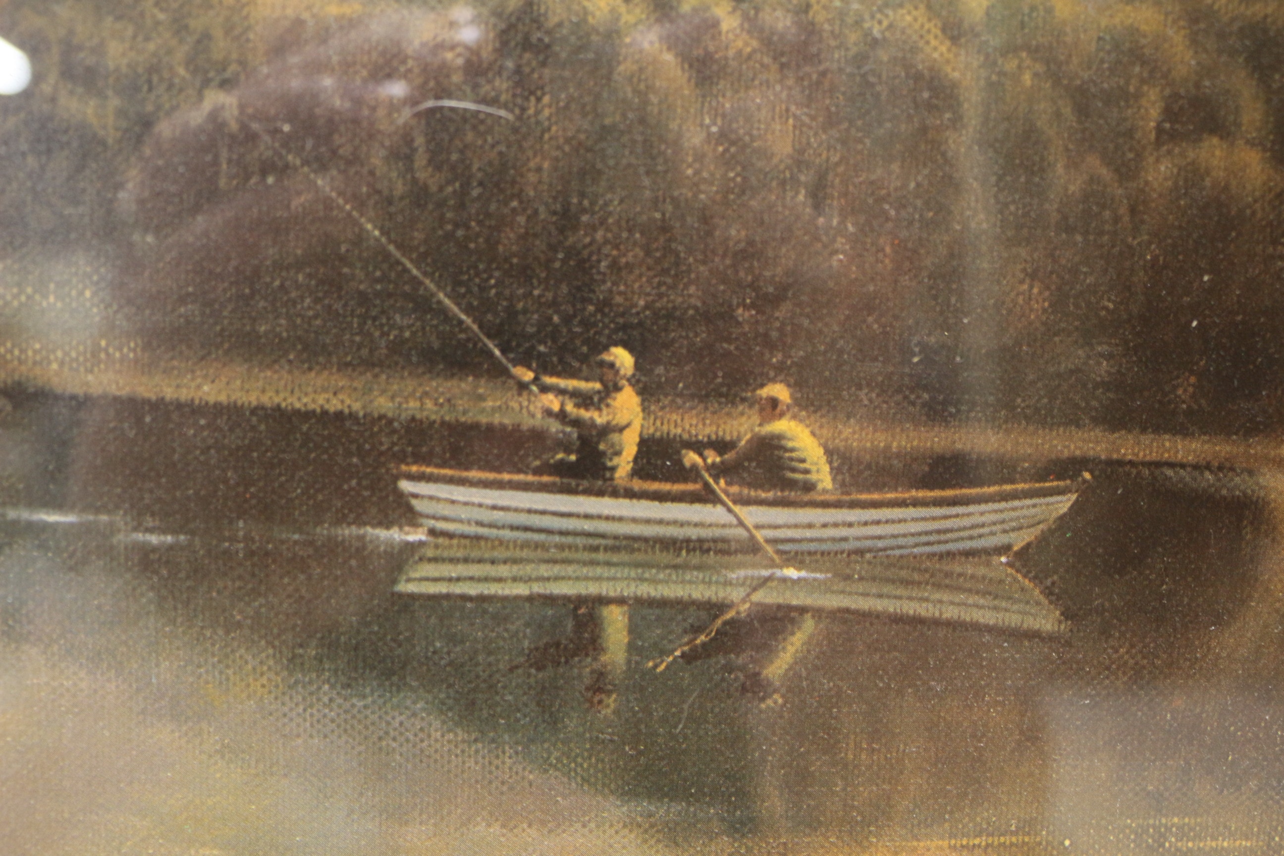 A framed print, likely a reproduction on textured paper, depicting a realistic landscape scene. The artwork portrays a serene lake or river at sunset or sunrise, with mountains in the background, forested banks, and two figures fishing from a small boat in the foreground. Warm yellow and orange tones dominate the sky and water. The print is protected under glass and housed within a gold-finished wooden frame with a light-coloured mat. A signature “COULSON” is visible in black script in the lower left corner of the image. 75.5×56.5cm