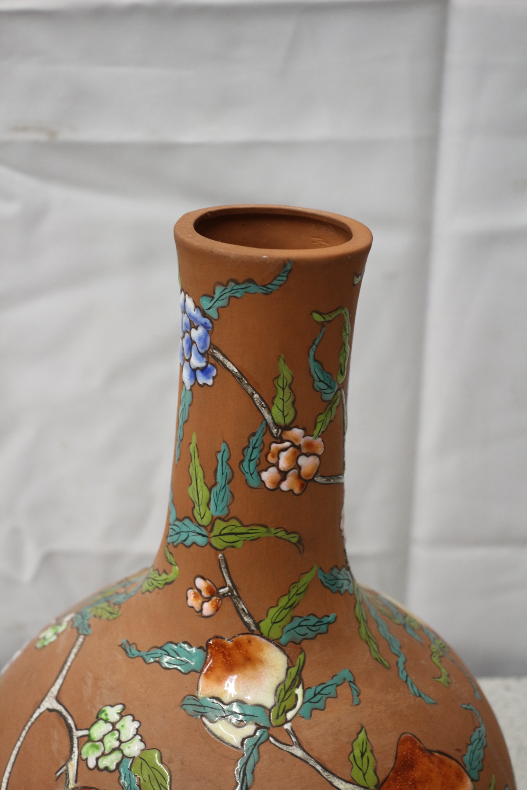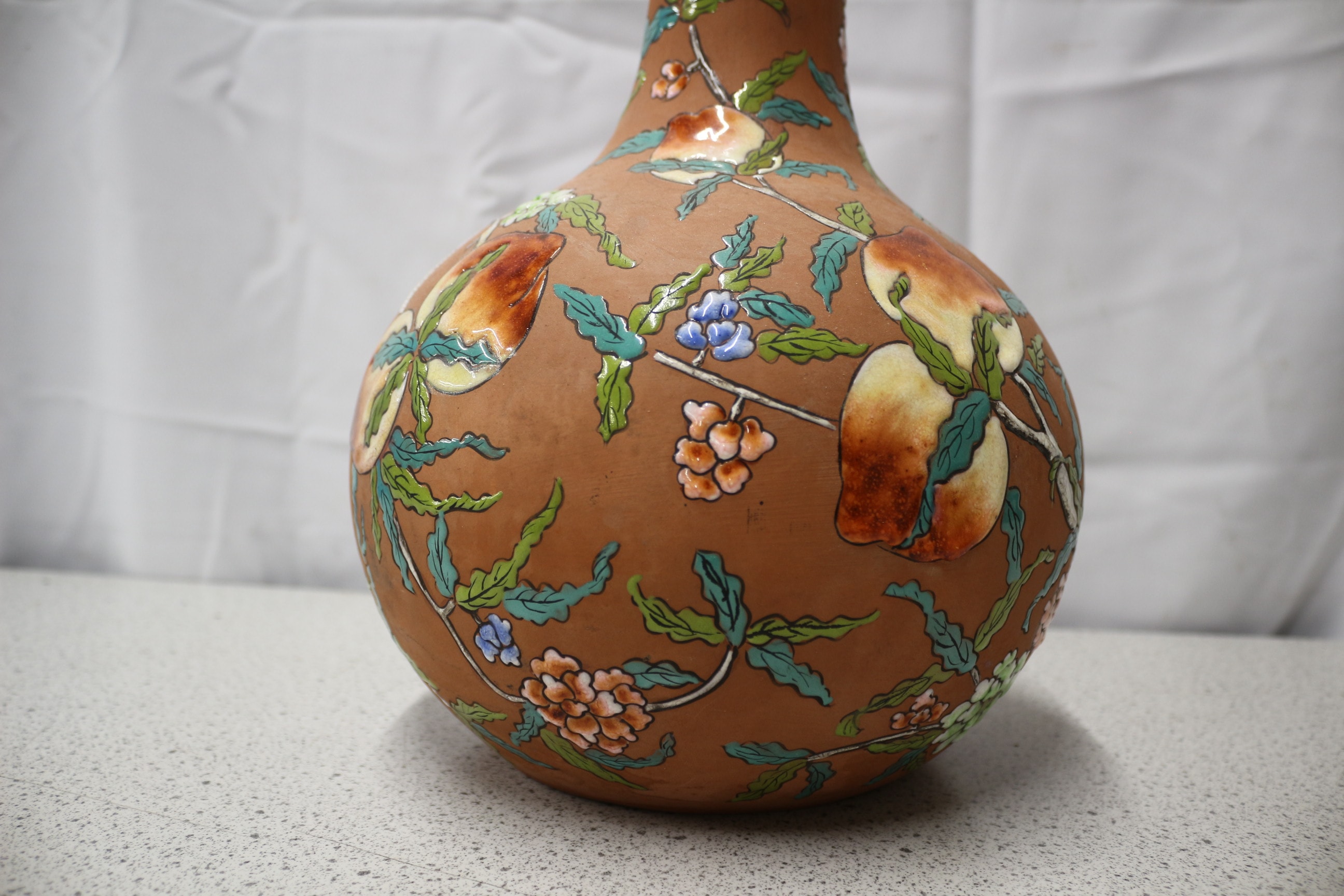This globular Yixing vase features a tapering neck, crafted from a reddish-brown, unglazed terracotta body. The surface is extensively decorated with a vibrant, slightly raised enamel or painted design, characteristic of an East Asian aesthetic. The decoration depicts flowering branches bearing large, ripened fruit, likely peaches or quinces, alongside various blossoms in tones of blue, orange, green, and white. The glossy finish of the decoration contrasts with the matte ground. On the underside, handwritten marks ’45’, ‘L.S’ (or ‘L.5’), and a single ‘5’ are visible. 35cm Tall