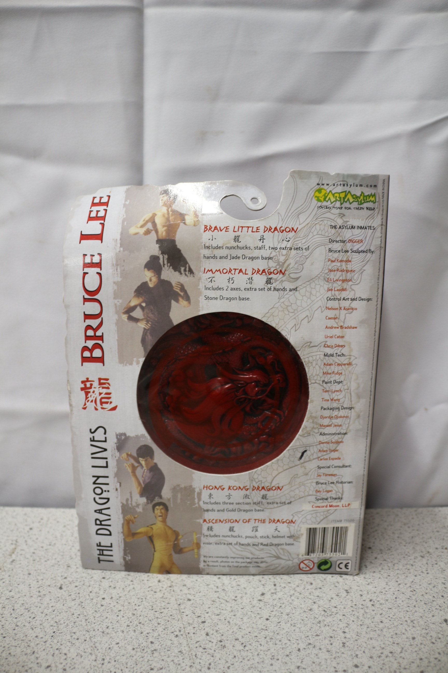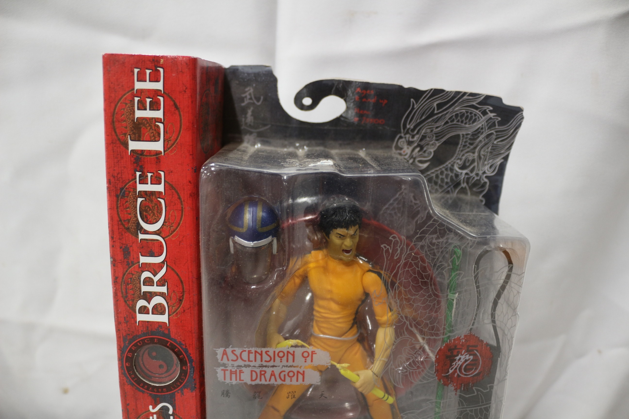 An Art Asylum ‘The Dragon Lives: Ascension of the Dragon’ articulated plastic action figure, dated 2001. The figure, depicting Bruce Lee in a yellow jumpsuit and holding nunchucks, is still sealed within its original blister packaging. It is accompanied by additional accessories including a nunchucks & pouch, stick, helmet with visor, extra hands, and a Red Dragon base. The packaging prominently features “BRUCE LEE” and “THE DRAGON LIVES” text, alongside “ASCENSION OF THE DRAGON” and a list of contents. Visible Chinese characters include “武道” (Martial Arts) and stylized “龍” (Dragon), with further Chinese text translating to “Immortal Dragon” (不朽龍) and “Eastern Martial Dragon” (東方武龍) on the reverse, which also showcases other figures in the series.