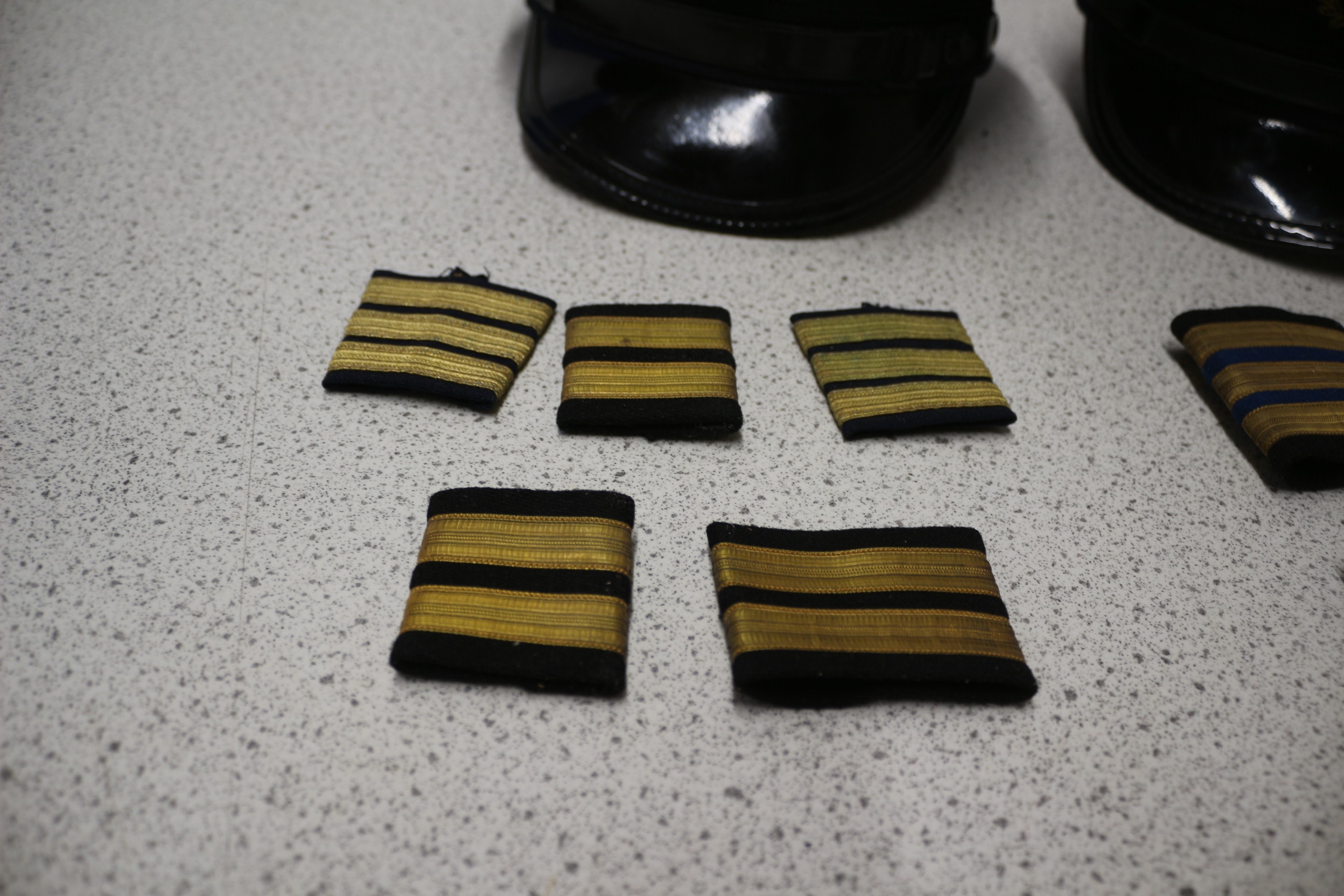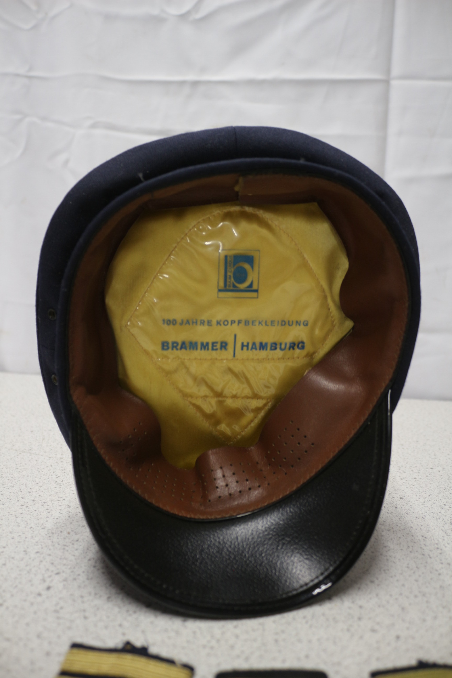 Two dark blue pilot’s caps with black brims and gold-embroidered winged emblems featuring a Lufthansa-style logo, one cap having an interior label reading ‘BRAMMER | HAMBURG’, along with eight black shoulder boards, five having gold stripes and three having gold and blue stripes.