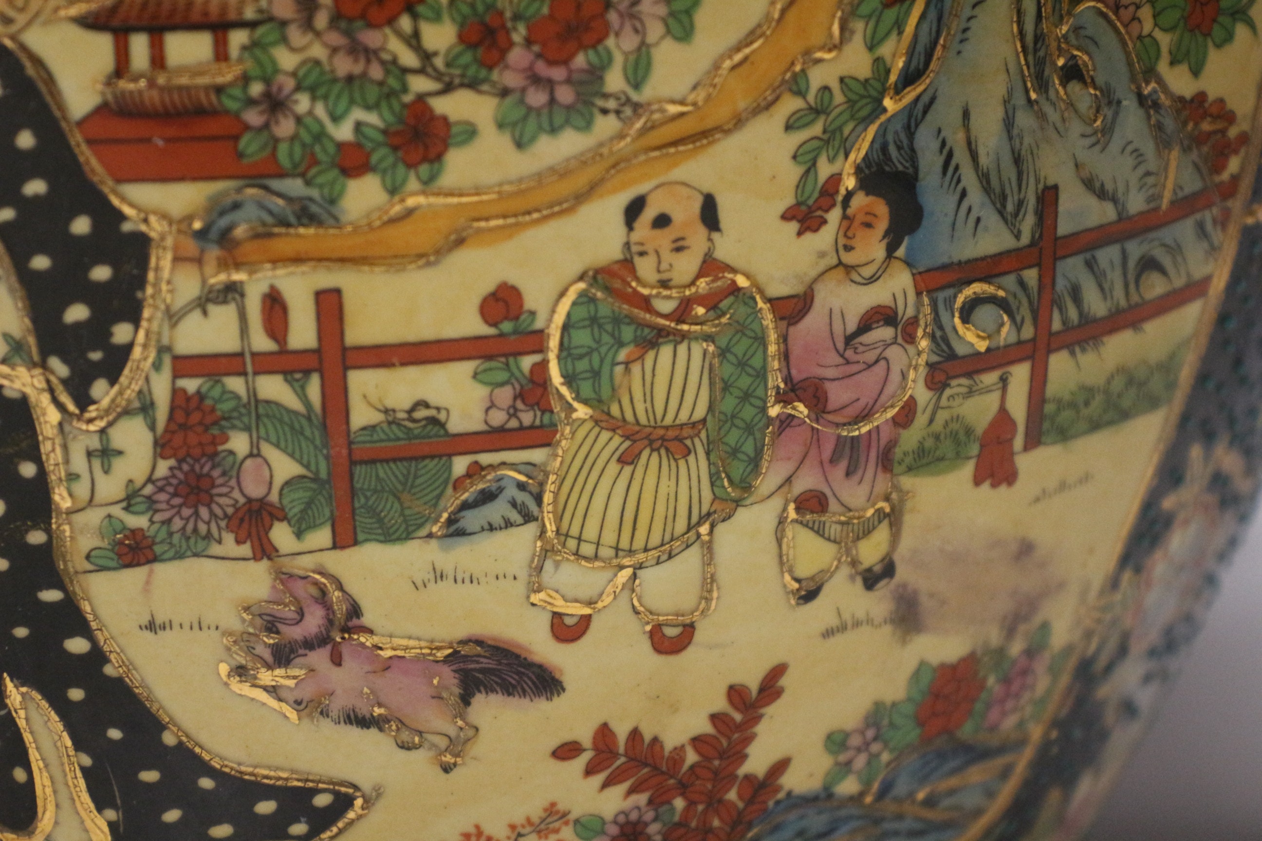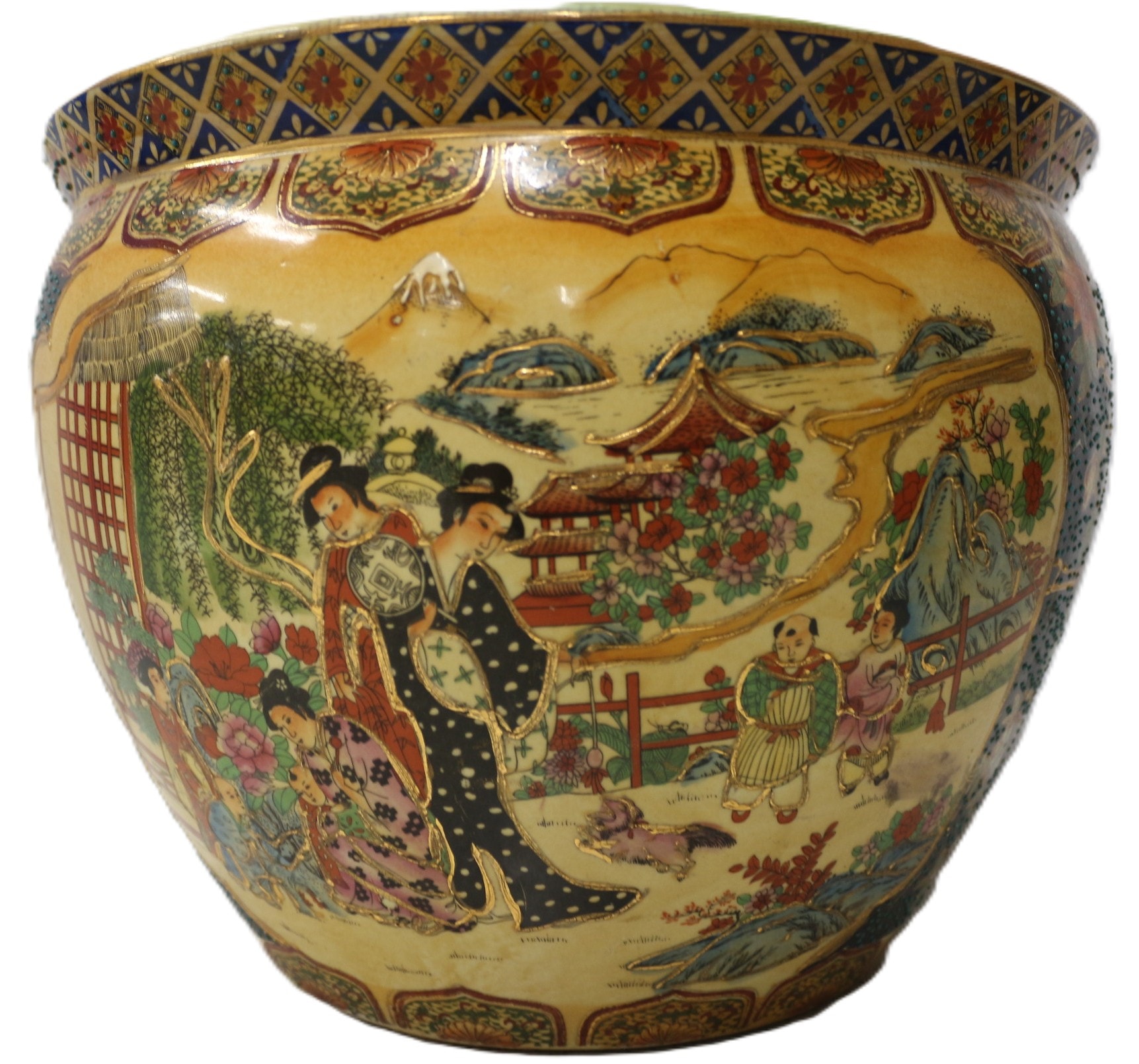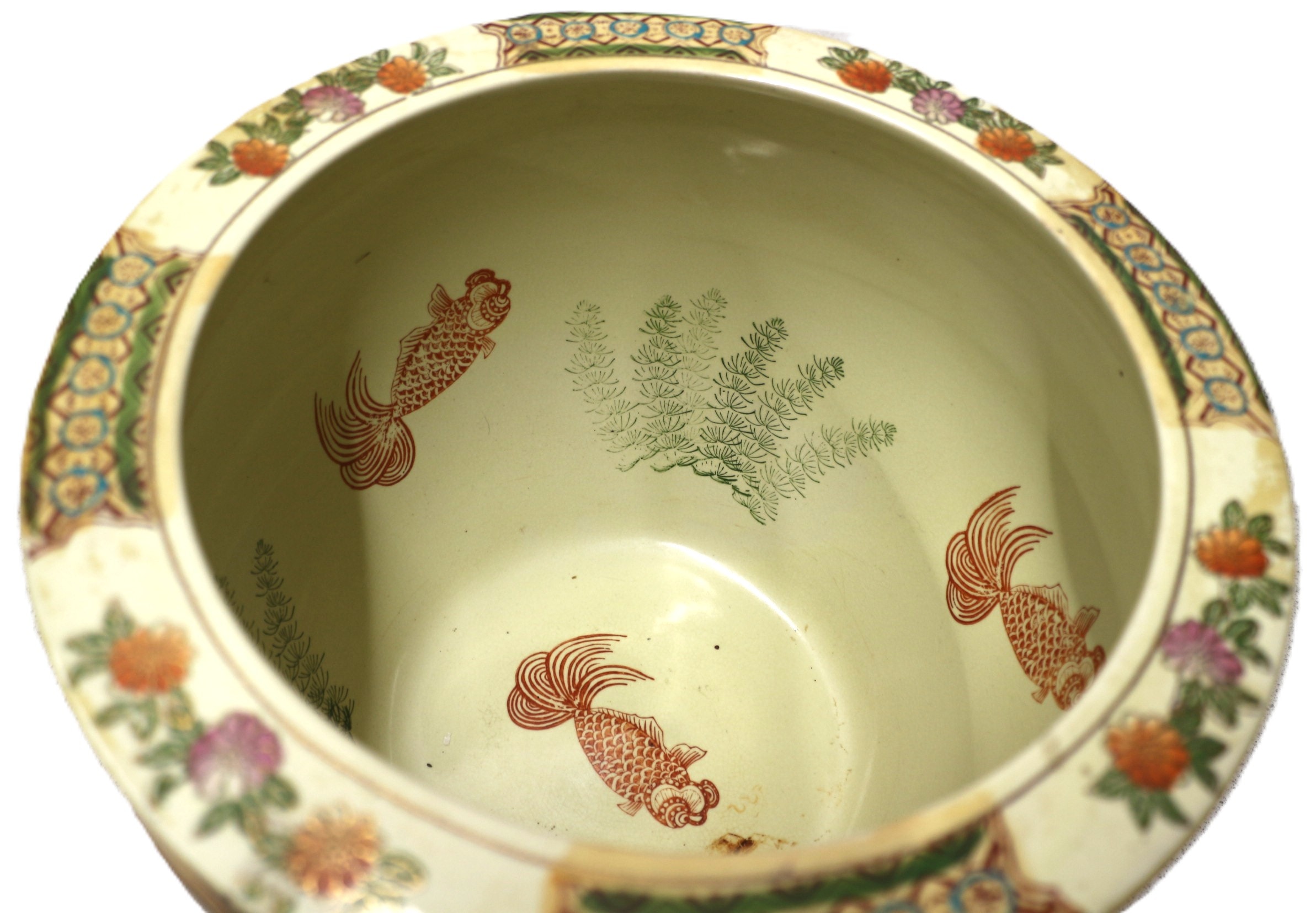 A large Chinese porcelain fish bowl or planter with oriental decorations, dating to the 1960s. This polychrome enamelled ceramic piece features a vibrant decorative style with extensive use of gold accents. The exterior is primarily adorned with a continuous panoramic scene on a yellow ground, depicting figures in traditional attire within a landscape of pagodas, mountains, and lush flora. Intricate geometric and floral borders in blue, red, and gold frame the rim and base. The interior is decorated with red goldfish and green aquatic plants against an off-white, crackle-glazed ground. 24cm Tall