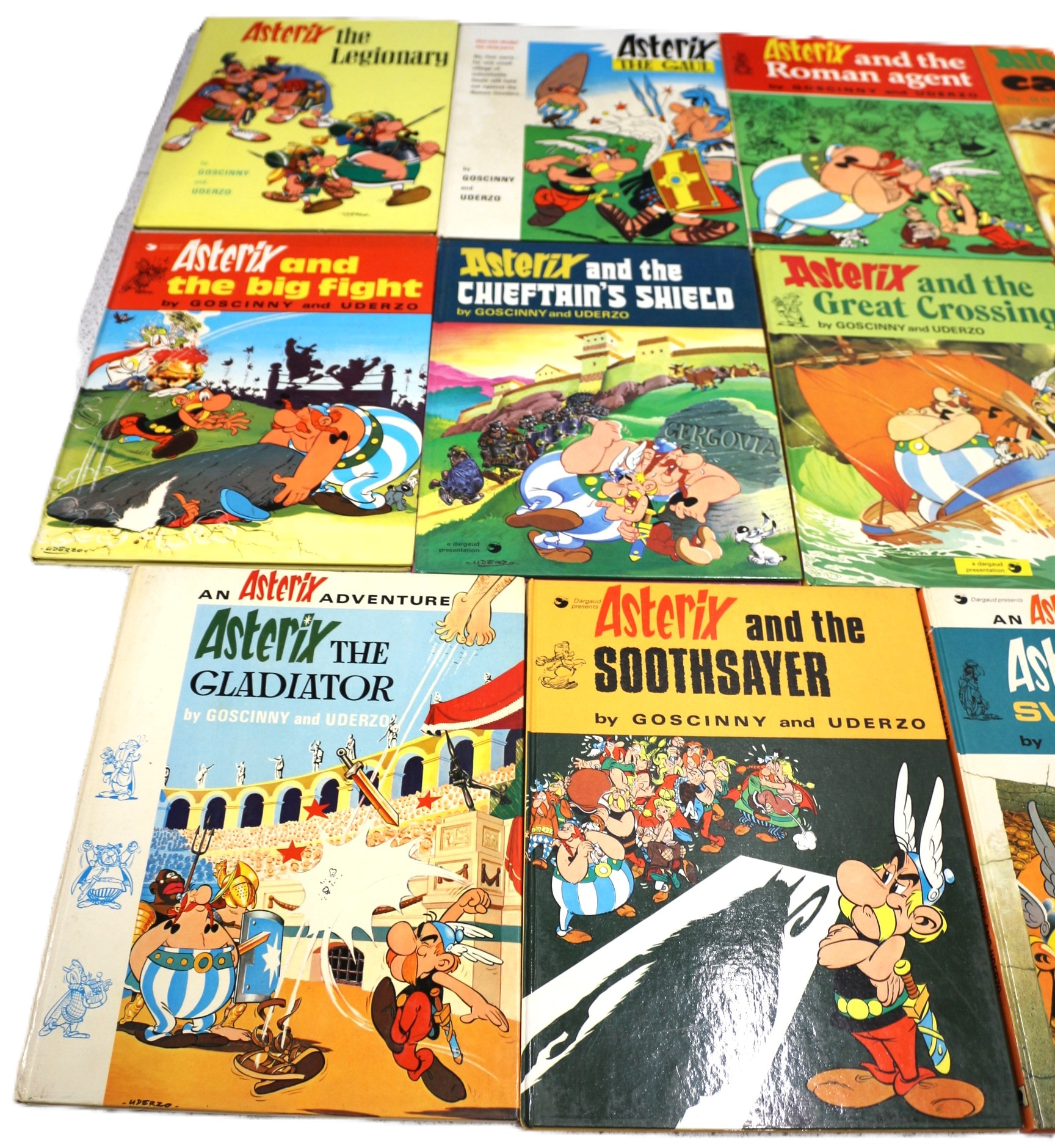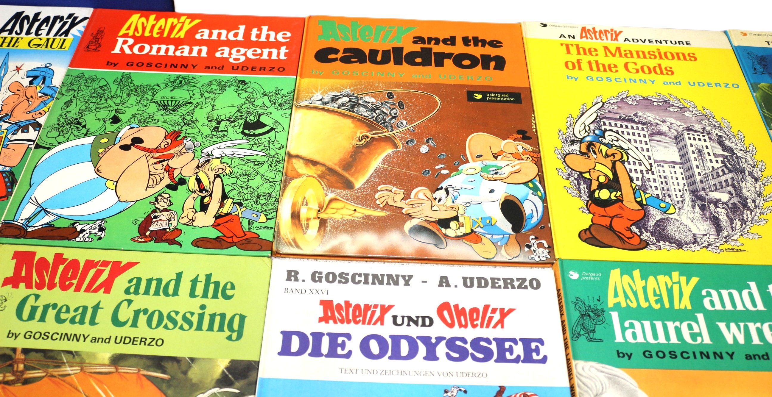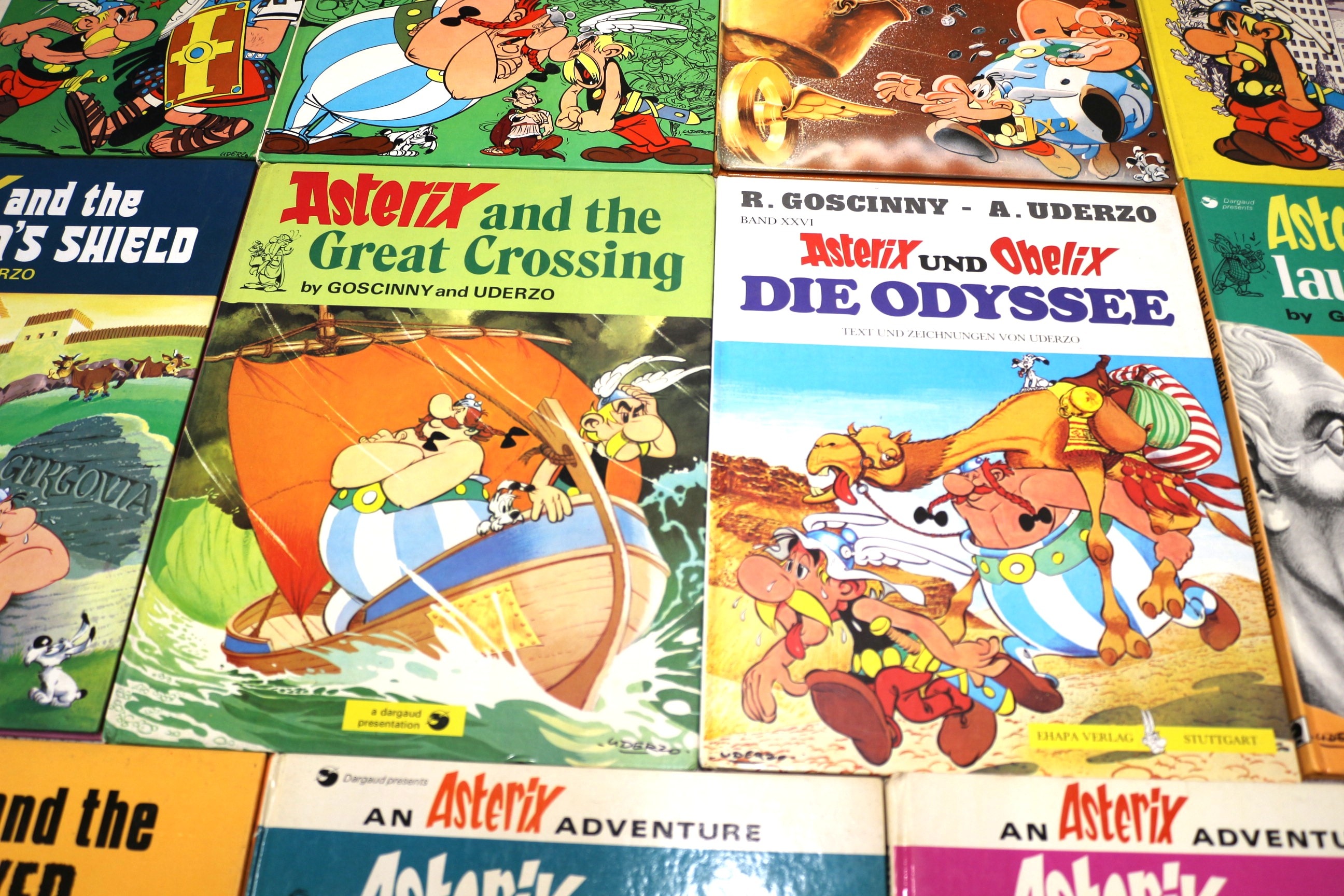 A collection of 20 hardcover comic books from the popular ‘Asterix’ series, created by René Goscinny and Albert Uderzo. Predominantly in English, the collection includes titles such as ‘Asterix the Legionary, ‘ ‘Asterix in Britain, ‘ ‘Asterix and Cleopatra, ‘ and ‘Asterix and the Goths.’ One volume is a German edition titled ‘Asterix UND Obelix DIE ODYSSEE’ (Asterix AND Obelix THE ODYSSEE), published by Thapa Verlag Stuttgart, which also specifies ‘TEXT UND ZEICHNUNGEN VON UDERZO’ (Text and drawings by Uderzo). The books feature colorful illustrations in the distinctive ligne claire style, printed on paper with hardboard covers, many bearing the ‘Dargaud’ publisher mark. The collection appears to be from the mid-to-late 20th century.