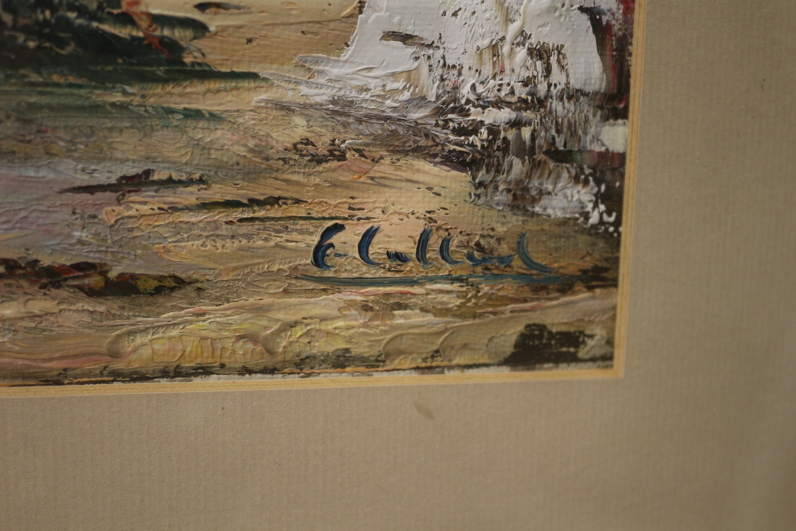 A pair of framed oil paintings, executed in an impasto technique depicting Mediterranean-style coastal landscapes, likely from the mid-to-late 20th century. Each artwork, rendered in oil on canvas or board, is housed under glass with a tan mat and set within a thin brass-tone metal frame. Both paintings bear a signature of “F. Cullell” (or similar) in the lower corner, with the vertically oriented piece also featuring the English word “HAIDA” on the hull of a boat. 52.5x37cm. AF