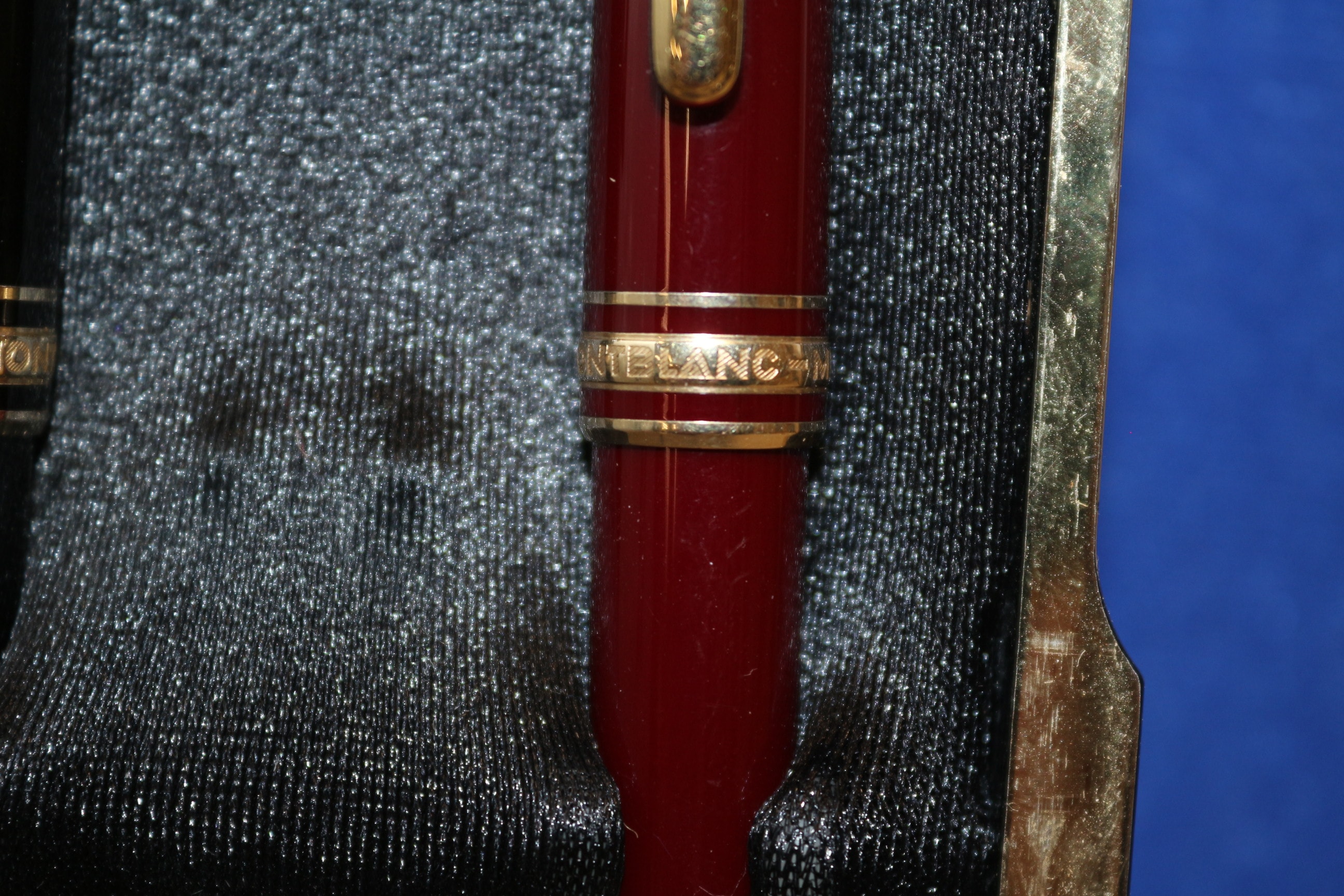 A two-piece Montblanc Meisterstuck 164 Ballpoint Pen and 165 Mechanical Pencil Set, comprising one black and one burgundy writing instrument. Both pens feature gold-colored hardware and a classic design, likely crafted from resin with gold-plated accents. The set is housed in its original dark blue hinged presentation box, which is lined with black fabric and a light silver material on the lid. Visible markings on the lid’s interior include the “MONT BLANC” logo, the brand’s star emblem, and the slogan “THE ART OF WRITING.” “MONTBLANC” is engraved on the central band of each pen, and the star emblem is present on the cap end. Working order