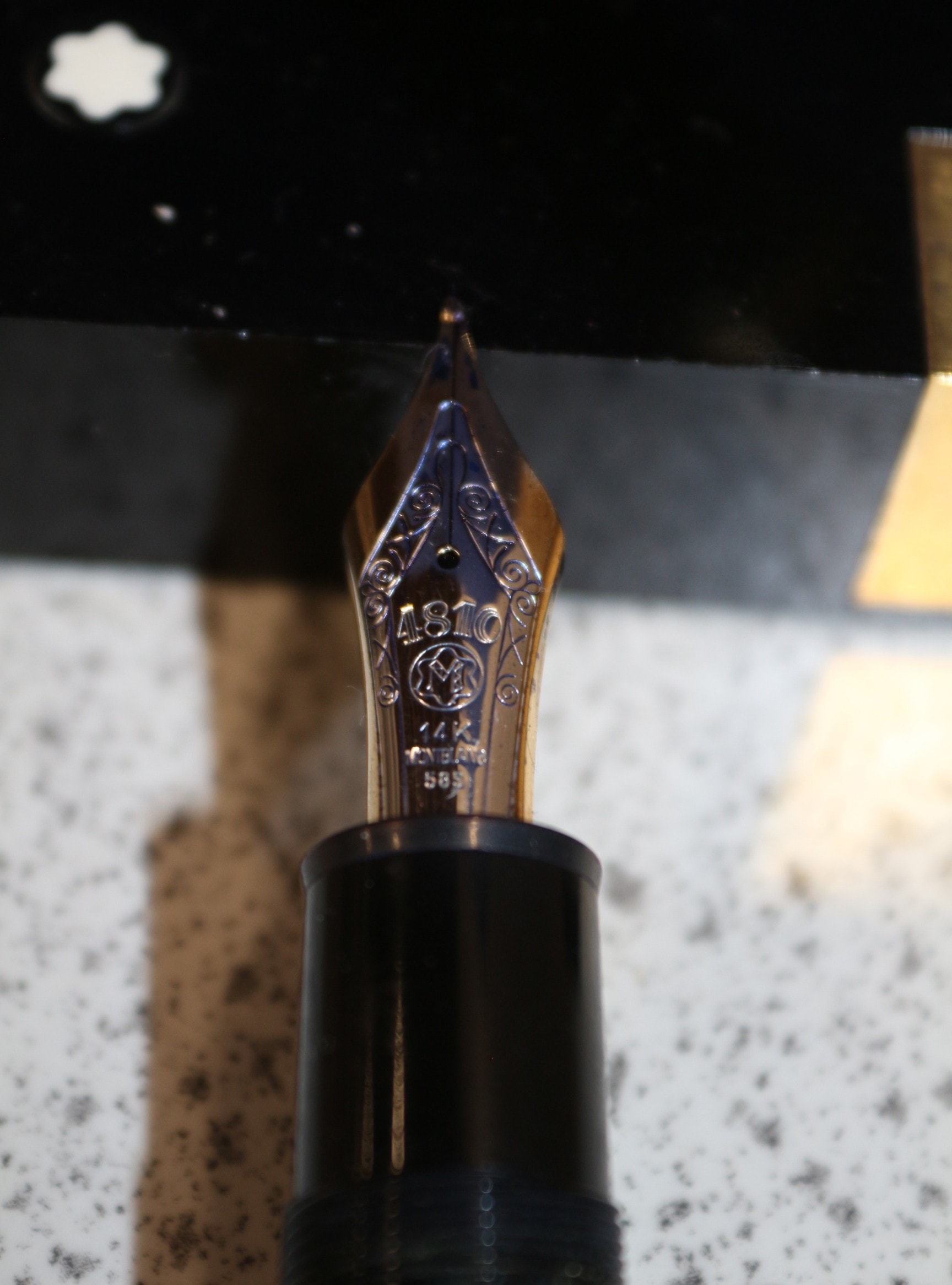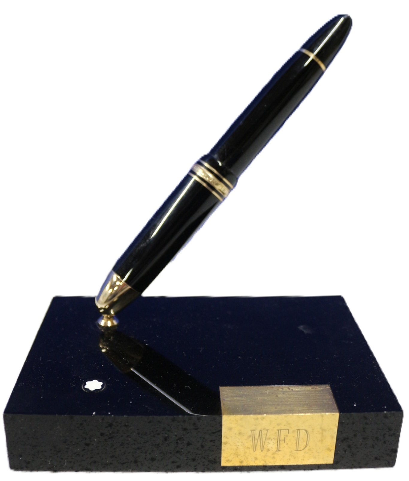 A Montblanc Meisterstück 146 LeGrand fountain pen and accompanying desk stand, dating to the circa 1980s. The pen features a black resin barrel and cap with gold-colored metal accents, including a cap band inscribed “MONTBLANC MEISTERSTÜCK”. The two-tone 14K gold (585) nib is engraved with “4810” and the Montblanc star logo. The accompanying rectangular stand is made of black polished stone, likely granite or marble, featuring a recessed Montblanc star logo and a gold-colored metal plaque engraved with the initials “WFD”.