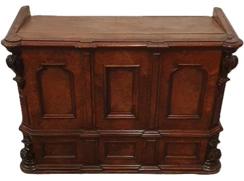 An Antique Italian Walnut Rostrum or Counter. This rectangular, dark-stained hardwood exquisite piece of furniture is likely made in a Baroque or Renaissance Revival style. Its front features a slightly slanted flat top surface and is divided into three vertical sections by fluted pilasters. The outer sections display arched recessed panels, and the central section has a rectangular recessed panel, suggesting doors or false fronts. A lower tier presents three smaller rectangular panels, similarly divided. The item’s sides terminate in substantial carved scrolled supports at both upper and lower corners. Constructed from solid walnut with figured or burl wood panels. 250x55cm, 90cm tall
