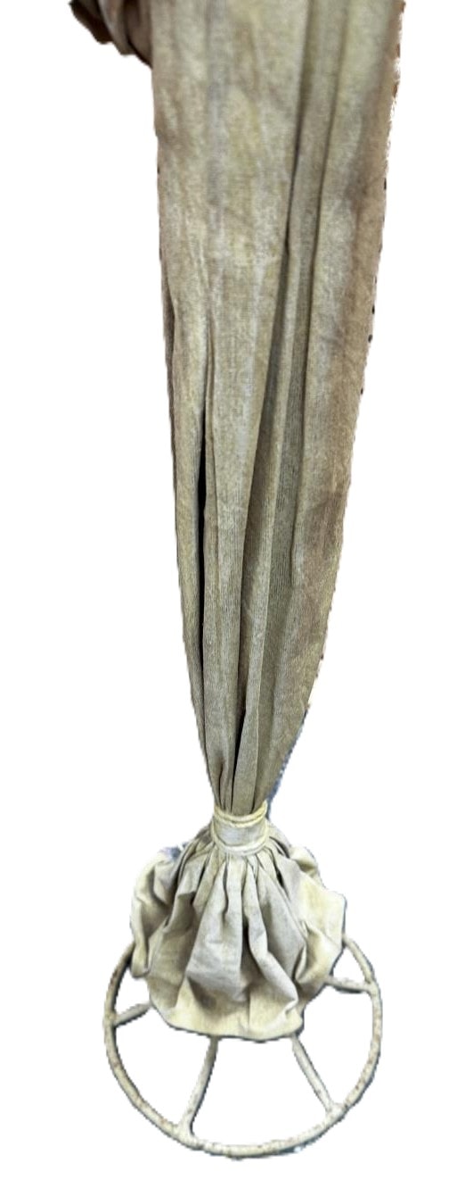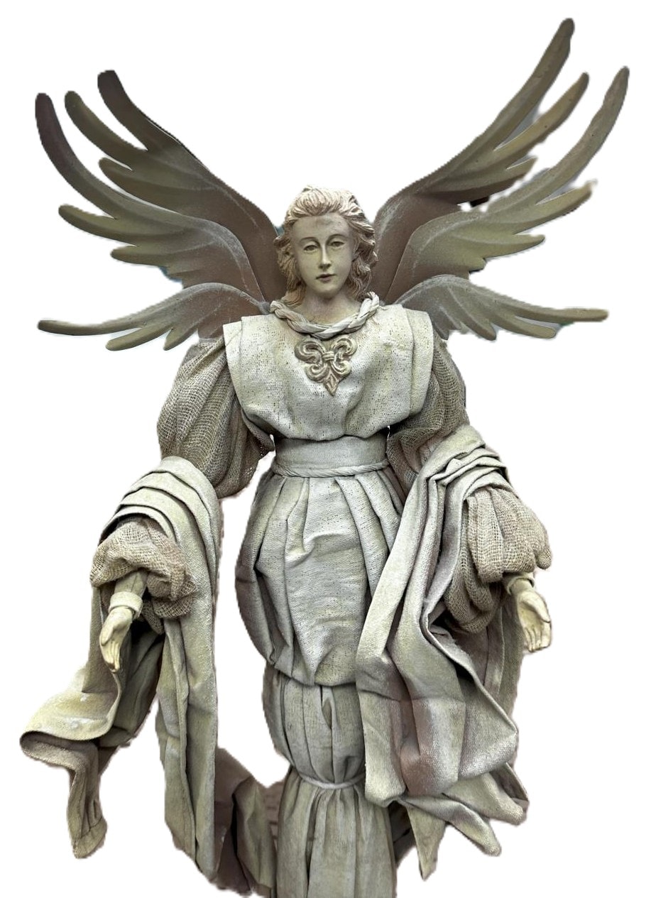 A standing vintage figural sculpture of over 1 metre, depicting a serene angelic figure, featuring a sculpted head, hands, and multi-layered wings. The body is elaborately draped in pleated textile, forming voluminous sleeves and flowing robes over an internal structure, with a decorative quatrefoil-like emblem adorning the chest. The textile extends downwards into a tapered column, terminating at a circular metal base with spoke-like supports. Materials include composite or plaster for the head, hands, and wings, textile for the body, and metal for the base, all finished in a muted palette of aged greens and grays, giving it a classical or Renaissance-inspired aesthetic. No visible text or markings are present.