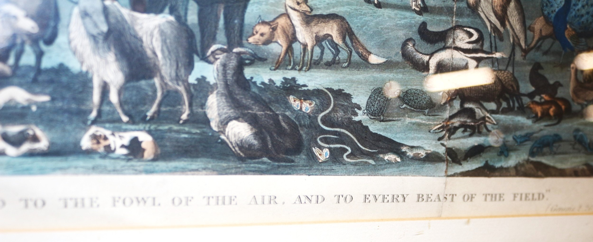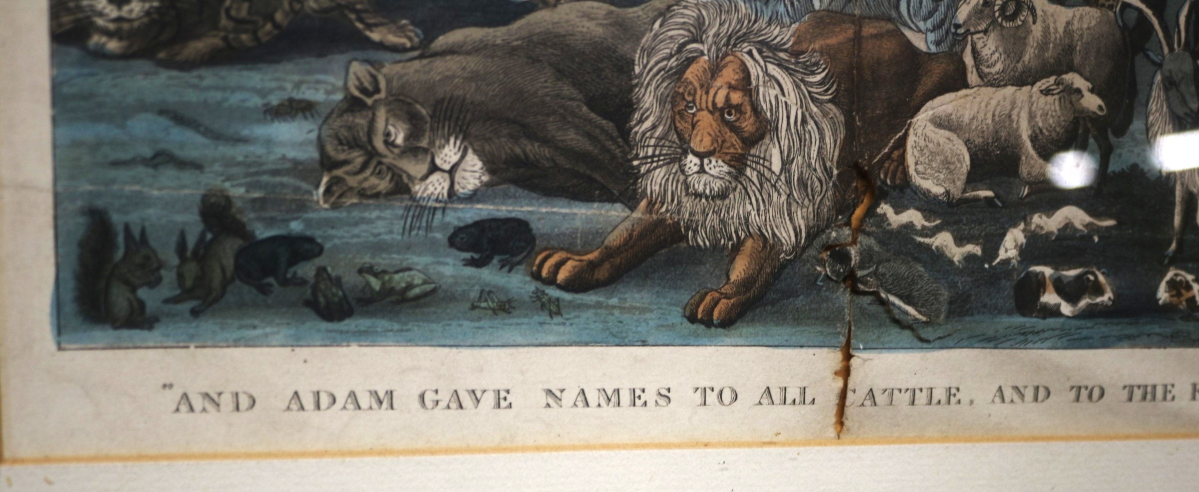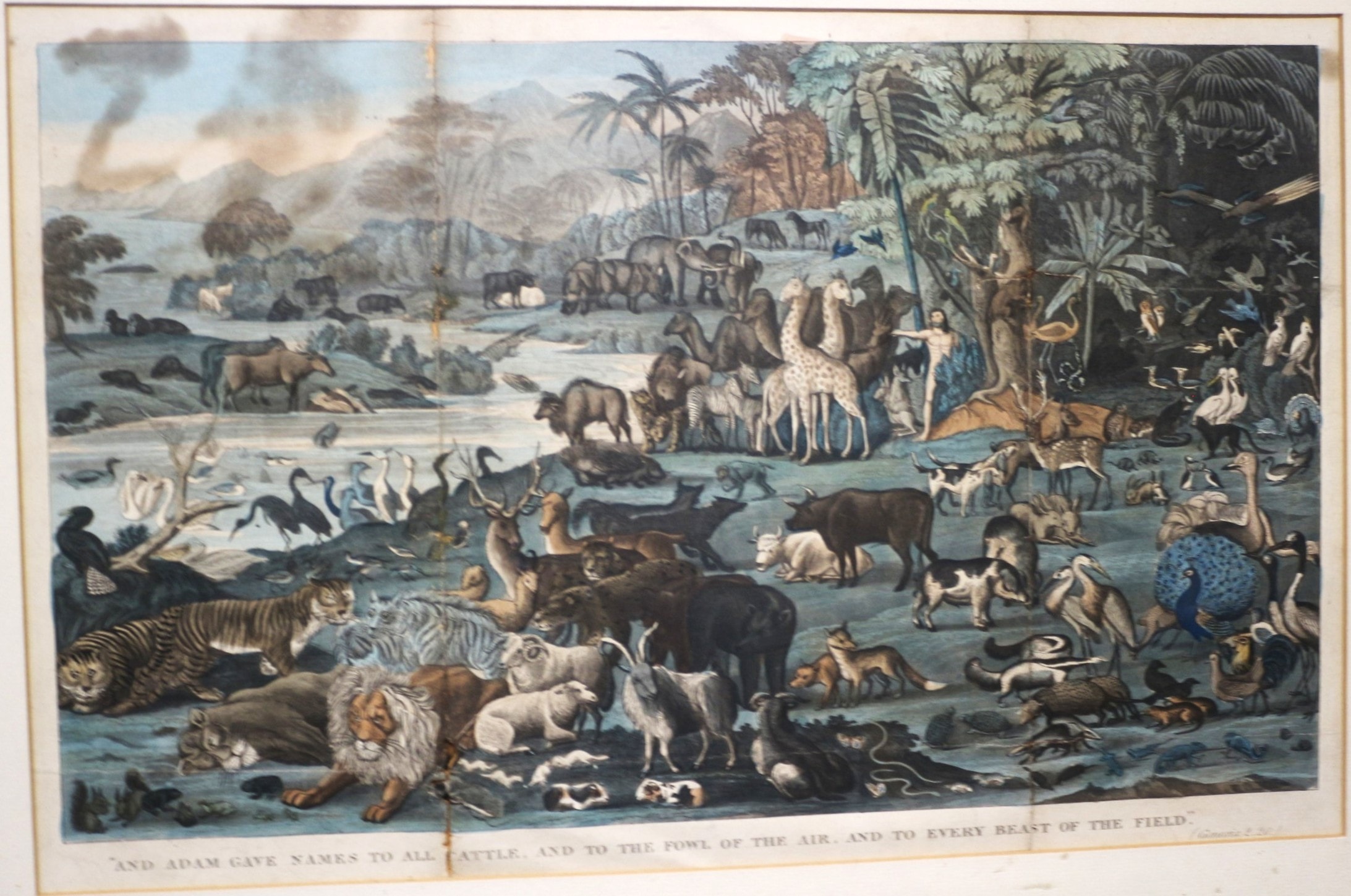 A print depicting Adam Naming the Creation, by Covens & Mortier/Corneille, originally published in Amsterdam circa 1685. This framed artwork features a vibrantly coloured print depicting a detailed biblical scene of Adam naming a multitude of animals within a verdant landscape, including elephants, giraffes, lions, tigers, and various fowl. The bottom border prominently displays the inscription “AND ADAM GAVE NAMES TO ALL CATTLE, AND TO THE FOWL OF THE AIR, AND TO EVERY BEAST OF THE FIELD.” with “(Genesis. 2. 20.)” noted in smaller script in the lower right corner. It is housed within a gilded wooden frame.