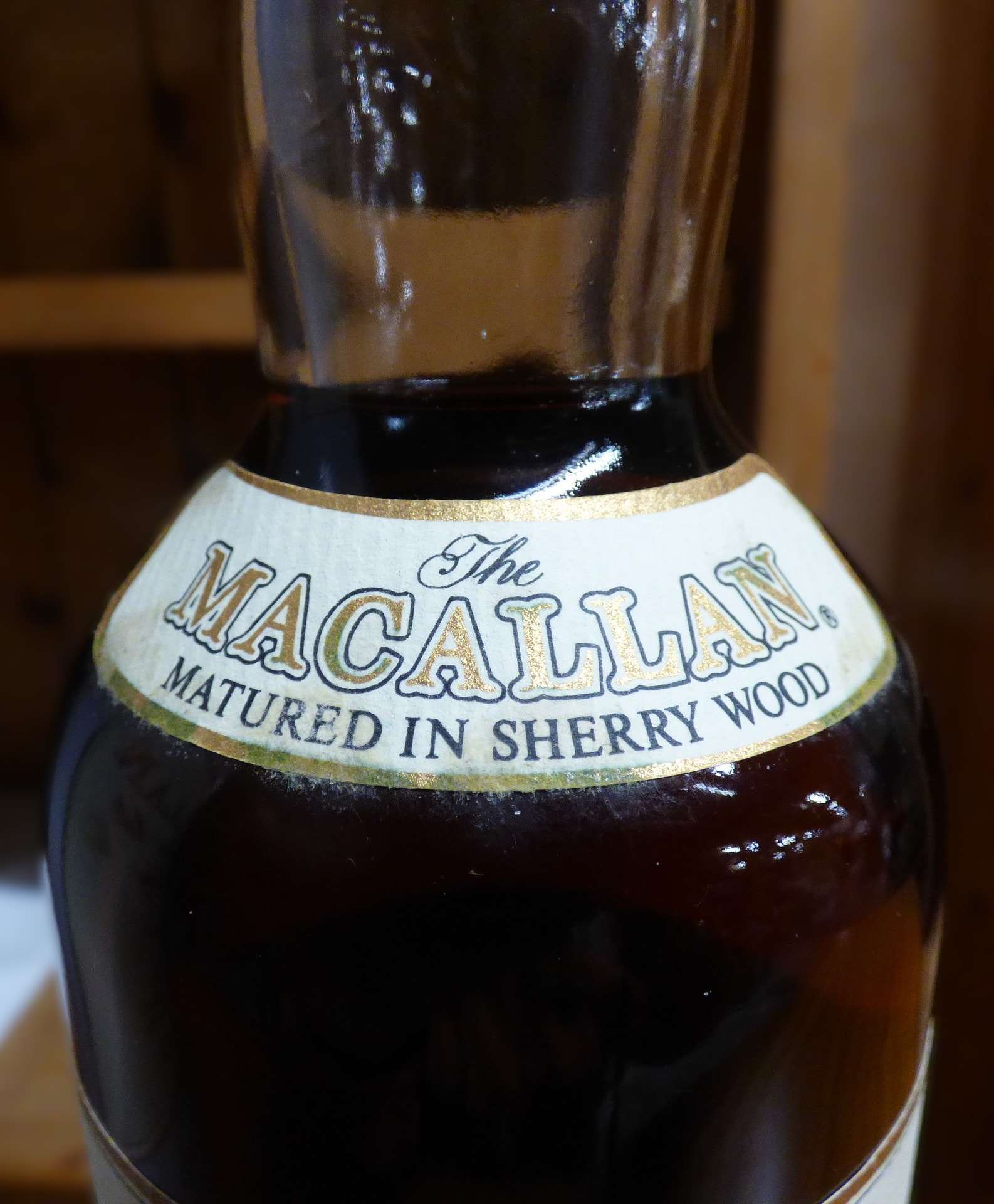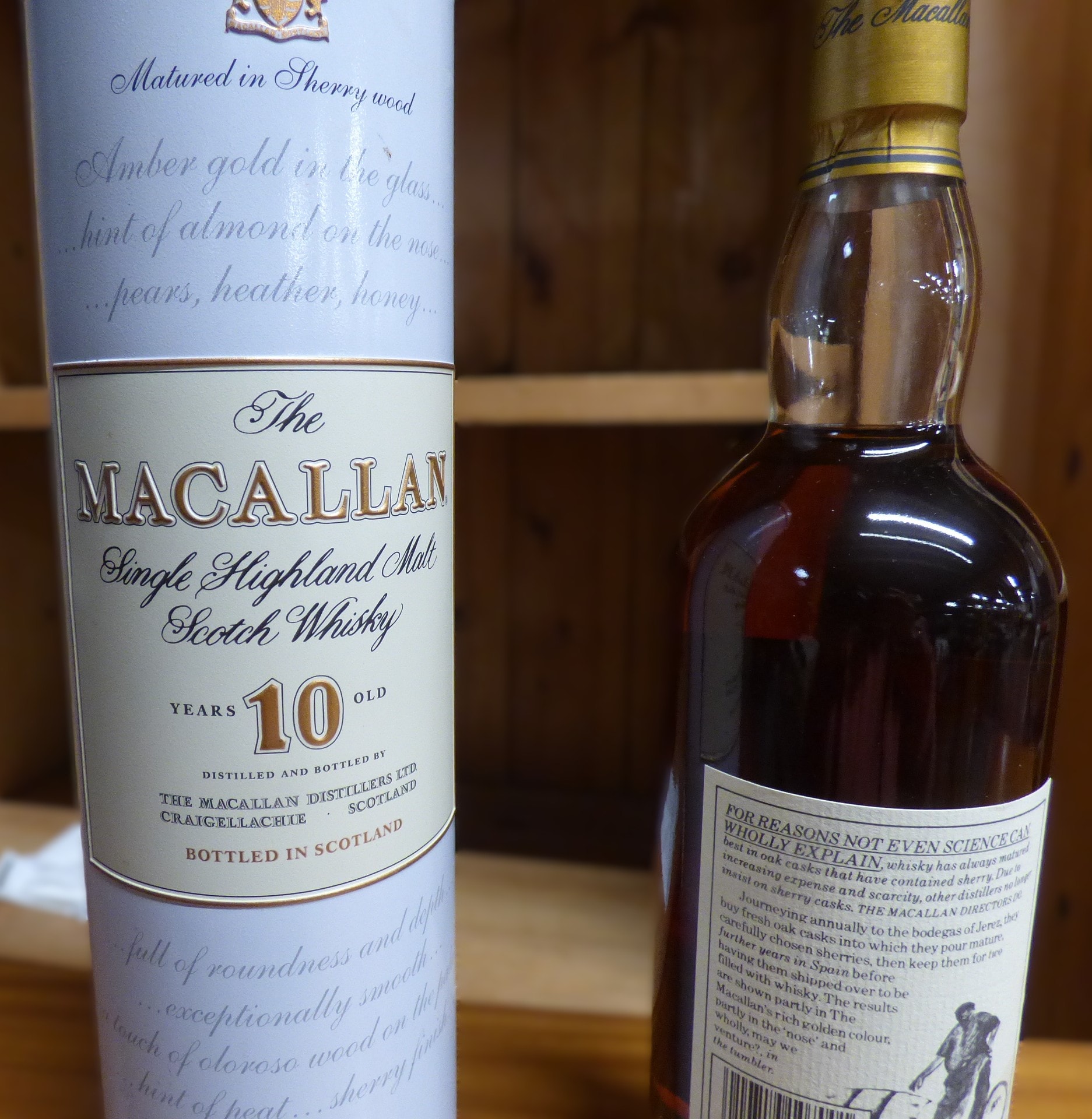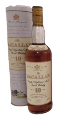 This lot features a rare early 1990’s bottle of The Macallan 10 Year Old Single Highland Malt Scotch Whisky, matured in sherry wood, presented with its matching cylindrical Tin box. The glass bottle is sealed with a gold-toned foil capsule and bears paper labels indicating its “40% vol” and “70cl” contents. Both the bottle and box prominently display “The Macallan” brand, “Established 1824,” and a company crest, confirming distillation and bottling in Scotland. The bottle’s rear label provides details on the sherry cask maturation process, while the presentation box includes tasting notes.