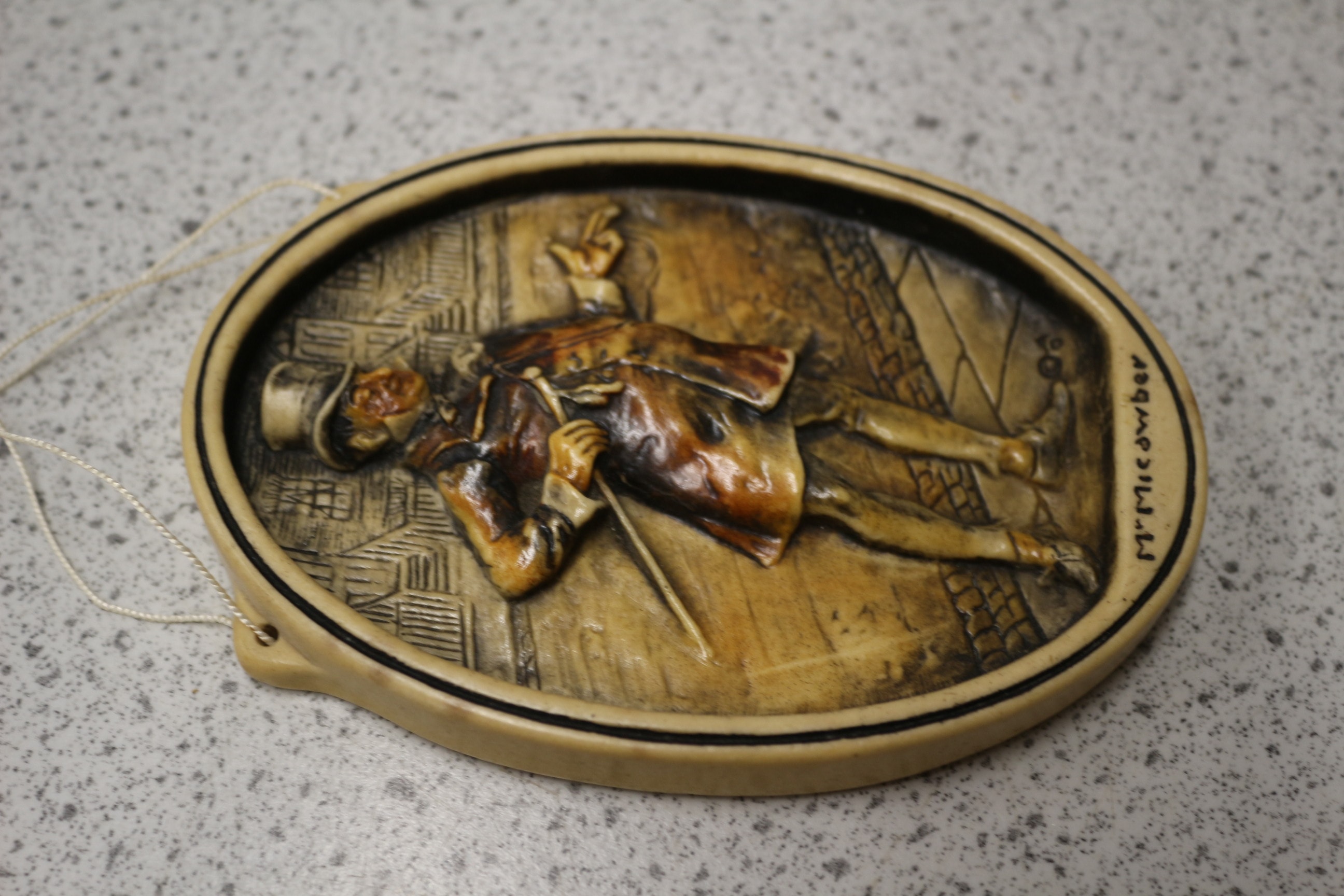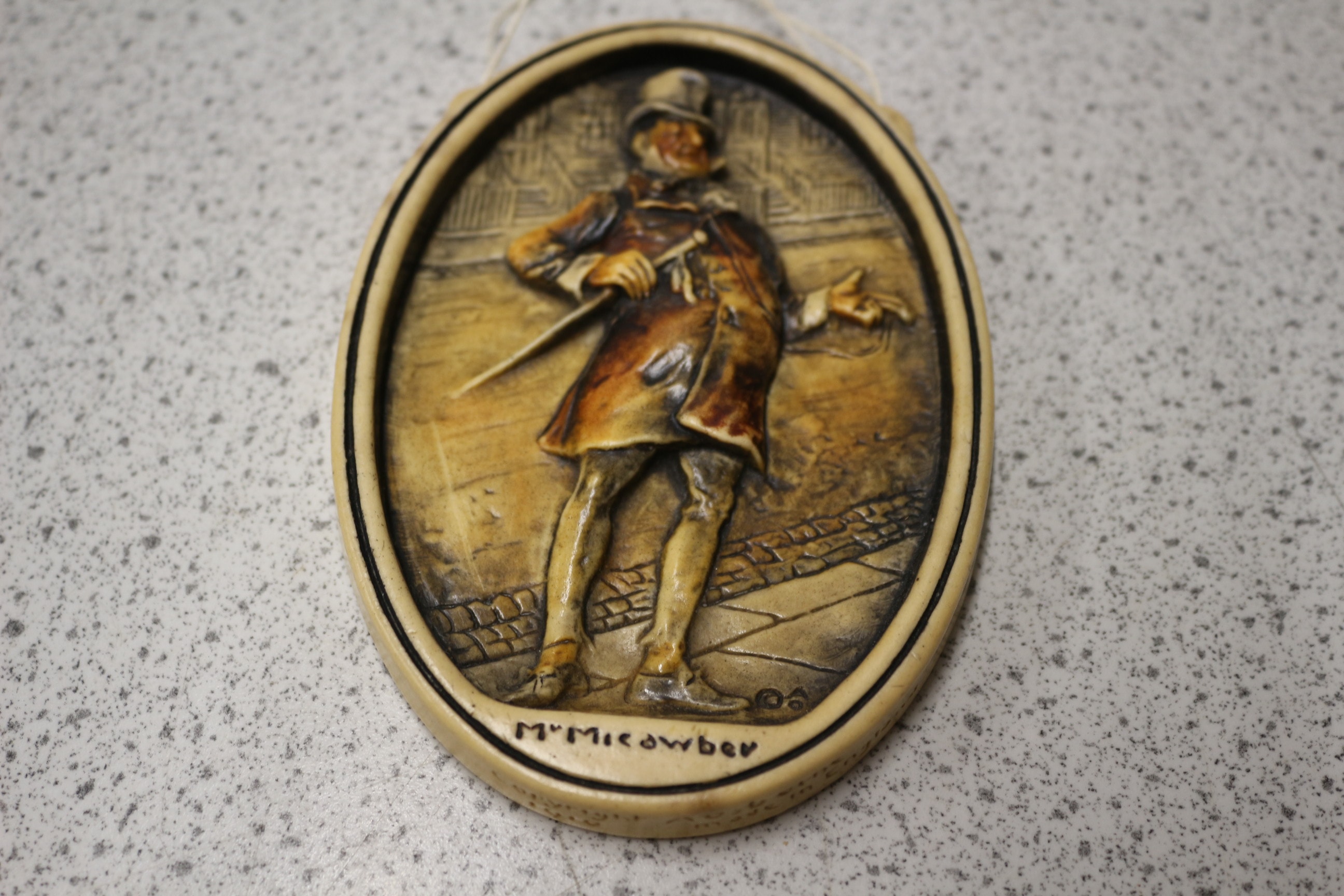 An Arnold Osborne Ivorex Plaque depicting M. Micawber. This oval-shaped decorative wall plaque features a three-dimensional relief of a male figure in 19th-century attire, including a top hat and long coat, holding a walking stick and gesturing, set against an urban architectural background. The item is crafted from a molded resin or composite material, finished with varied brown and beige tones to create an aged, faux ivory or wood effect. Along the bottom edge of the front, the name “M. Micawber” is inscribed. The reverse side features impressed text indicating “MOREX”, “COPYRIGHT IN GREAT BRITAIN, CANADA AND U.S.A.”, “ARNOLD OSBORNE”, and “MADE IN ENGLAND”, along with an affixed sticker displaying “LRL” and numerical information. The plaque is equipped with a string for hanging. 12.5cm