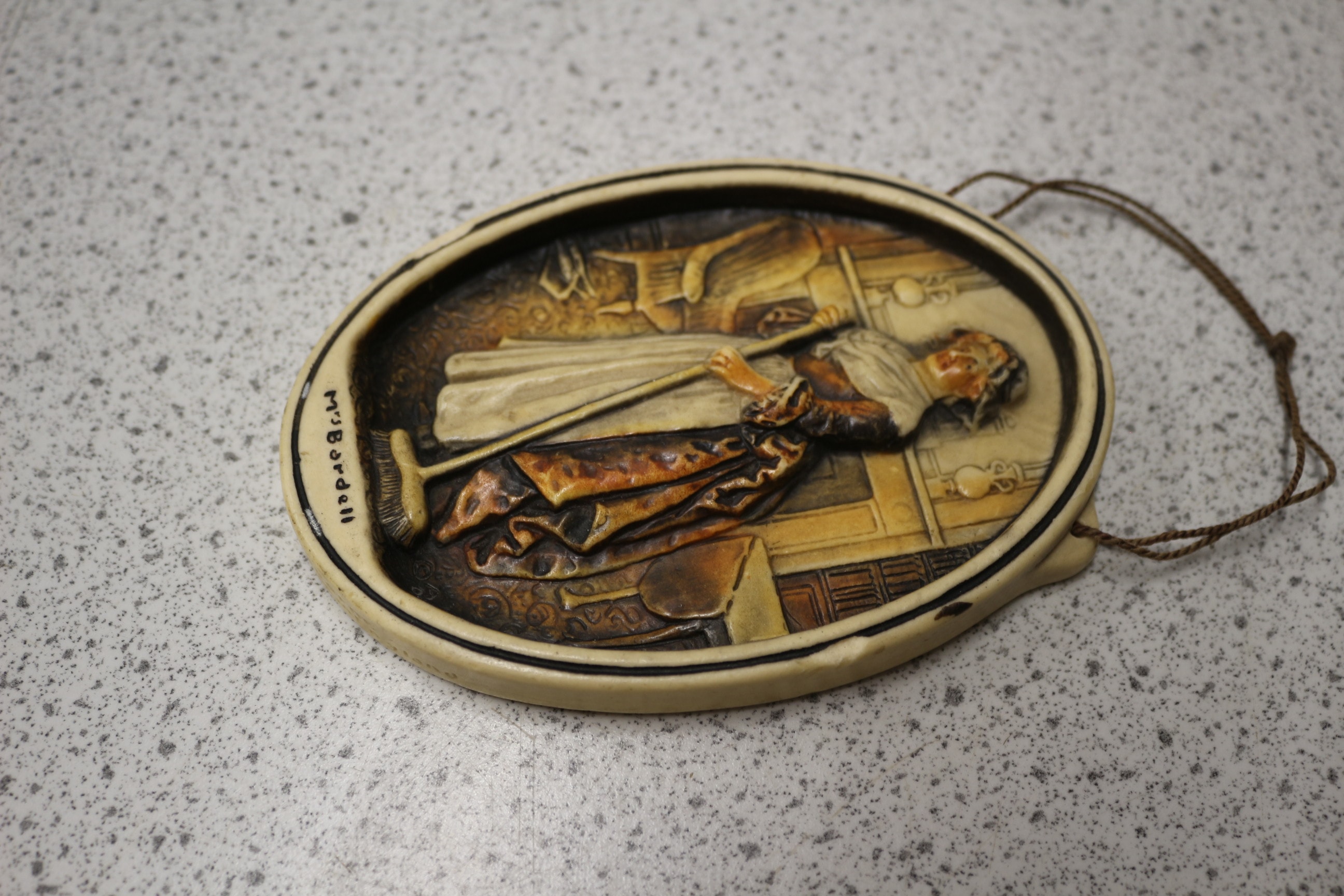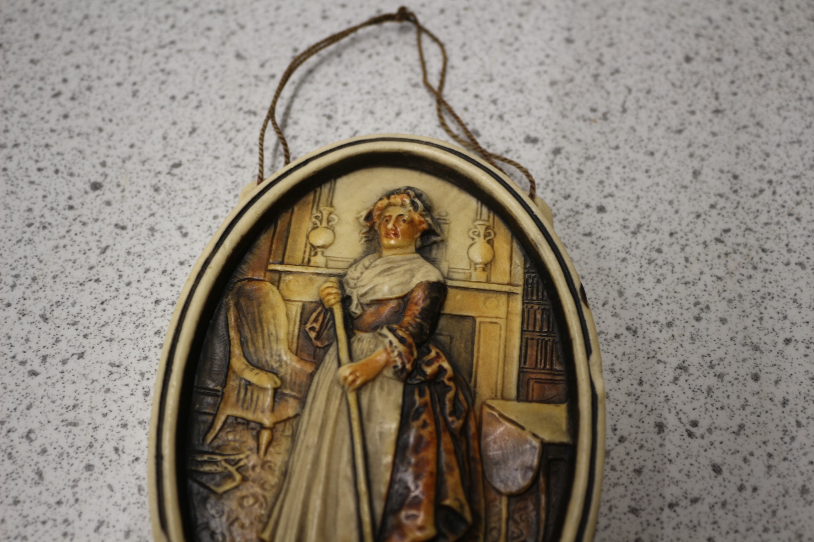 An Arthur Osborne Ivorex wall plaque depicting ‘Mrs. Bardell’ from Charles Dickens’ *The Pickwick Papers*. This oval-shaped, high-relief molded composite plaque features a genre scene of a woman in historical attire, holding a broom within a domestic interior, complete with a fireplace, chair, and table. The material has a creamy, bone-like finish with darker tones accentuating the relief details. The front lower edge is inscribed ‘M$^rs$ Bordell’. The reverse is impressed with ‘IVOREX’, ‘OSBORNE, ‘, ‘COPYRIGHT, ‘, ‘MADE IN ENGLAND, ‘, and ‘F. & C.O. BURNHAM, ENG.’. A braided cord is attached for hanging. 12.5cm