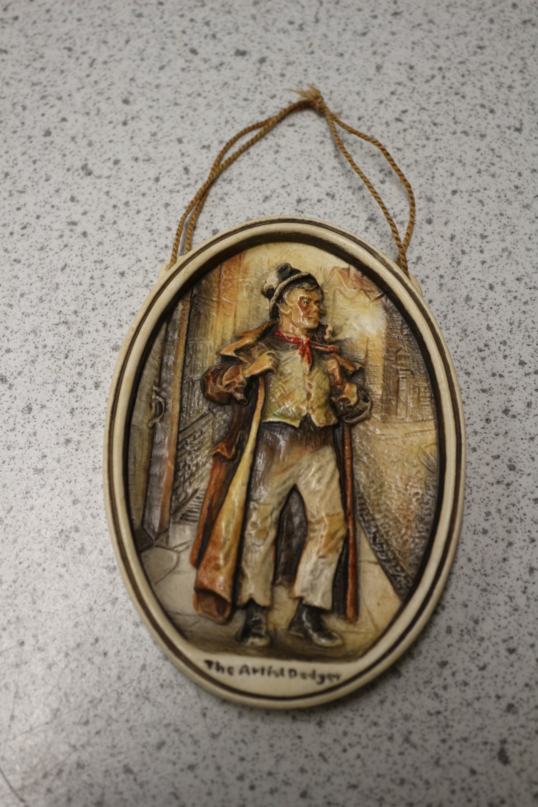 An Osborne Ivorex relief wall plaque depicting ‘The Artful Dodger’. This oval, hand-painted plaque is crafted from a composite material, likely plaster or resin, and features a three-dimensional representation of the character from Charles Dickens’ *Oliver Twist*. He is shown in period attire, wearing a hat, long coat, and waistcoat, and holding a pipe, against a textured background suggestive of an urban setting. The color palette primarily consists of earthy tones, including browns, creams, and ochres, with a touch of red on the figure’s cravat. A braided cord is attached at the top for hanging. The reverse side is stamped with the marks “IVOREX”, “OSBORNE-(COPYRIGHT)”, and “MADE & COLOURED BY HAND IN ENGLAND”. 12.5cm
