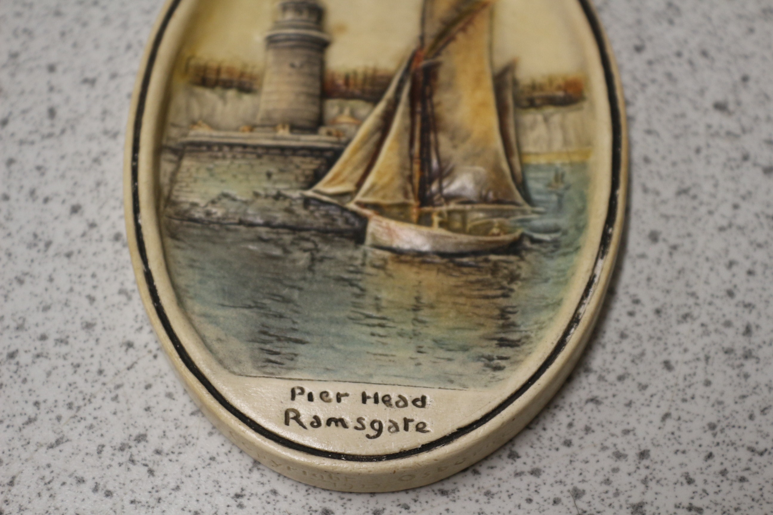 An Artini Engraving wall plaque. This oval-shaped decorative item features a low-relief maritime scene, depicting a lighthouse situated on a stone pier, with a two-masted sailing vessel prominently positioned in the water in the foreground, and a distant shoreline visible behind. The color palette is muted. The front is inscribed “Pier Head Ramsgate.” The reverse side bears faint embossed text including “THORAX, ” “COPYRIGHT, ” and “MADE IN ENGLAND.” A twisted natural fiber rope is affixed as a hanger at the top. 12.5cm