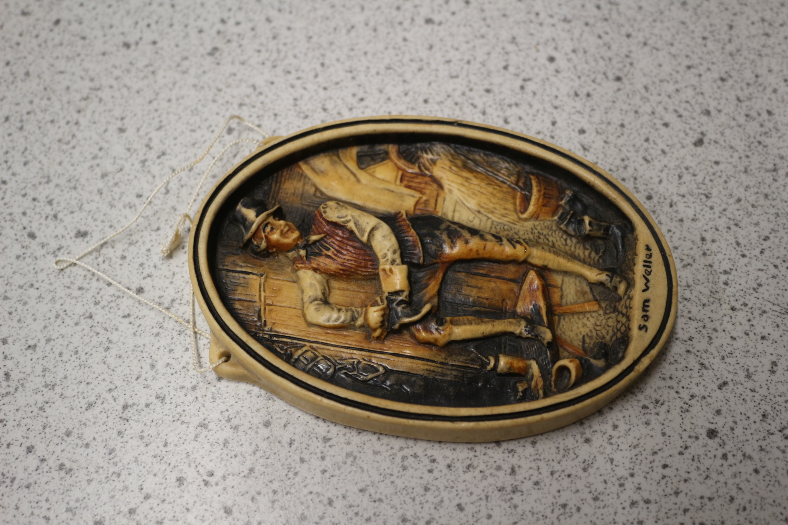 An Arthur Osborne Ivorex wall plaque, oval-shaped and featuring a high-relief molded scene. The plaque depicts a male figure, likely a shoemaker or cobbler, wearing traditional attire including a hat, waistcoat, and knee breeches, actively working on a shoe while seated on a stool within an interior workshop setting. The plaque exhibits a two-tone appearance, mimicking carved wood or aged resin, with darker recesses defining details and providing depth. In raised script along the bottom edge, the name “Sam Weller” is visible. A simple string hanger is attached at the top. 12.5cm