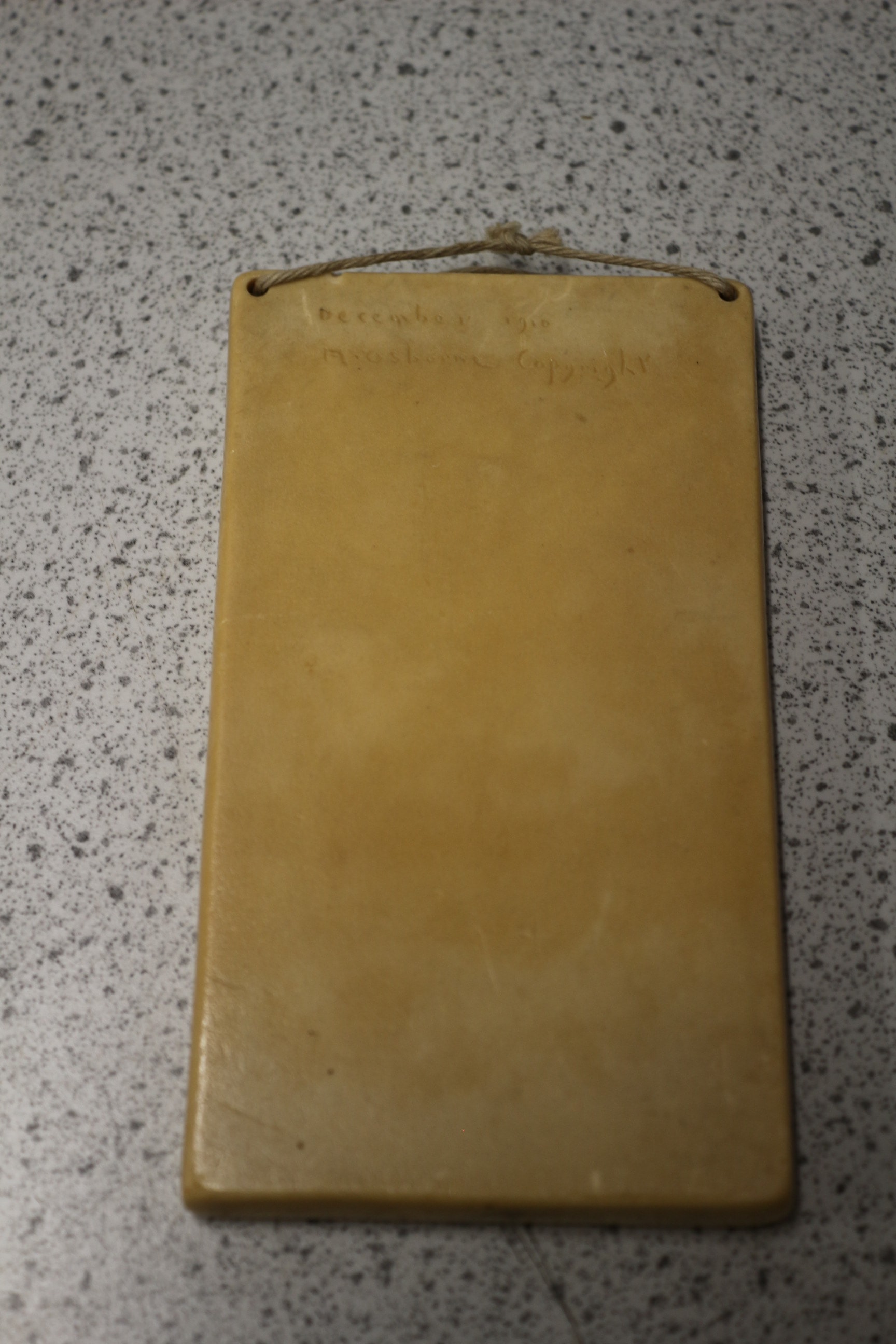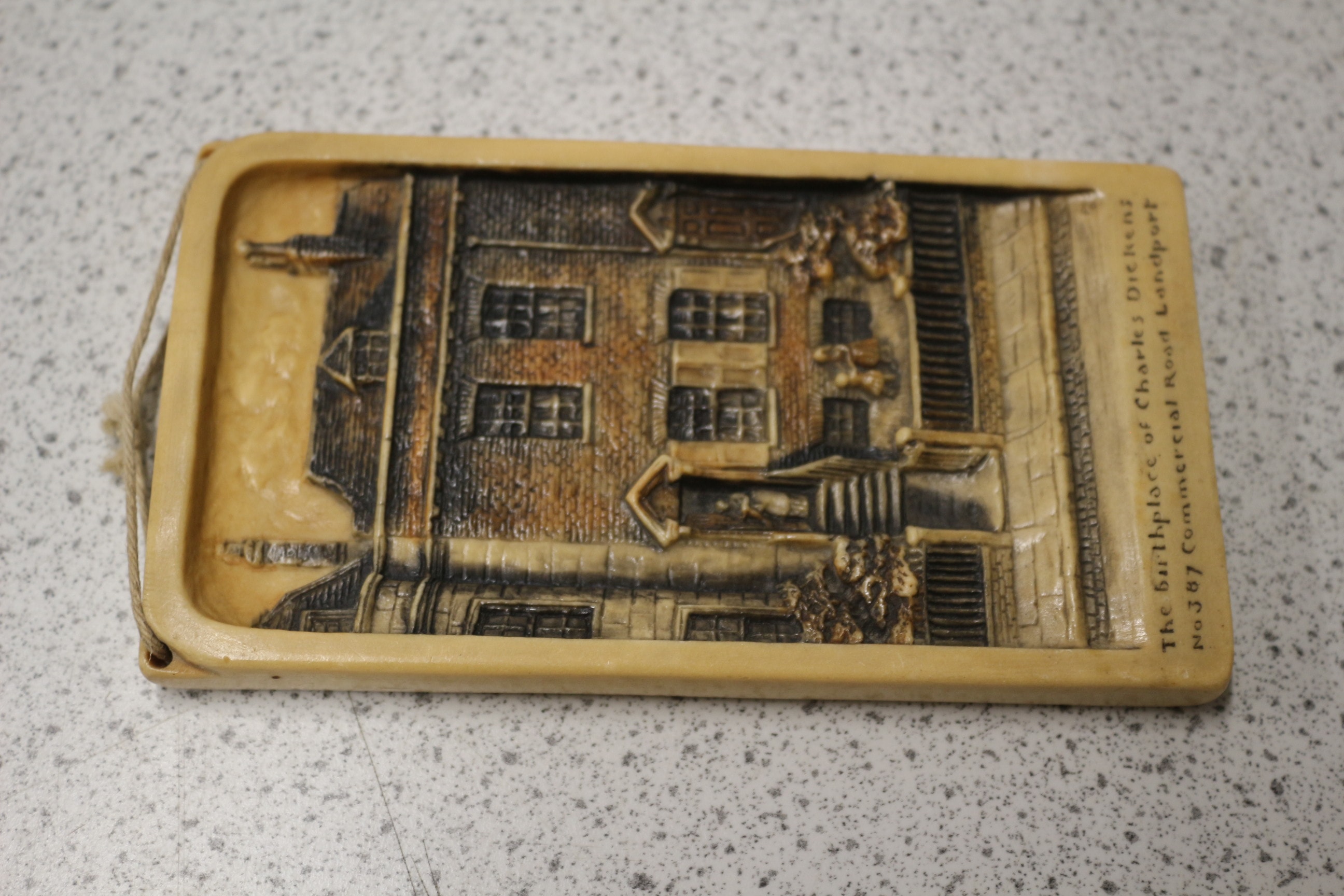 A rectangular high-relief wall plaque, crafted from a light-coloured cast resin or composite material, depicting a detailed architectural facade in a Victorian or Edwardian style. The relief features a brick building with multiple windows, a main entrance accessed by steps, and small figures of people on the sidewalk and steps. Darker tones are applied to highlight architectural elements like brickwork, roofing, and shadows, giving the piece a commemorative or decorative aesthetic. Inscribed below the relief on the front is the English text: “The birthplace of Charles Dickens No 387 Commercial Road Landport”. The reverse side faintly bears “December 1990” and a partially legible “Mouseh___ Copyright” mark. A braided string is attached at the top for hanging. This piece is executed in a style similar to early 20th-century Ivorex plaques. 15cm