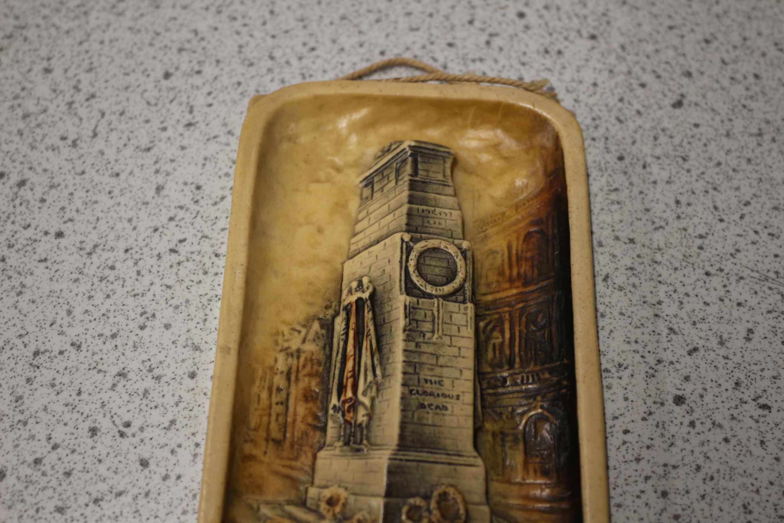 An Osborne Ivorex relief plaque depicting The Cenotaph. This rectangular plaque features a detailed representation of the war memorial, complete with draped flags and wreaths at its base. Cast in Ivorex, a material resembling plaster or resin, it exhibits an aged, yellowish patina with darker antiquing in the recessed areas, enhancing its depth. The front bears the inscription ‘The Cenotaph / in memory of / The Glorious Dead / 1914-1919’ at the bottom, mirroring ‘THE GLORIOUS DEAD’ visible on the monument within the relief. The reverse is marked ‘Regd No 699402’ and ‘MADE IN Gt BRITAIN’. A jute rope is attached at the top for hanging. 15.5cm