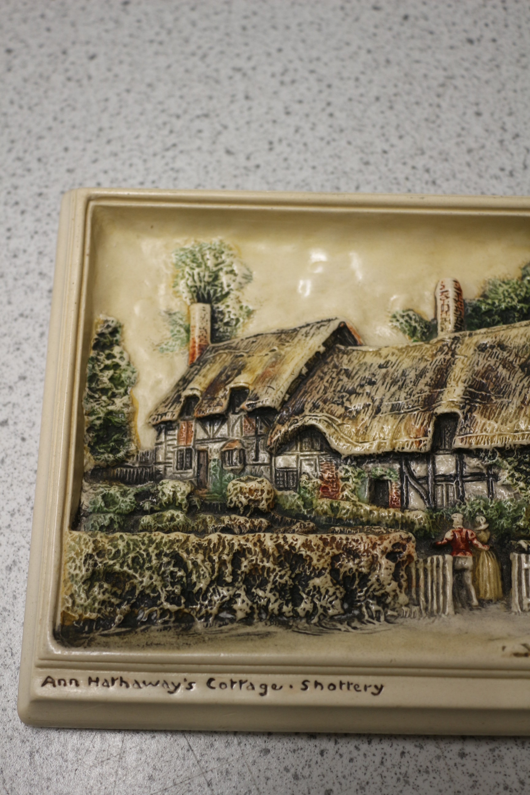 An Osborne Ivorex relief plaque depicting ‘Ann Hathaway’s Cottage, Shottery’. This rectangular, hand-painted relief plaque, likely crafted from molded resin or plaster, features a three-dimensional scene of the thatched-roof, half-timbered cottage surrounded by lush foliage and two figures standing by a gate. The plaque is rendered with an off-white base and accents of green, brown, red, and black paint. The lower border clearly bears the inscribed text ‘Ann Hathaway’s Cottage. Shottery, ‘ with an additional indistinct marking visible on the bottom right of the relief’s surface. A twisted cord hanger is present on the reverse, which also shows faint impressed text. 23.5x16cm
