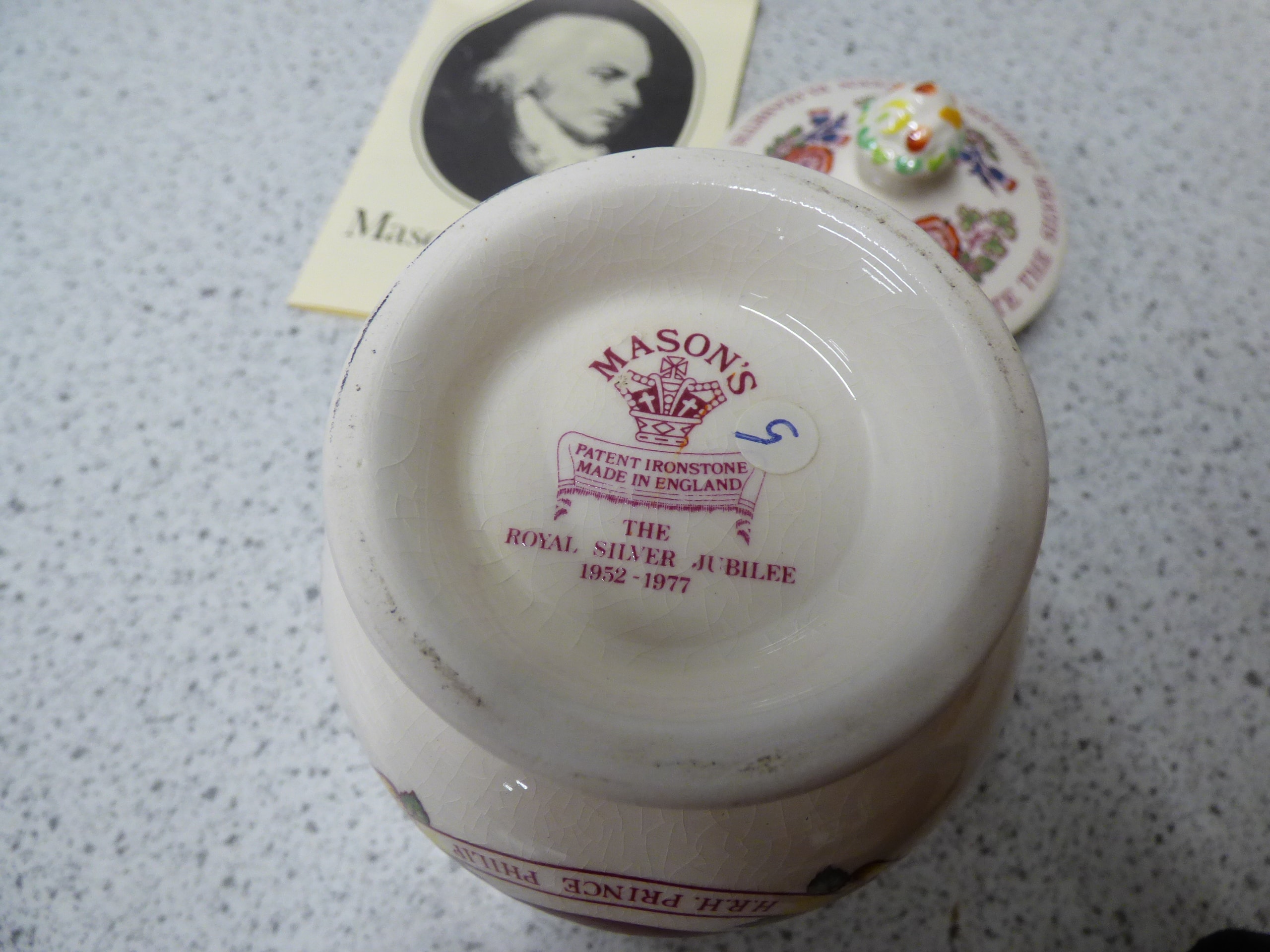 2 Rare China Pieces, A cream and green Doulton Burslem “Victoria R.I. Diamond Jubilee” beaker and a multi-coloured Mason’s Ironstone “Royal Silver Jubilee Queen Elizabeth II 1952-1977” lidded pot, complete with its branded box and pamphlet.