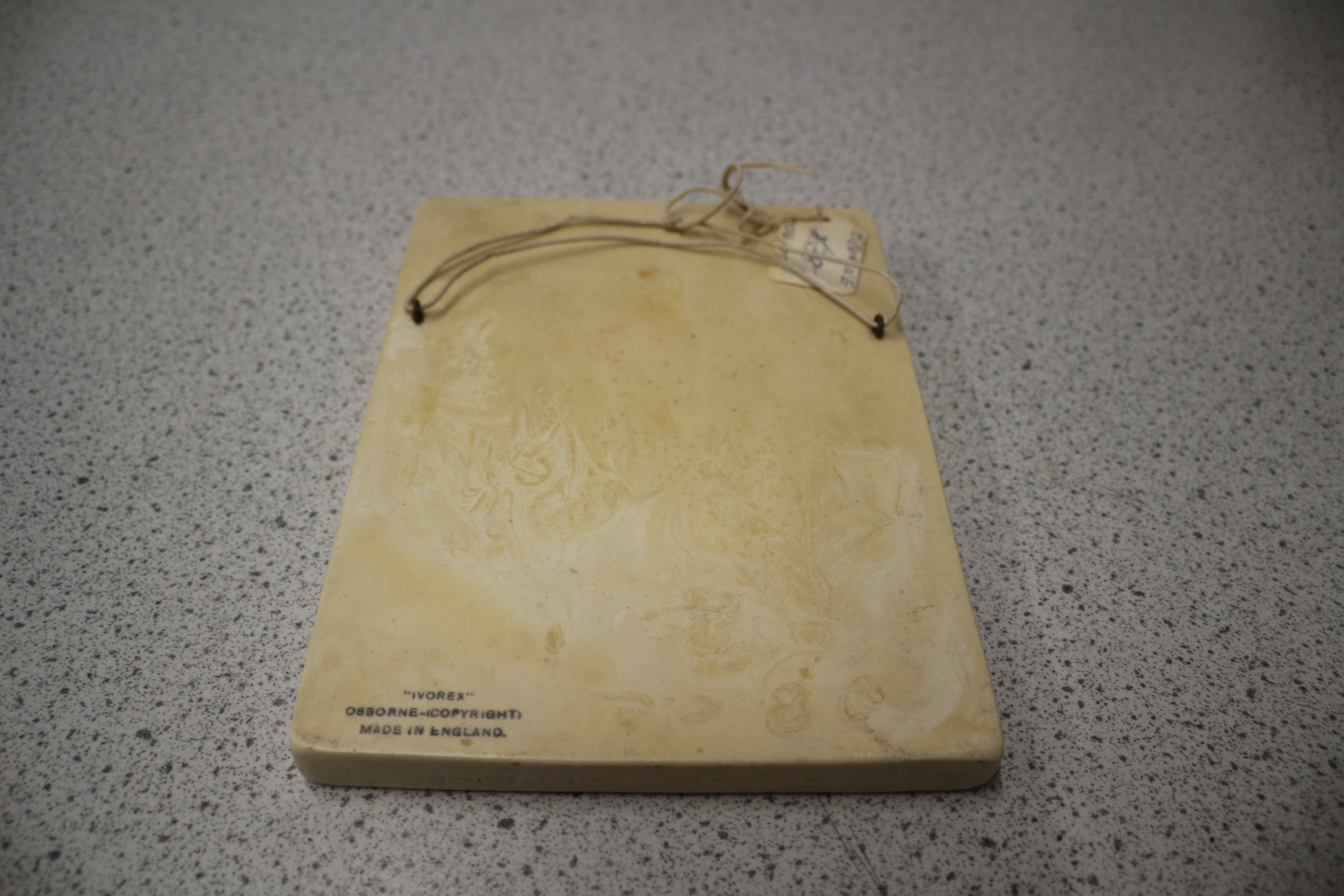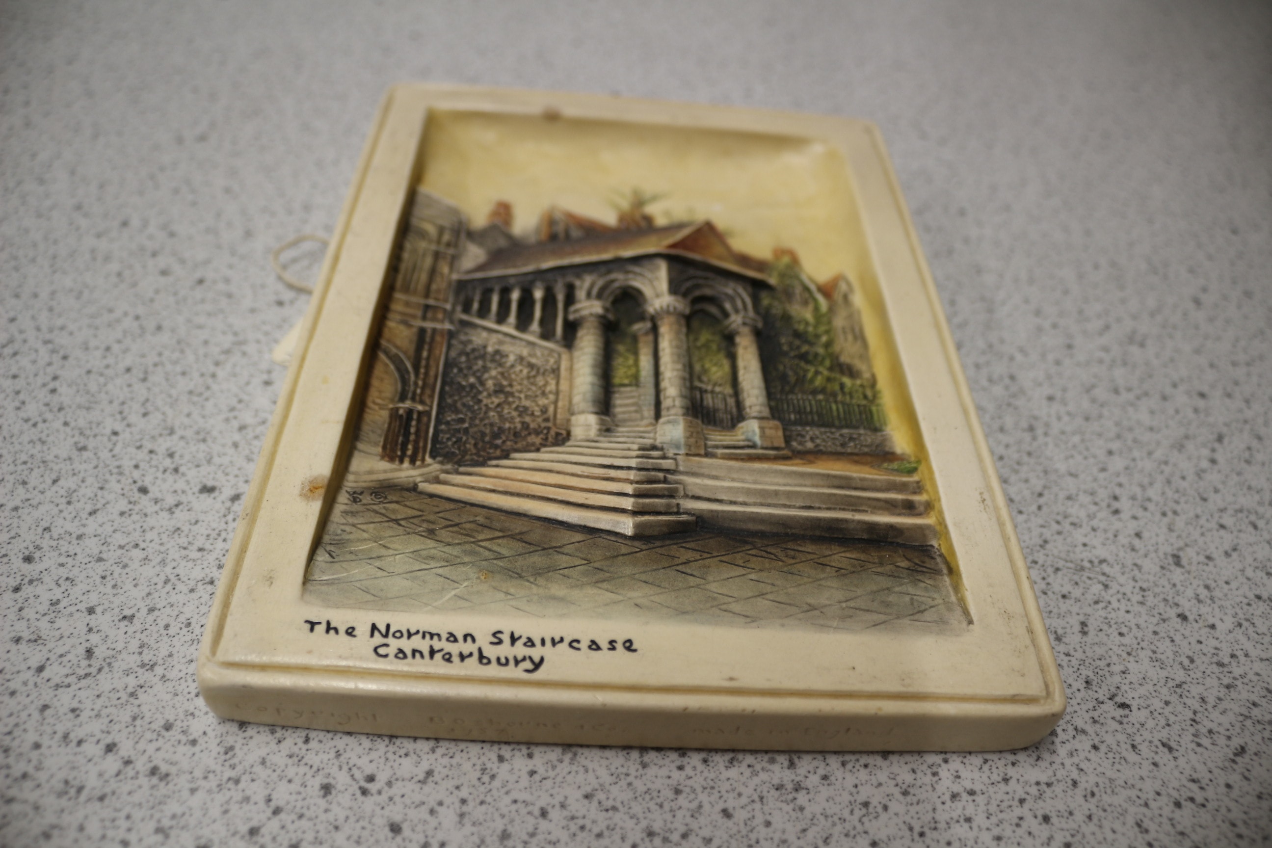 An Osborne Ivorex ‘Plastic Sketch’ relief plaque, made from a molded composite material such as plaster or resin, with an off-white/ivory finish. The rectangular plaque features a hand-tinted architectural scene depicting a grand external staircase and building, rendered in a picturesque style. Below the relief, the subject is clearly identified as “The Norman Staircase Canterbury”. The reverse is marked “IVOREX”, “OSBORNE-COPYRIGHT”, and “MADE IN ENGLAND”. A twisted cord is present on the back for hanging. 20x15cm