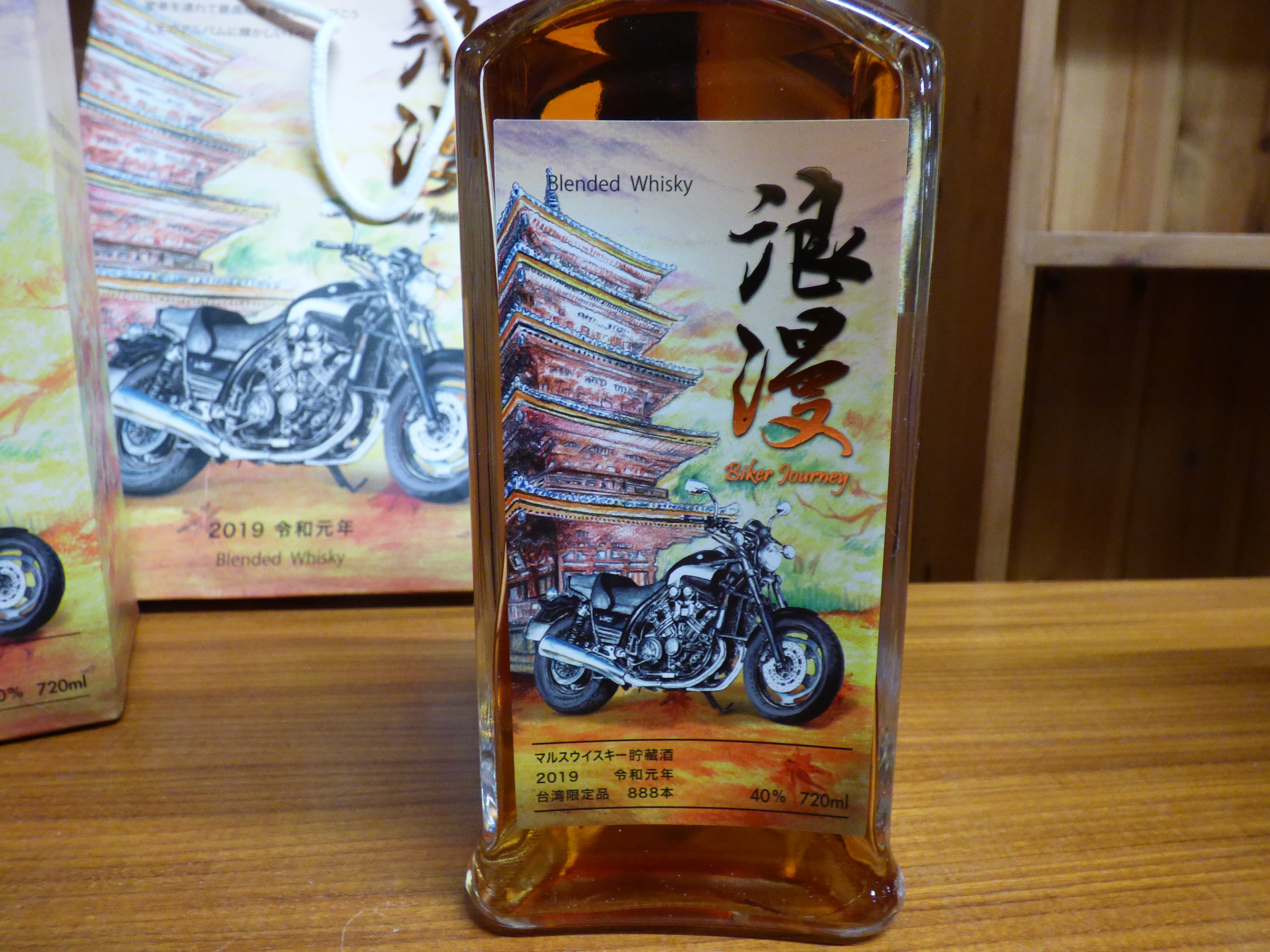 This lot comprises a Mars Biker Journey 2019 Batch #3 Japanese Blended Whisky bottle, its accompanying cardboard presentation box, and a partially visible paper gift bag. The clear glass bottle contains an amber-gold liquid and is approximately 720ml in volume with a metal screw cap, stated to be 40% alcohol by volume. Both the bottle’s main label and the box feature an illustrative design depicting a multi-tiered pagoda and a black motorcycle, accompanied by the English text ‘Blended Whisky, ‘ ‘Silver Journey, ‘ and the Japanese/Chinese characters ‘浪漫’ (Rōman, meaning Romantic/Romance). Further visible text identifies it as ‘Mars Whisky, ‘ produced by Honbo Shuzo Co., Ltd. in Kagoshima, Japan, dated ‘2019 令和元年’ (Reiwa First Year), and described as a ‘台湾限定品 888本’ (Taiwan Limited Edition of 888 bottles). The rear label provides tasting notes (‘aromatic character with tender and woody flavour’), lists ingredients (malt, grain), and details ‘2019/08 Batch.03,’ alongside distribution information for ‘大爵文創股份有限公司’ (Dajue Cultural and Creative Co., Ltd.) in Taipei, Taiwan, and standard alcohol warnings in Chinese.