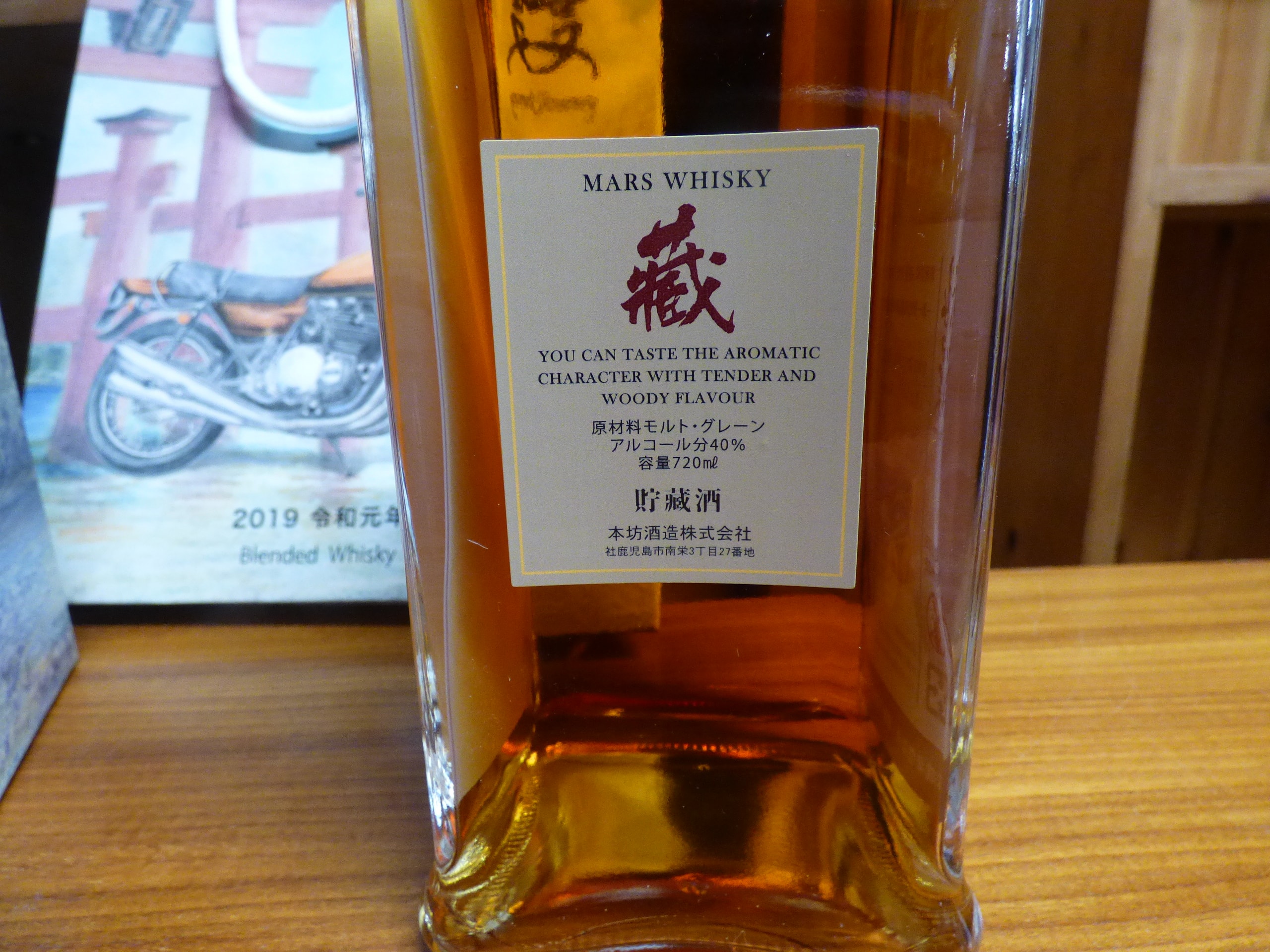 A Mars Kura Whisky Biker Journey 2019 Batch 02, Taiwan Limited Edition, comprising a 720ml glass bottle of Mars Blended Whisky, its matching cardboard retail box, and a paper gift bag. The amber-colored whisky bottle is front-labeled “Blended Whisky” and prominently features the Japanese calligraphy “浪漫” (Roman, meaning Romance or Romantic) along with “Biker Journey, ” below an illustration of a vintage motorcycle and a torii gate. The packaging indicates dating to “2019 令和元年” (2019, the first year of the Reiwa era), specifies it as a “台湾限定品” (Taiwan Limited Edition) of “888本” (888 bottles), and has an alcohol content of 40% by volume. The rear label further identifies the producer as “本坊酒造株式会社” (Honbo Shuzo Co., Ltd.) and specifies malt and grain as raw materials. The rear label also notes “Batch.02”.