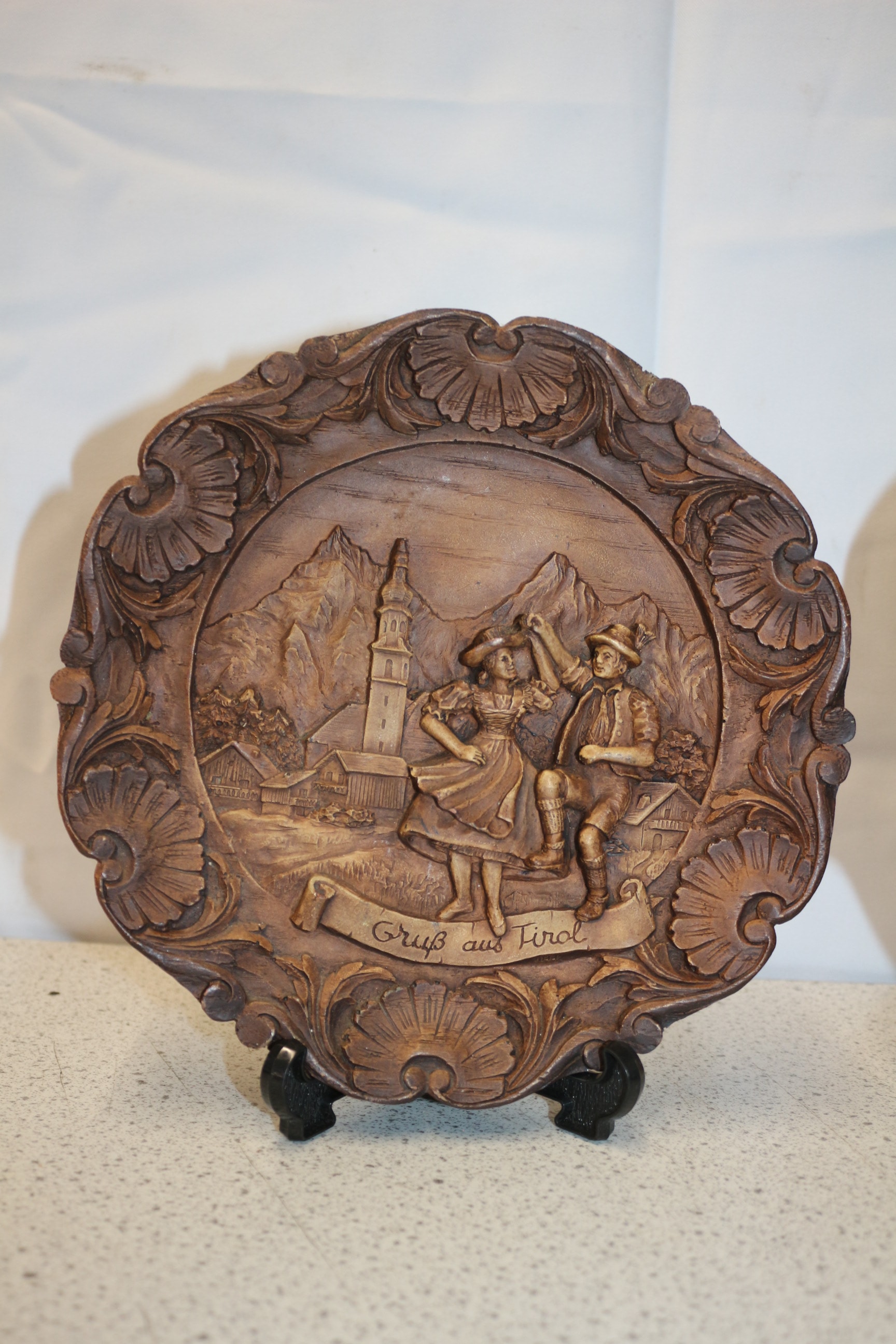 Two brown carved wood or resin decorative plates, one depicting a traditional dancing couple inscribed “Gruß aus Tirol”, and the other a horse-drawn carriage inscribed “MDINA MALTA”, each on a black stand. Largest 23cm Dia
