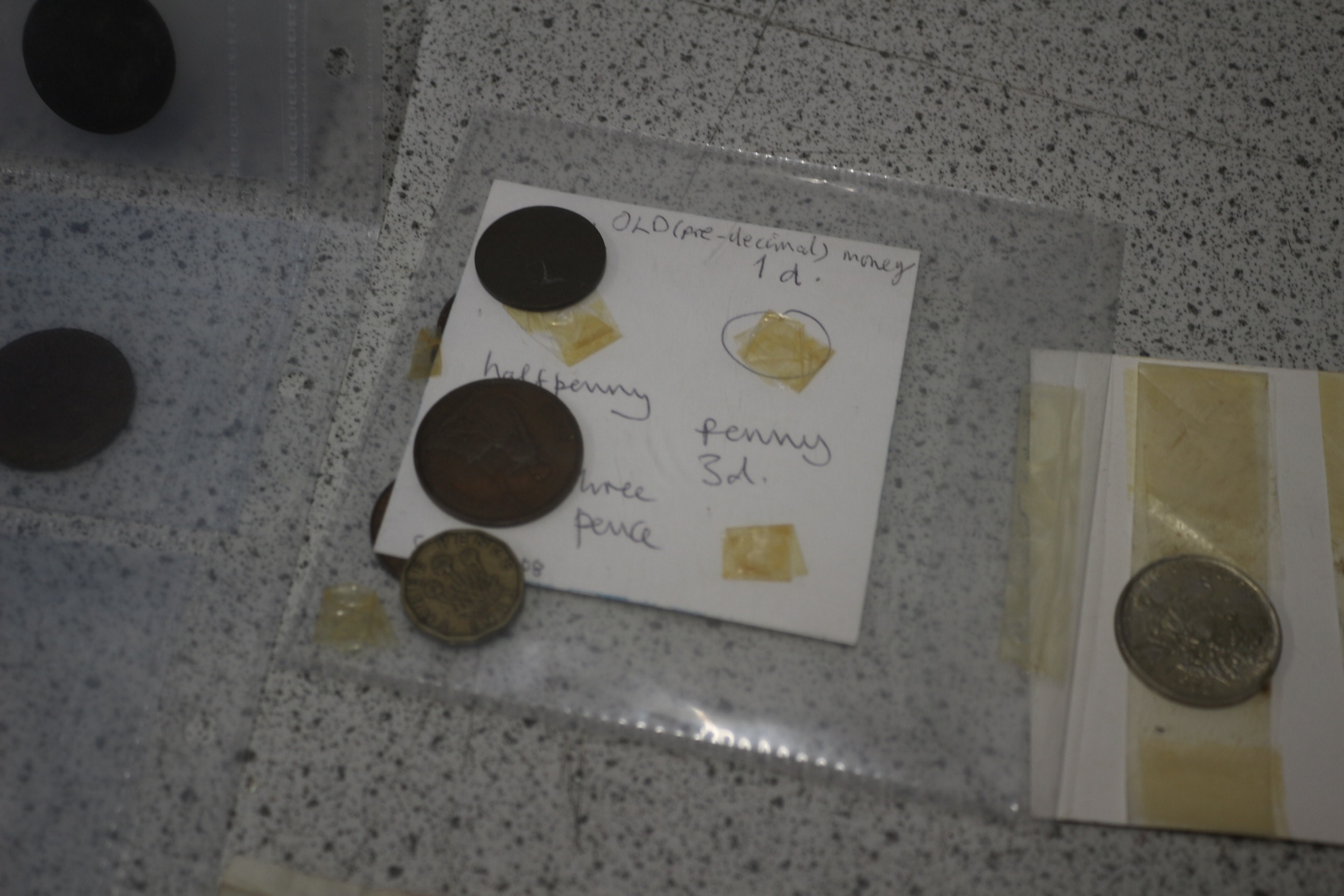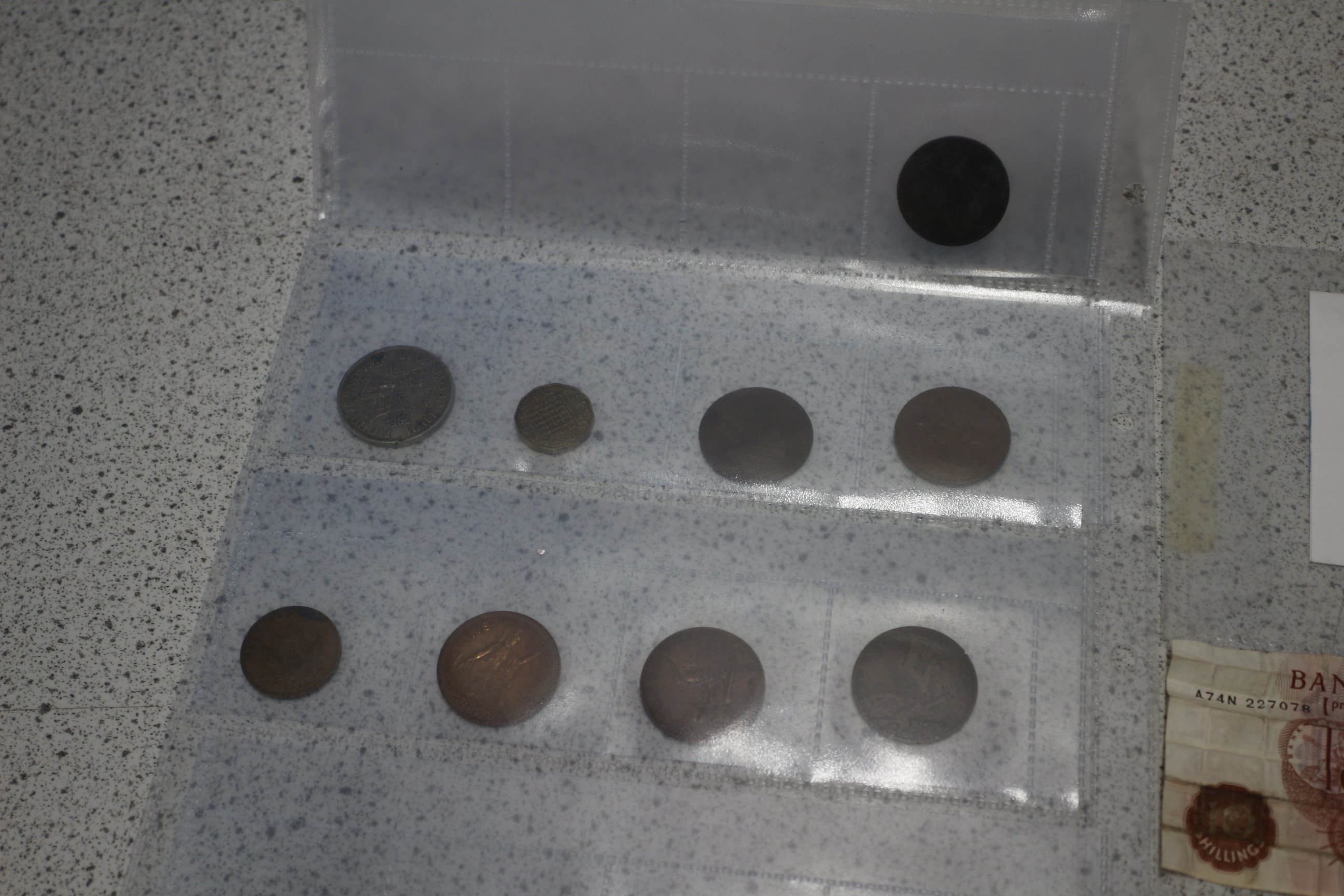 A diverse collection comprising British pre-decimal coinage and banknotes, alongside a group of French and other foreign coins. The British pre-decimal coinage includes approximately ten copper or bronze coins housed in a clear plastic sleeve, identified by an accompanying note listing “OLD (pre-decimal) money” and denominations such as “1d.”, “halfpenny, ” “penny, ” and “3d.” Additionally, three loose copper/bronze coins are present, one specifically labeled “Shave halfpenny.” The collection also features two circulated paper “BANK OF ENGLAND Ten shillings” banknotes, both depicting Queen Elizabeth II and bearing serial numbers A74N 227078 and C90N 571447. A group of four French coins is taped to a cardboard strip, consisting of two silver-toned and two brass/bronze pieces, with visible denominations of “20 CENTIMES” and “10 CENTIMES.” Finally, three additional loose coins are included: two silver-toned examples, one displaying a “10” and a lion design, and a darker metal coin with a crowned effigy.