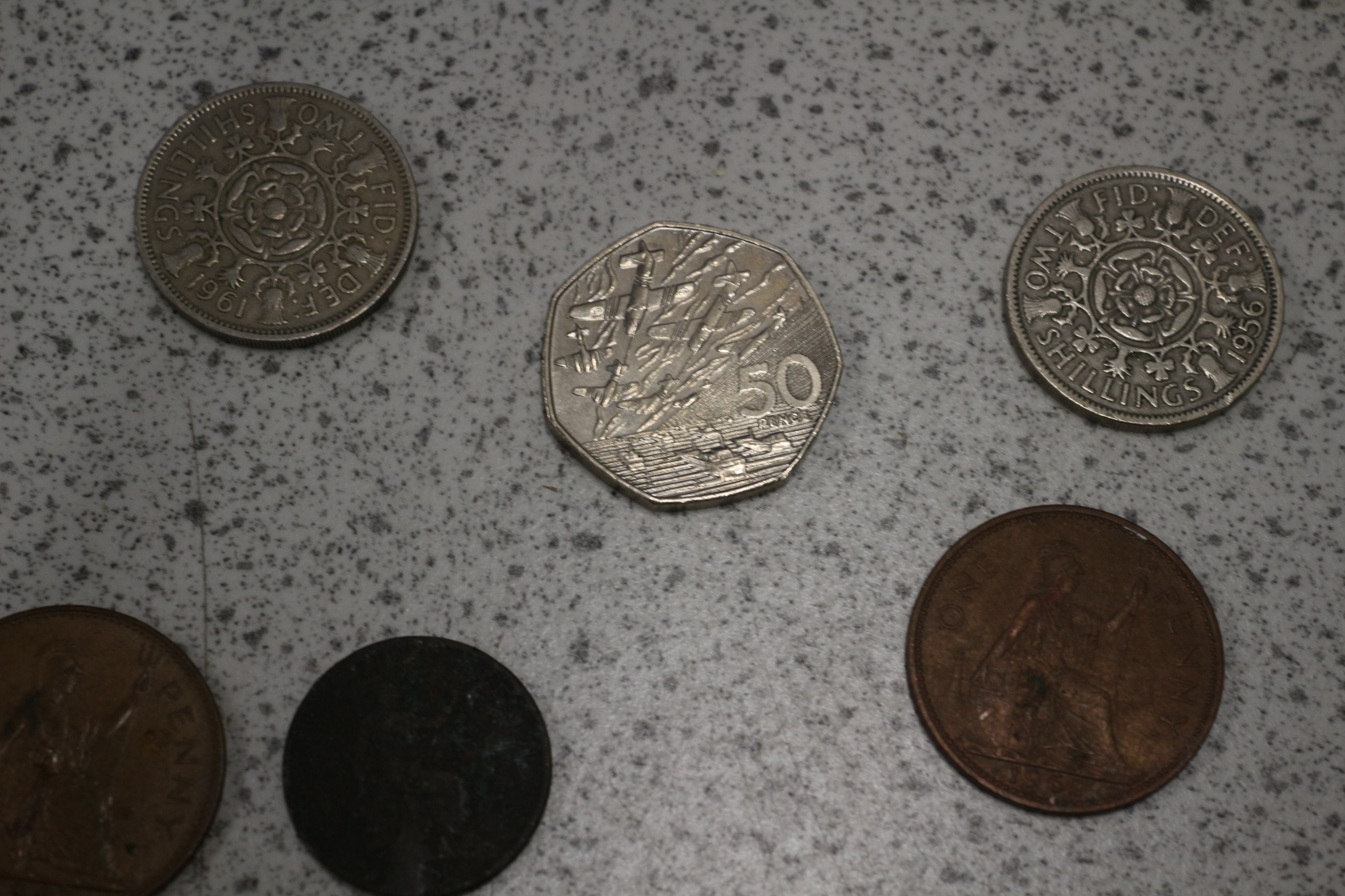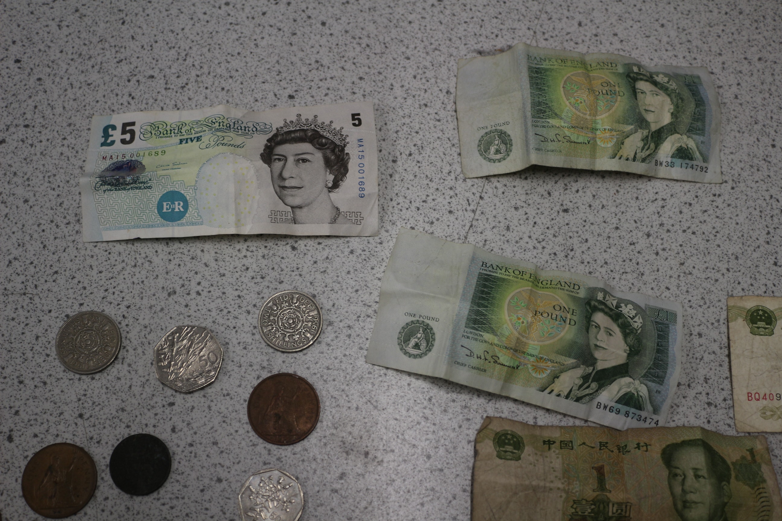 This collection comprises a group of international banknotes and coinage. The banknotes include one modern British £5 note and two £1 notes, both featuring Queen Elizabeth II. Also present is a group of Chinese 1 Yuan notes, marked “中国人民银行” (People’s Bank of China) and “壹圆” (one yuan), depicting Mao Zedong. The coinage is diverse, featuring a group of various British issues from different periods, including shillings, pence, and a 50-pence piece. Additionally, there are two modern commemorative silver-toned £5 coins, dated 1997 (“Memory of Diana Princess of Wales”) and 1998 (“The Prince’s Trust”), with some still sealed in protective plastic. The lot also includes a group of multiple older, worn, primarily copper-toned coins of indeterminate origin. The materials consist of paper for the banknotes and various metals for the coins.
