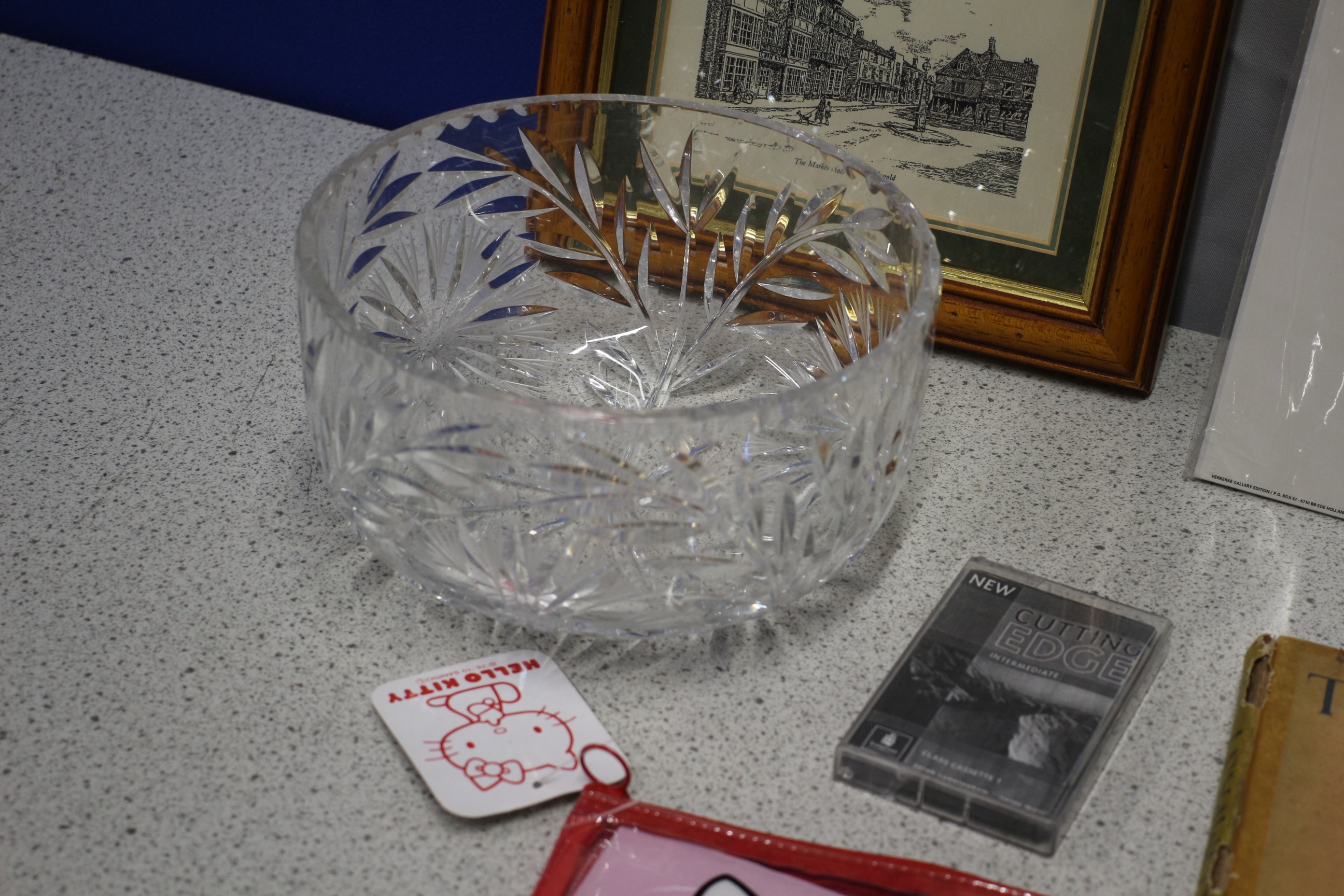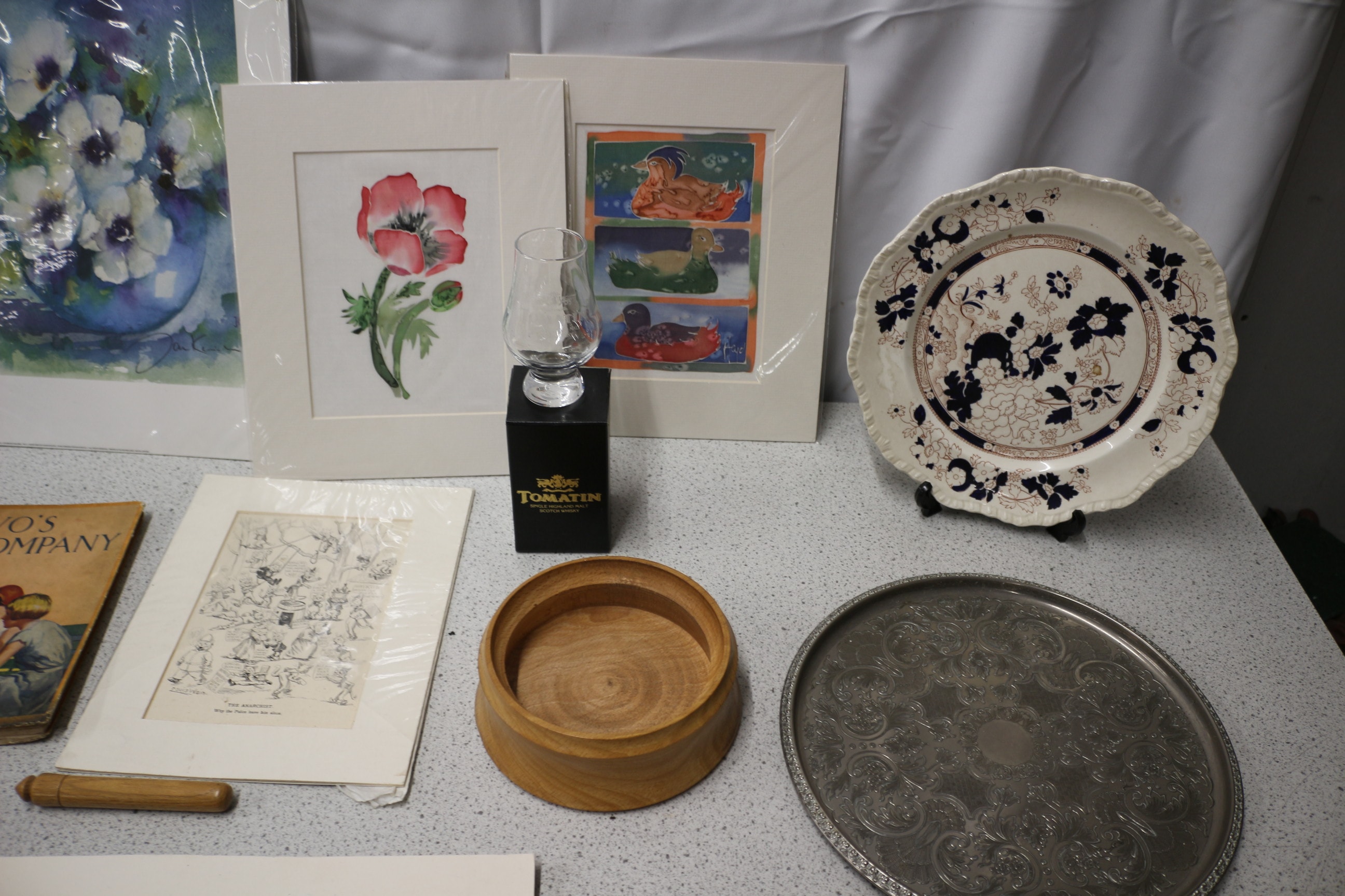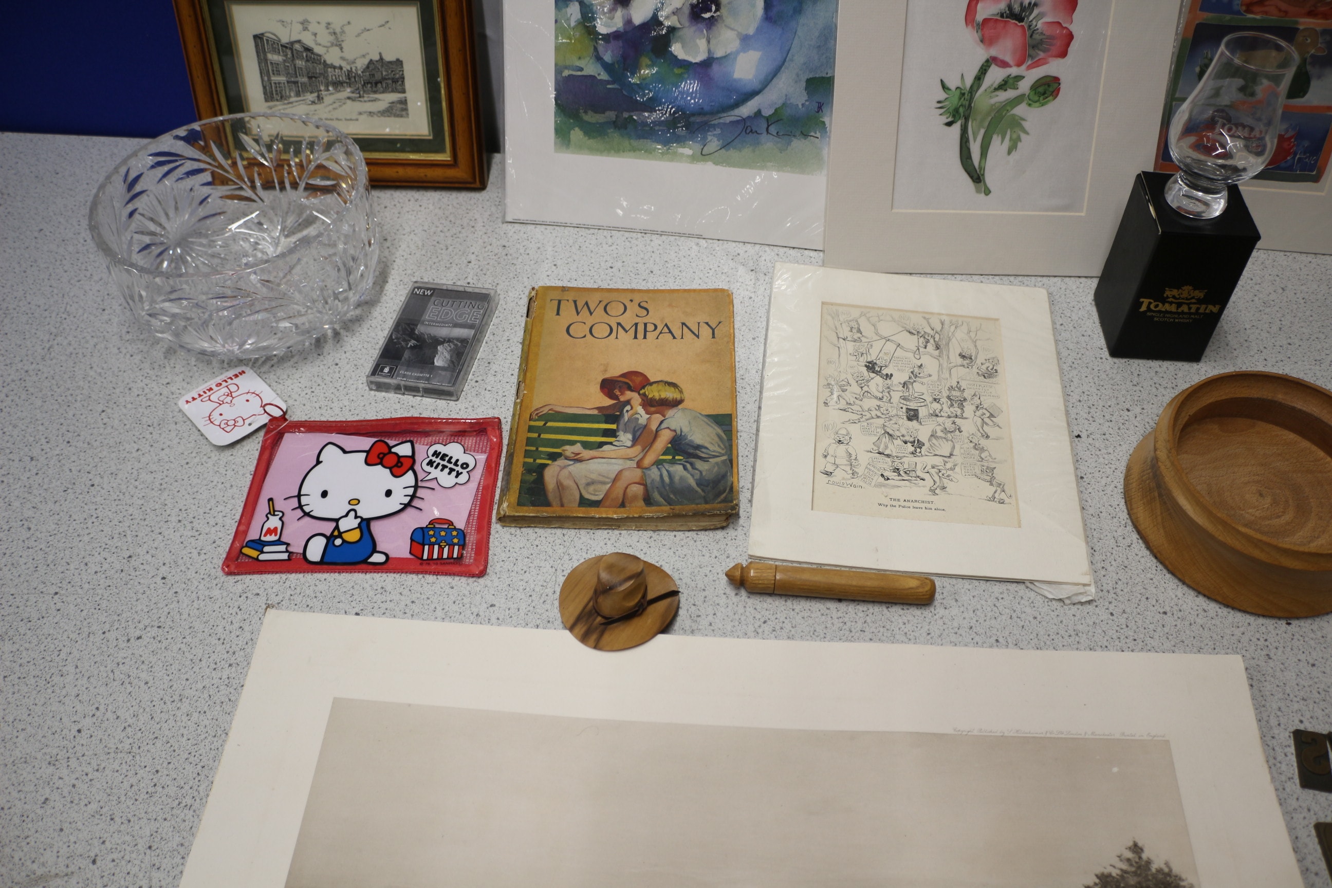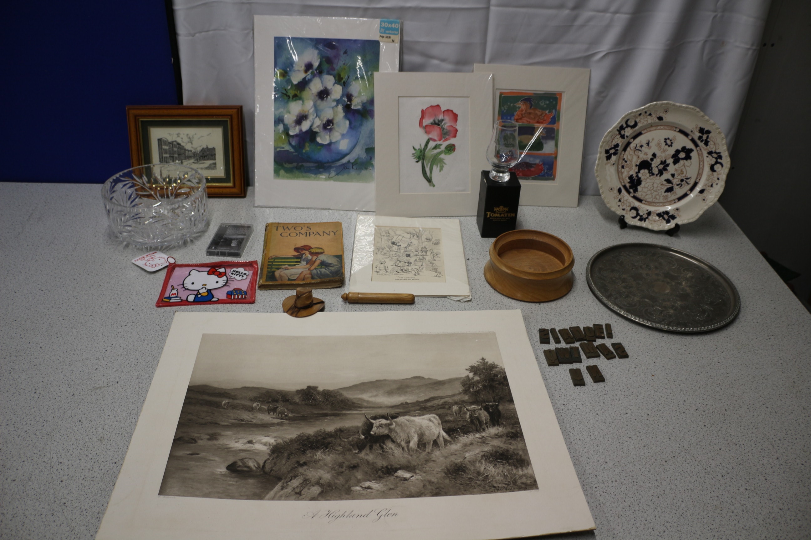 This lot comprises a diverse assortment of decorative and collectible items. Prominent among these is a large monochrome print titled “A Highland Glen, ” depicting cattle in a landscape. Also included are a matted watercolor-style print of blue flowers, branded “verkerke” with retail pricing, a framed print of a red poppy, and a framed Louis Wain illustration of anthropomorphic cats titled “THE ANARCHIST. Why the Police leave him alone.” Accompanying these are a traditional cut crystal bowl, a blue and white scalloped ceramic transferware plate, and an embossed silver-plated tray. Smaller items consist of a modern Tomatin whisky tasting glass on a branded stand, a vintage hardcover book titled “TWO’S COMPANY, ” a “NEW” “CUTTING EDGE INTERMEDIATE” audio cassette by Sarah Cunningham, a Hello Kitty coin purse and small tag, a collection of brass-toned printing type, a turned wooden bowl, and two small wooden carved objects.