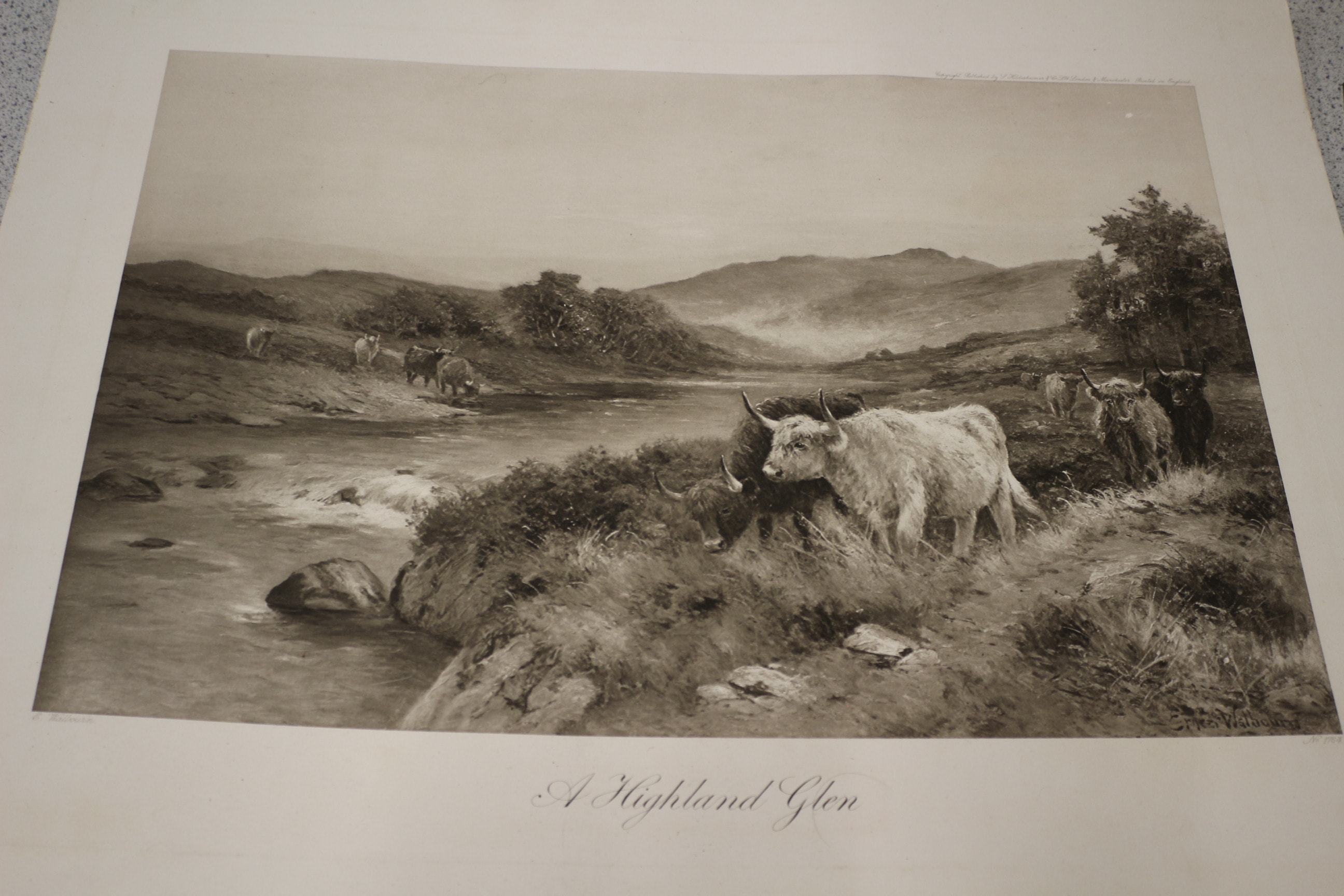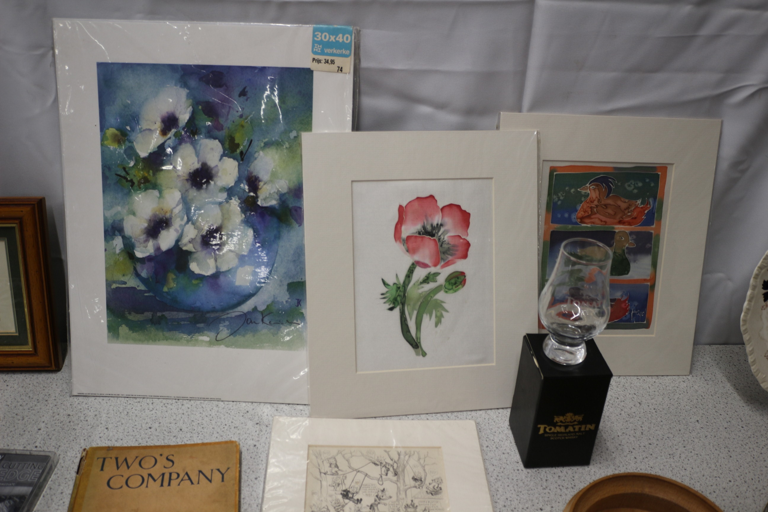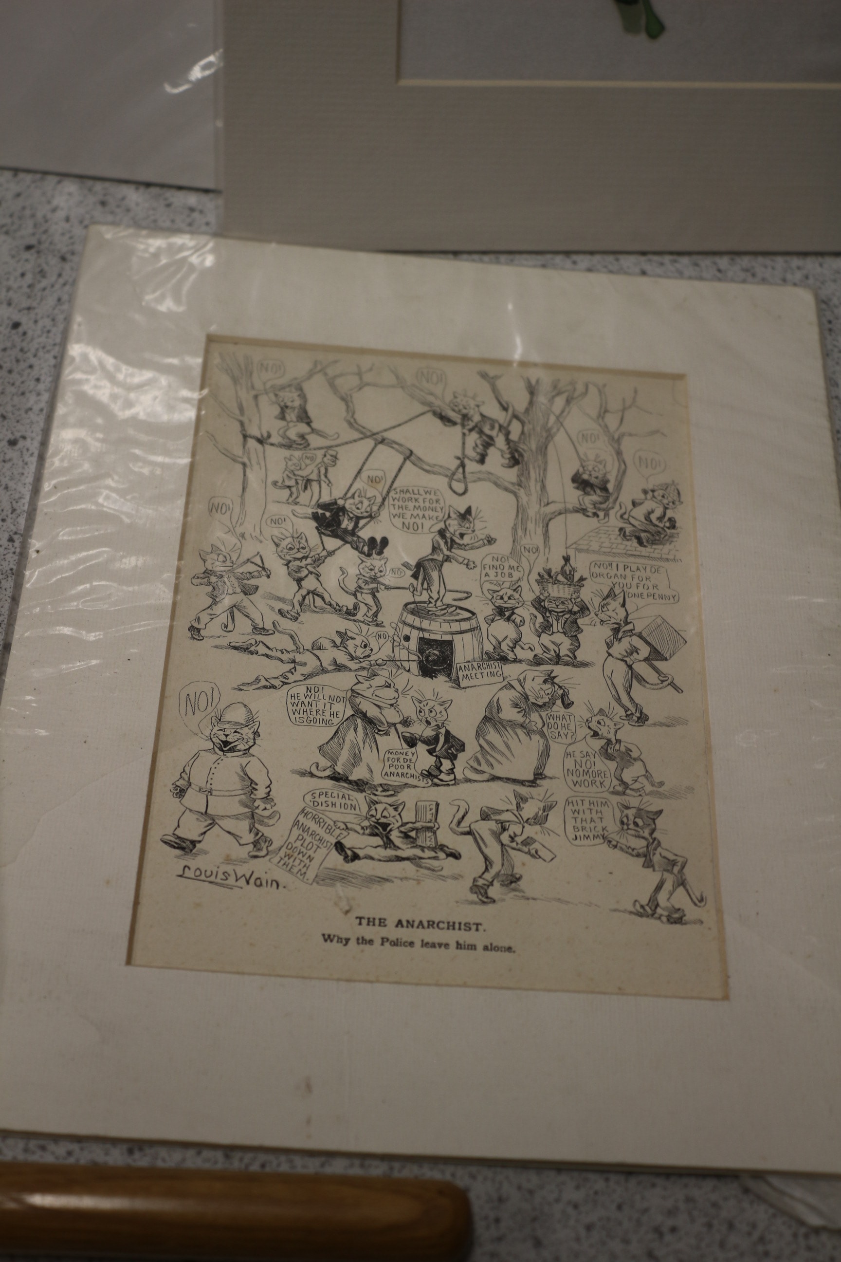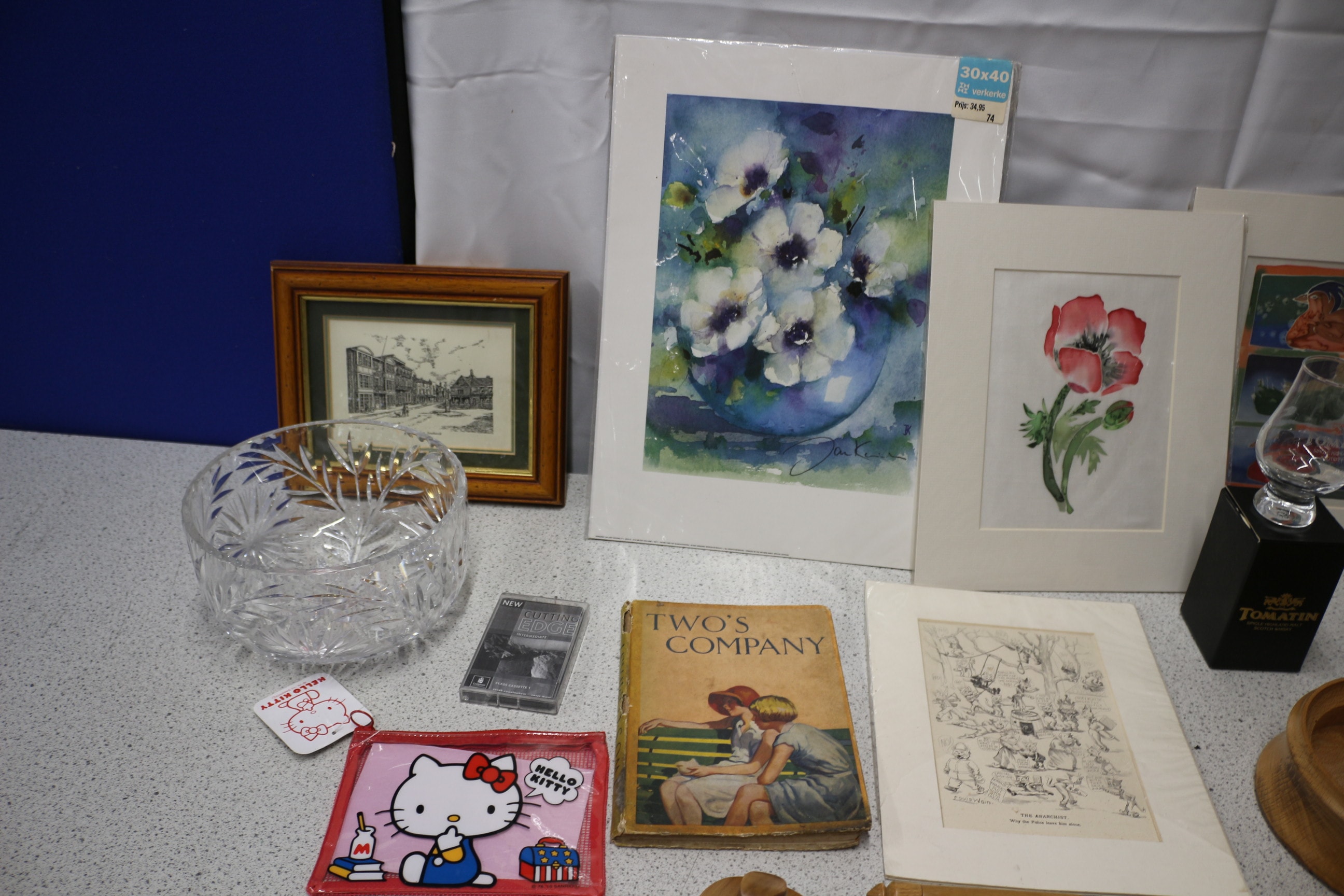 This lot comprises a diverse assortment of decorative and collectible items. Prominent among these is a large monochrome print titled “A Highland Glen, ” depicting cattle in a landscape. Also included are a matted watercolor-style print of blue flowers, branded “verkerke” with retail pricing, a framed print of a red poppy, and a framed Louis Wain illustration of anthropomorphic cats titled “THE ANARCHIST. Why the Police leave him alone.” Accompanying these are a traditional cut crystal bowl, a blue and white scalloped ceramic transferware plate, and an embossed silver-plated tray. Smaller items consist of a modern Tomatin whisky tasting glass on a branded stand, a vintage hardcover book titled “TWO’S COMPANY, ” a “NEW” “CUTTING EDGE INTERMEDIATE” audio cassette by Sarah Cunningham, a Hello Kitty coin purse and small tag, a collection of brass-toned printing type, a turned wooden bowl, and two small wooden carved objects.