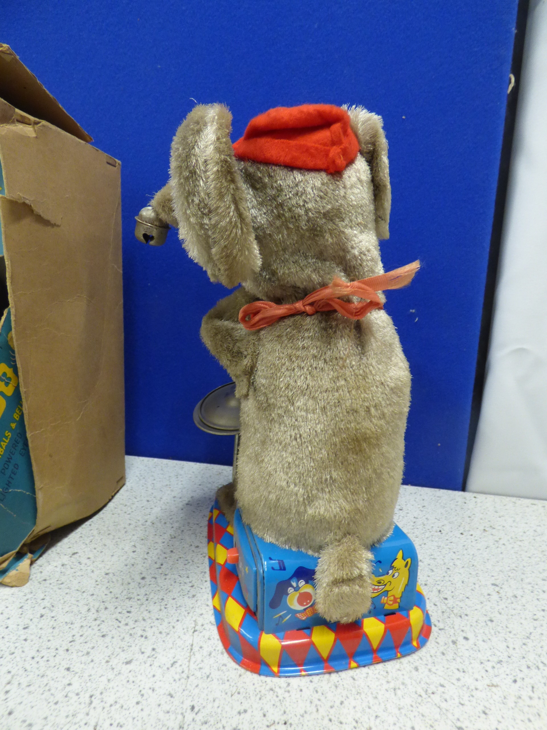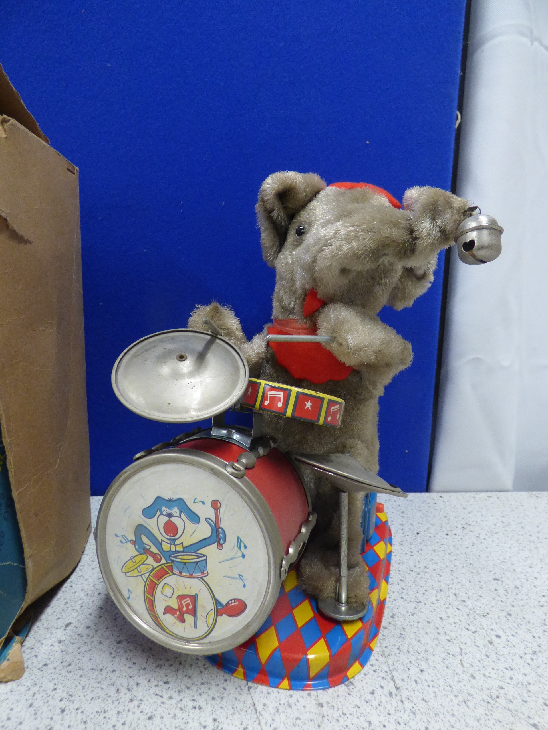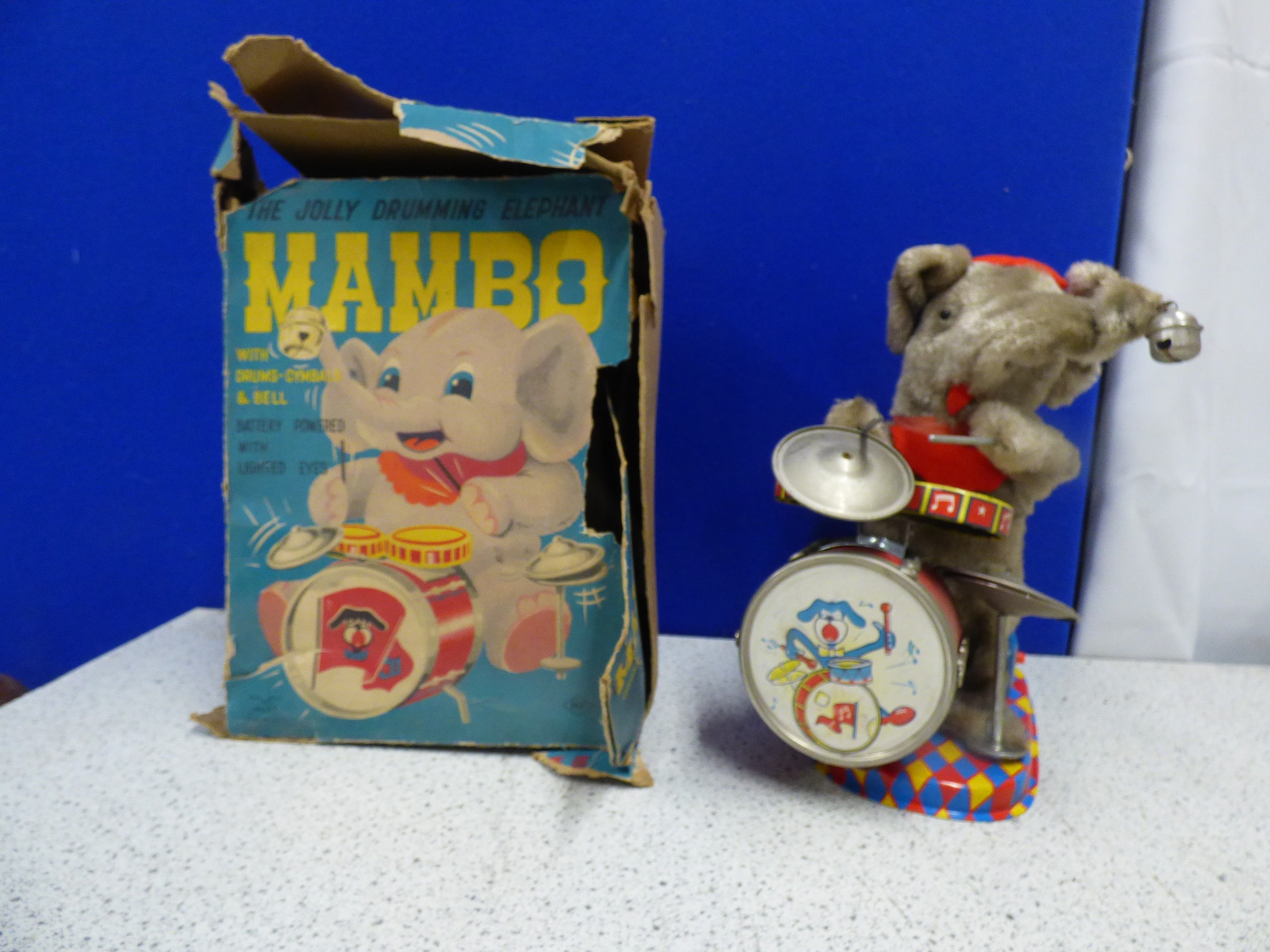 A grey plush elephant toy wearing a red hat and scarf, playing drums and cymbals on a multi-coloured base with an ‘ON OFF’ switch, accompanied by its original box labelled “THE JOLLY DRUMMING ELEPHANT MAMBO” and noted as “BATTERY POWERED WITH LIGHTED EYES”. Untested. Box AF