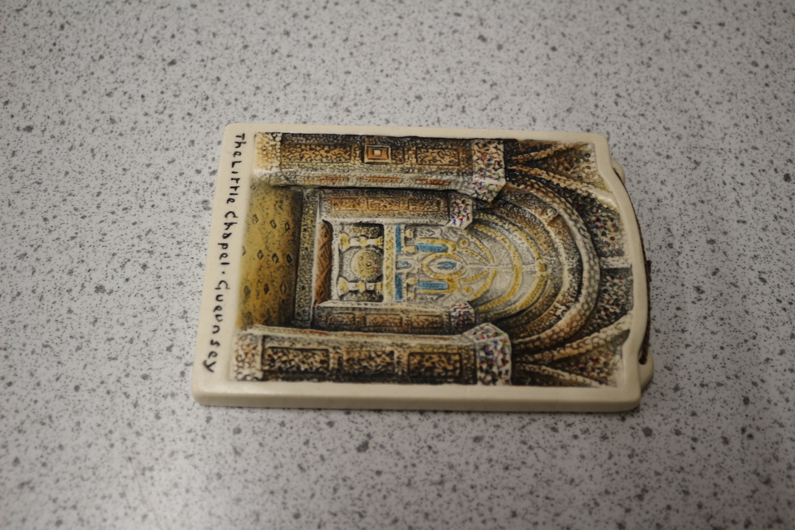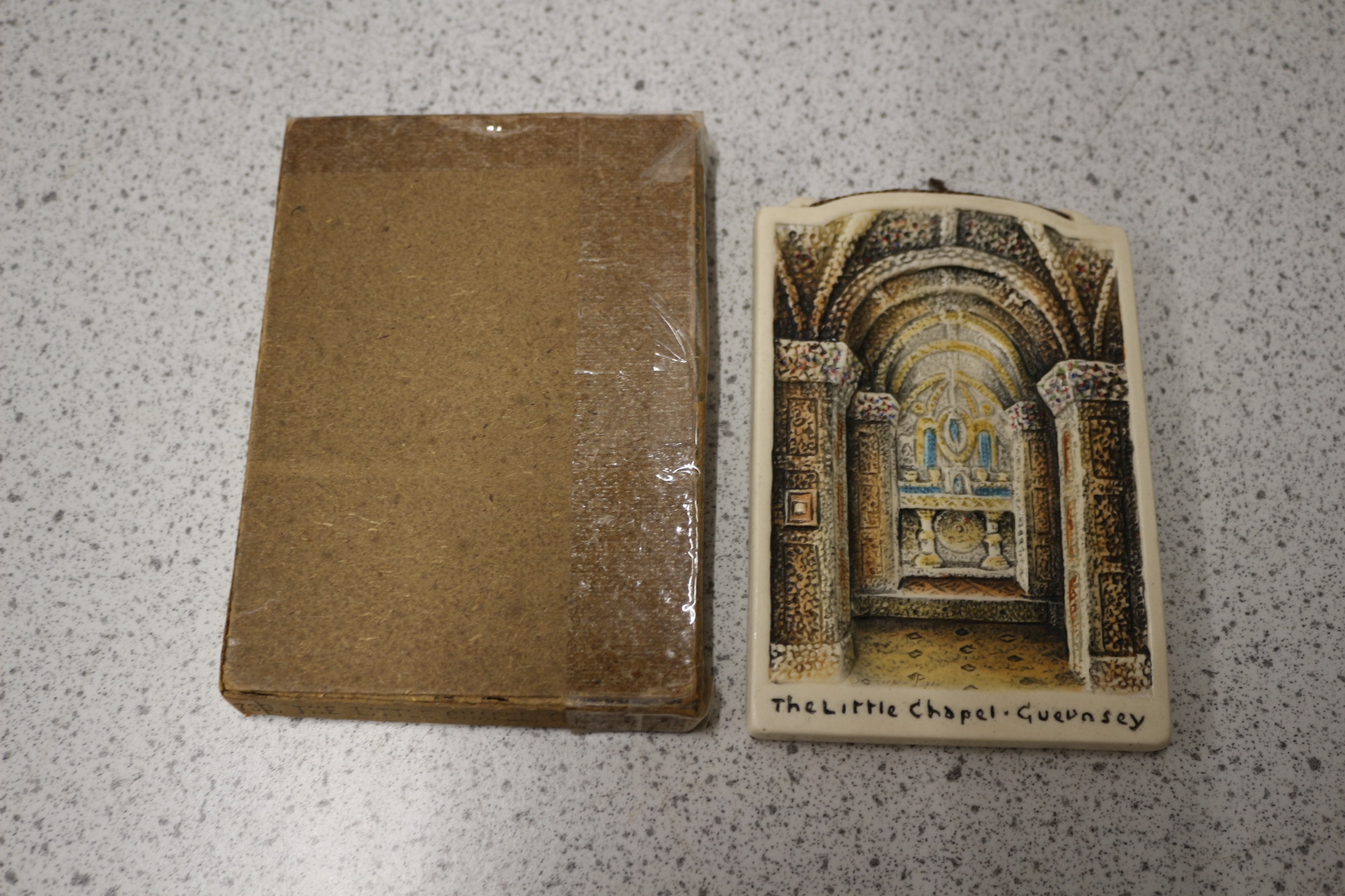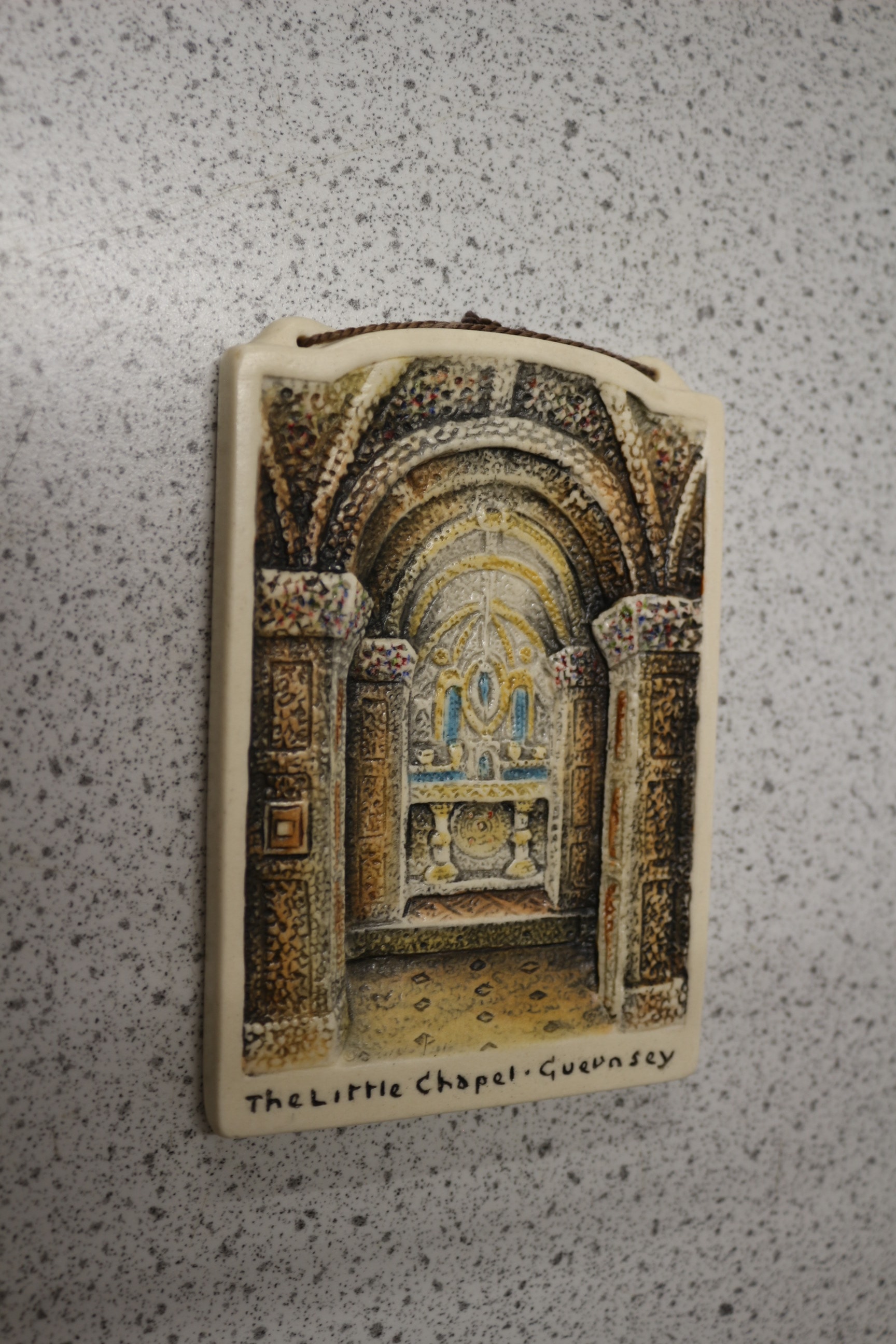 A rectangular decorative wall plaque, likely crafted from a ceramic-like material such as plaster or resin, featuring a detailed, hand-painted relief sculpture. The artwork depicts the ornate interior of a chapel, characterized by architectural arches, columns, and an intricate altar, executed in a rustic or folk art style. Inscribed on the lower front in black script is “The Little Chapel · Guernsey”. A small string loop is affixed to the top for hanging. The plaque is accompanied by its plain brown cardboard packaging, which is factory-sealed in clear plastic film. 12.5cm