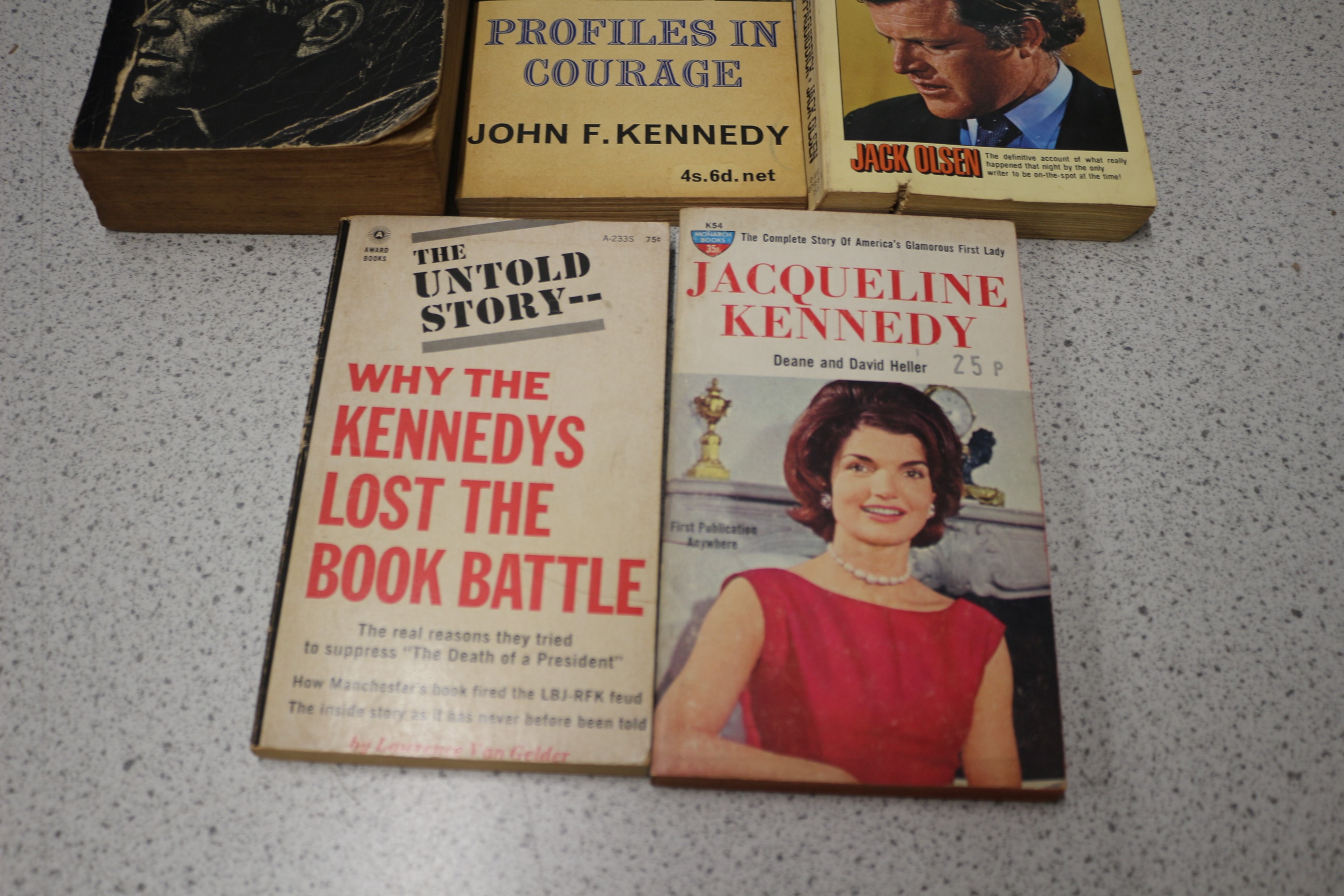 A collection of seven books related to John F. Kennedy and the Kennedy family, including ‘Profiles in Courage’ and ‘The Dark Side of Camelot’.