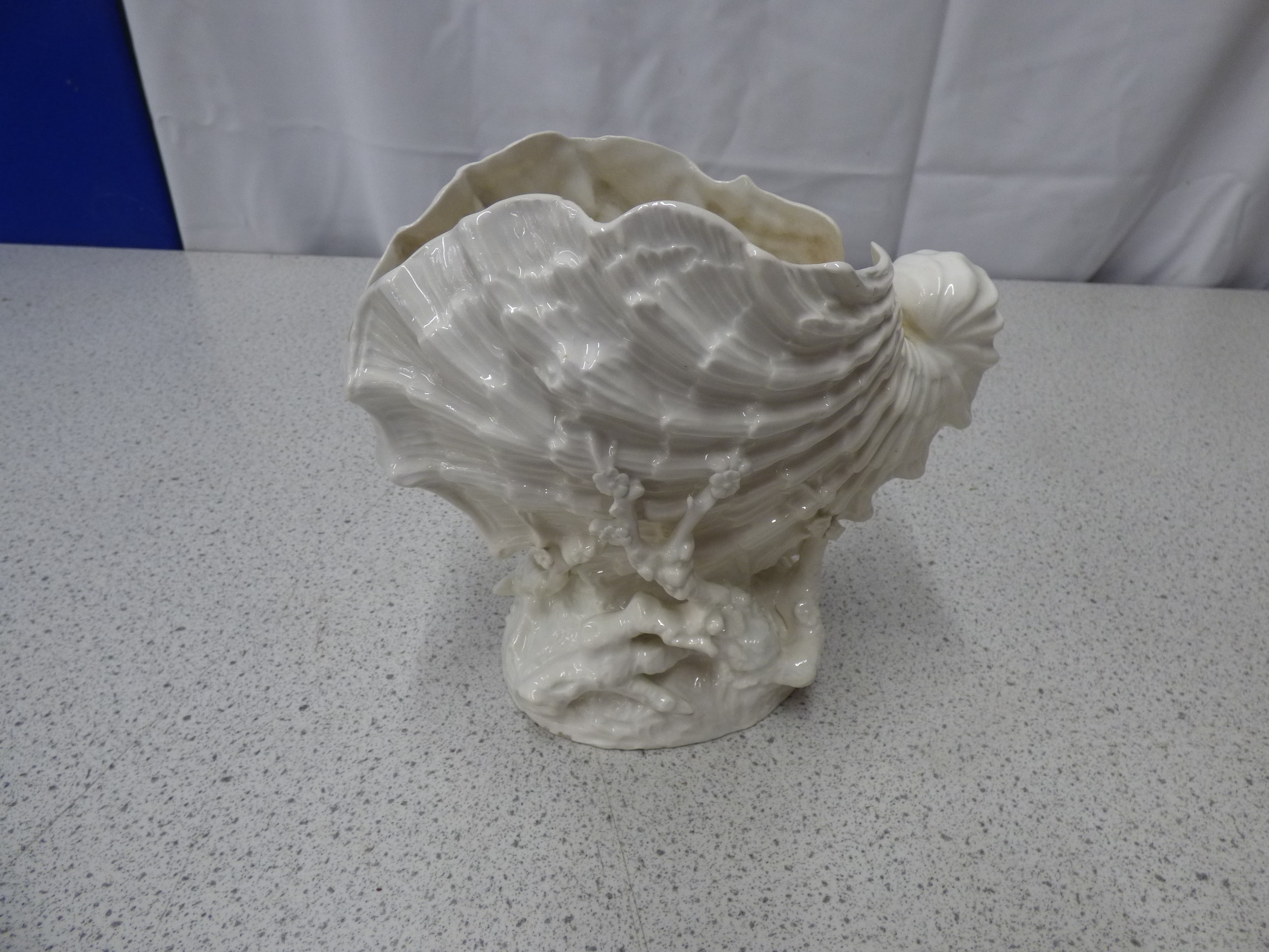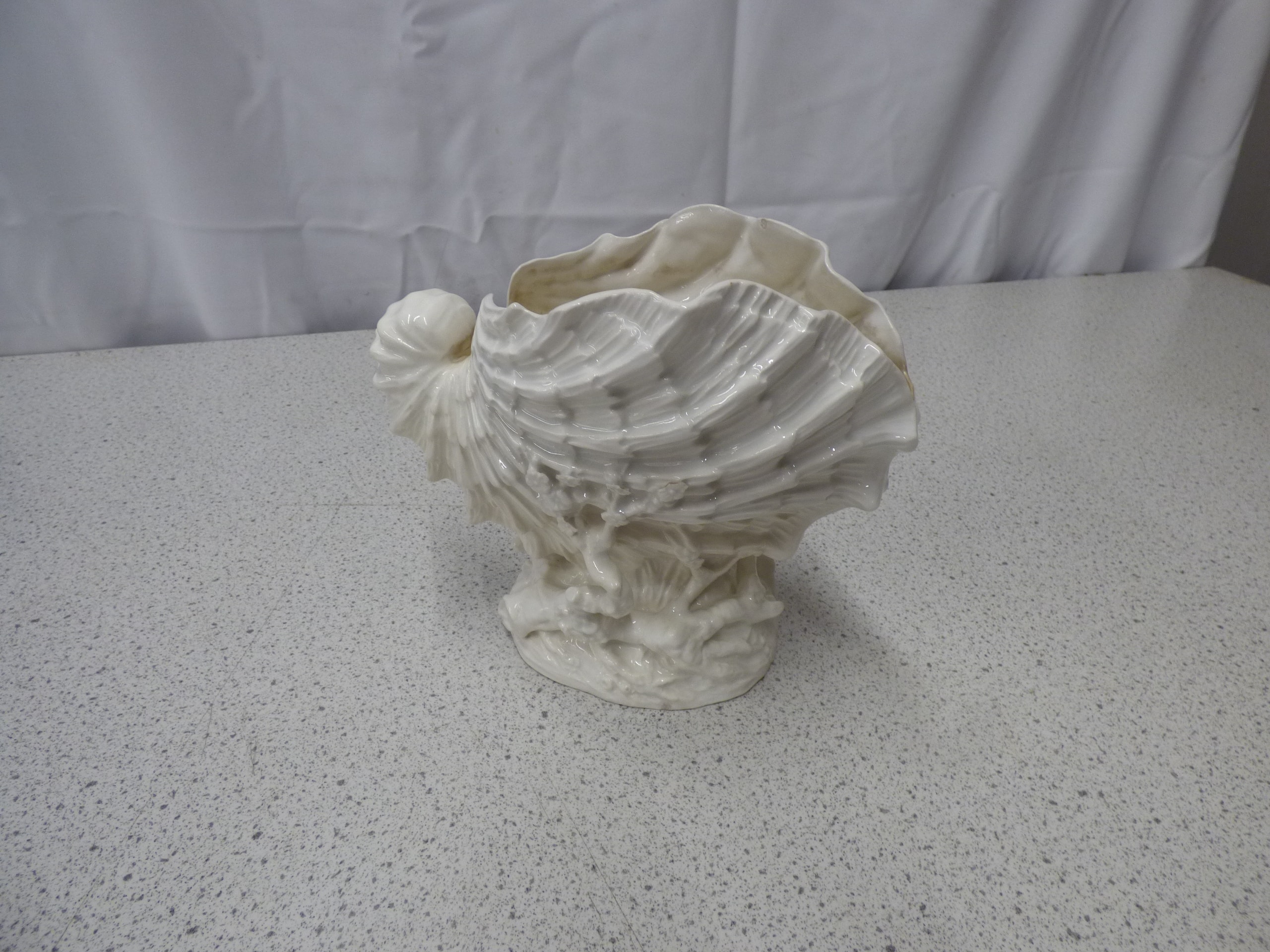 A Belleek Nautilus white, shell-shaped decorative bowl or planter with a glossy finish. 18.5cm Tall