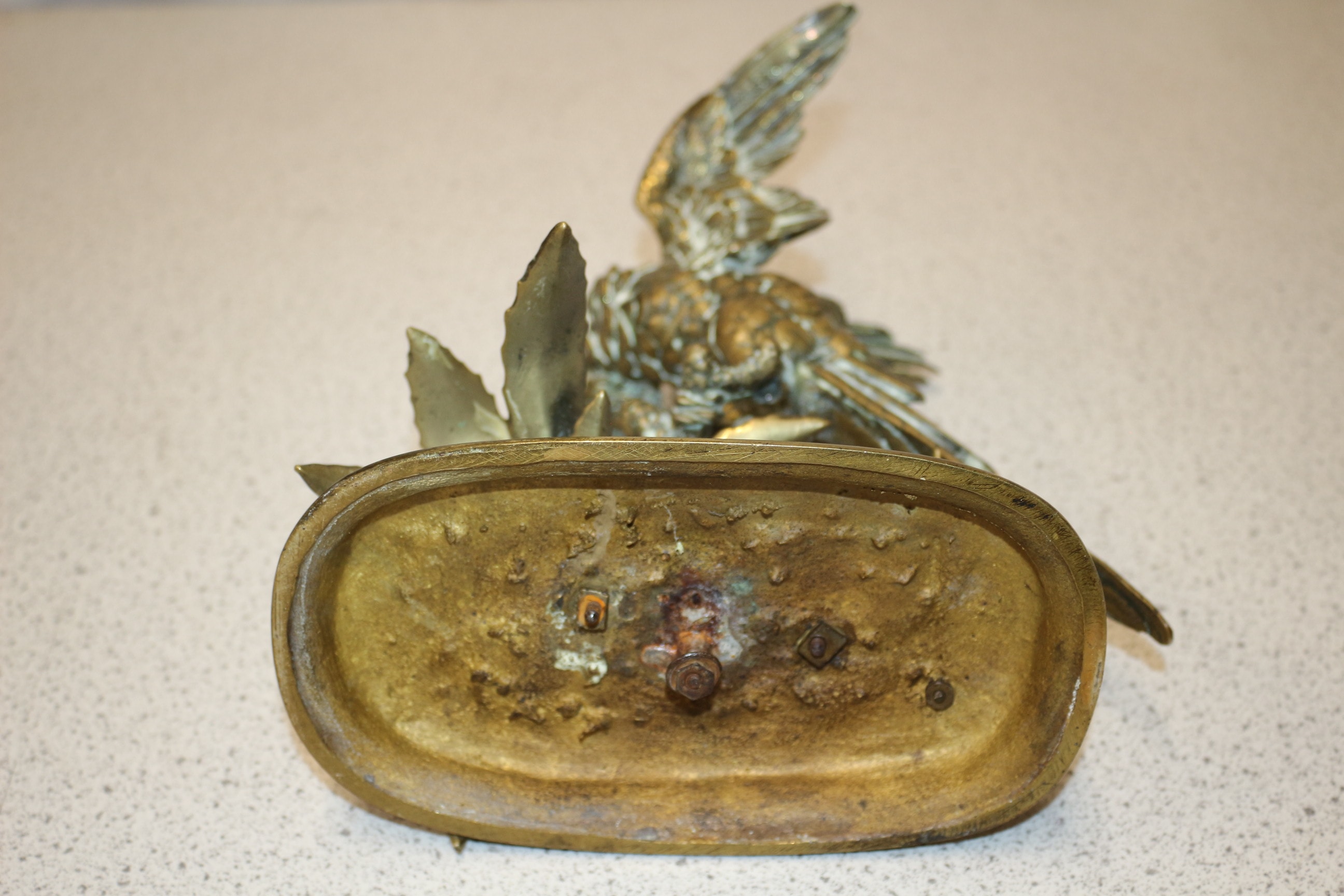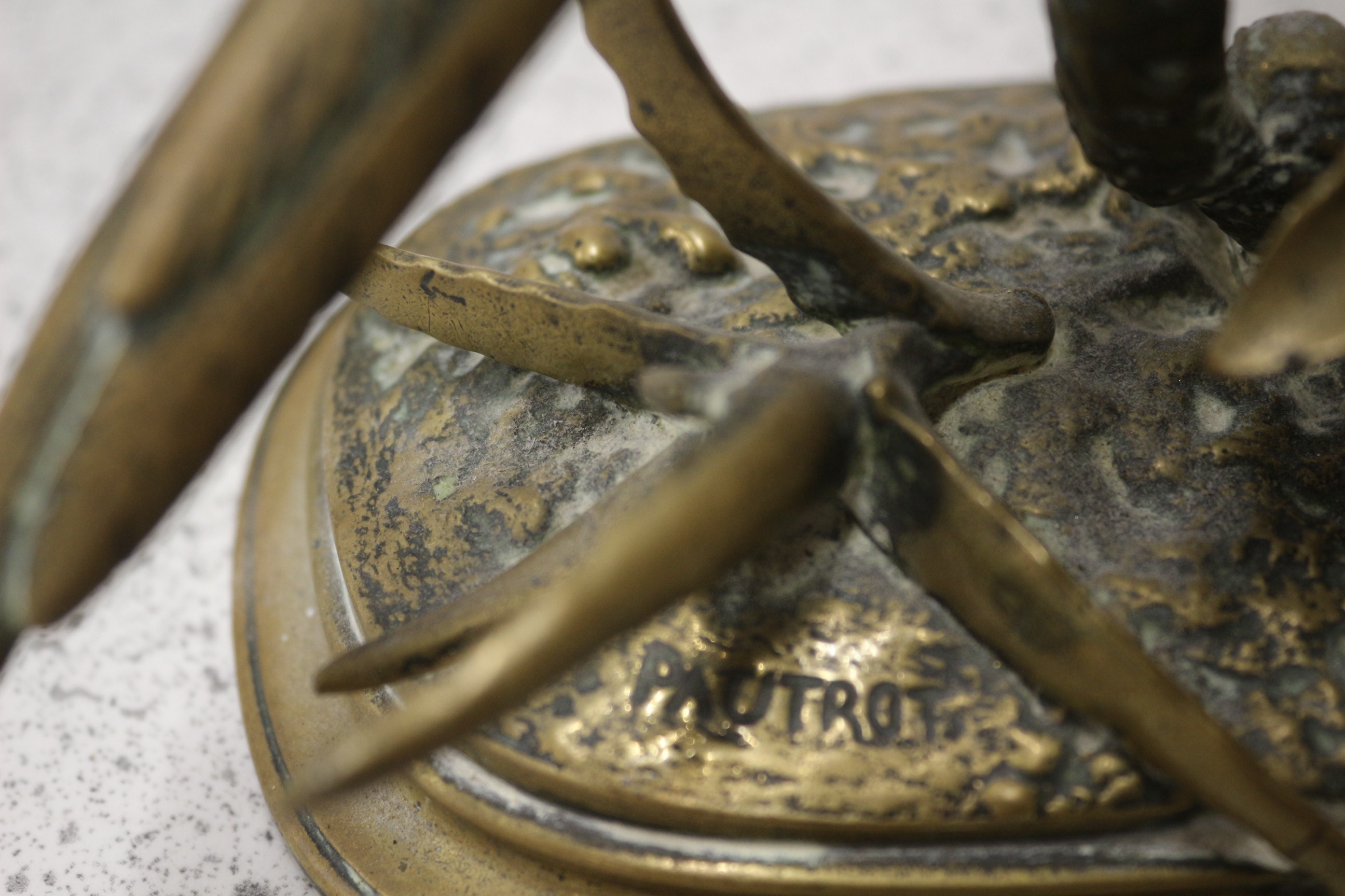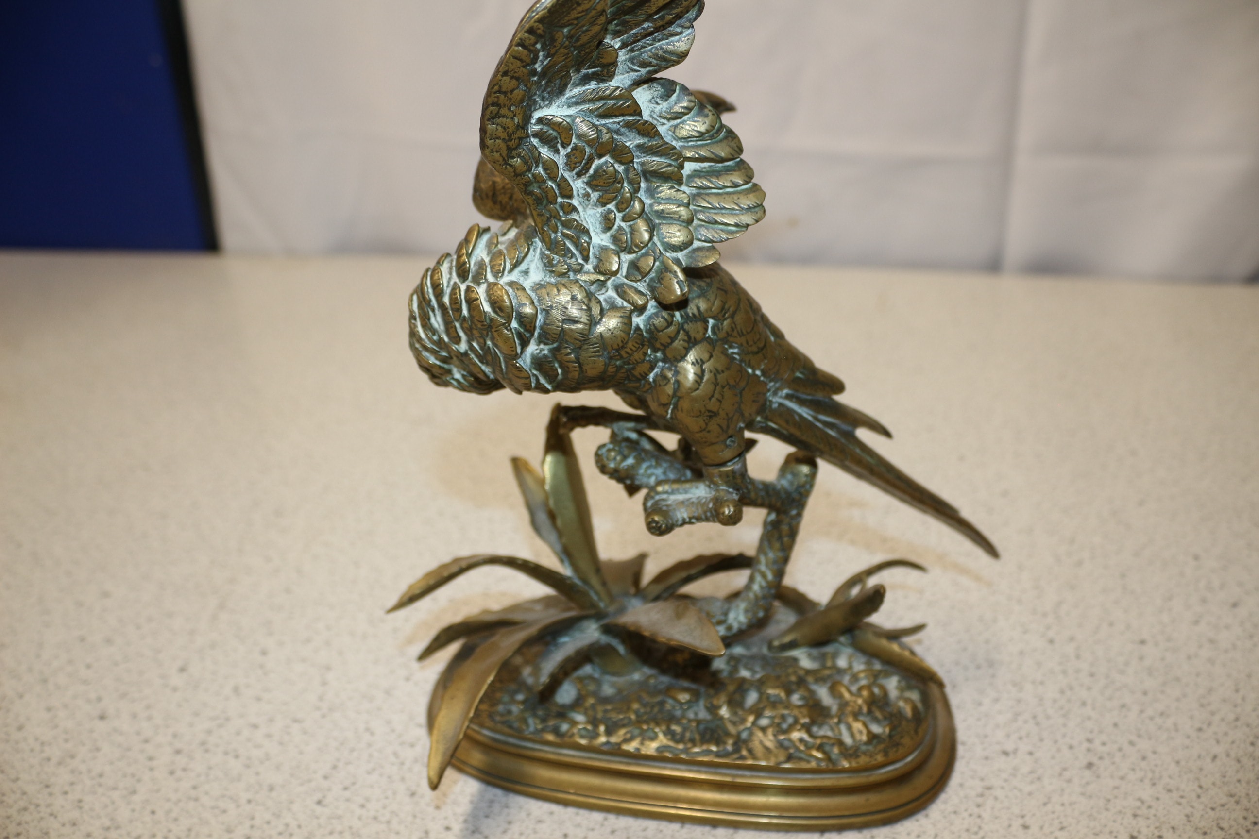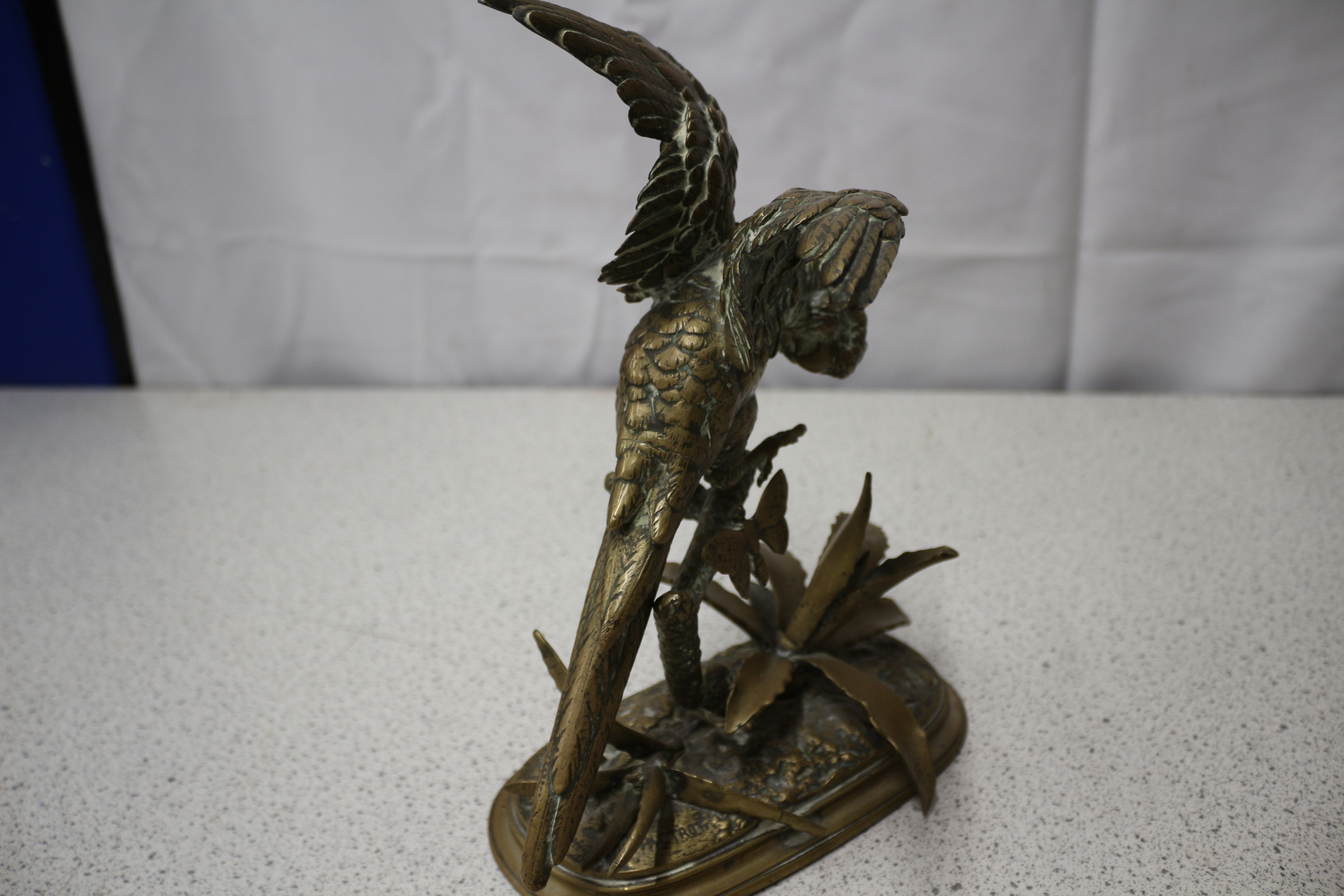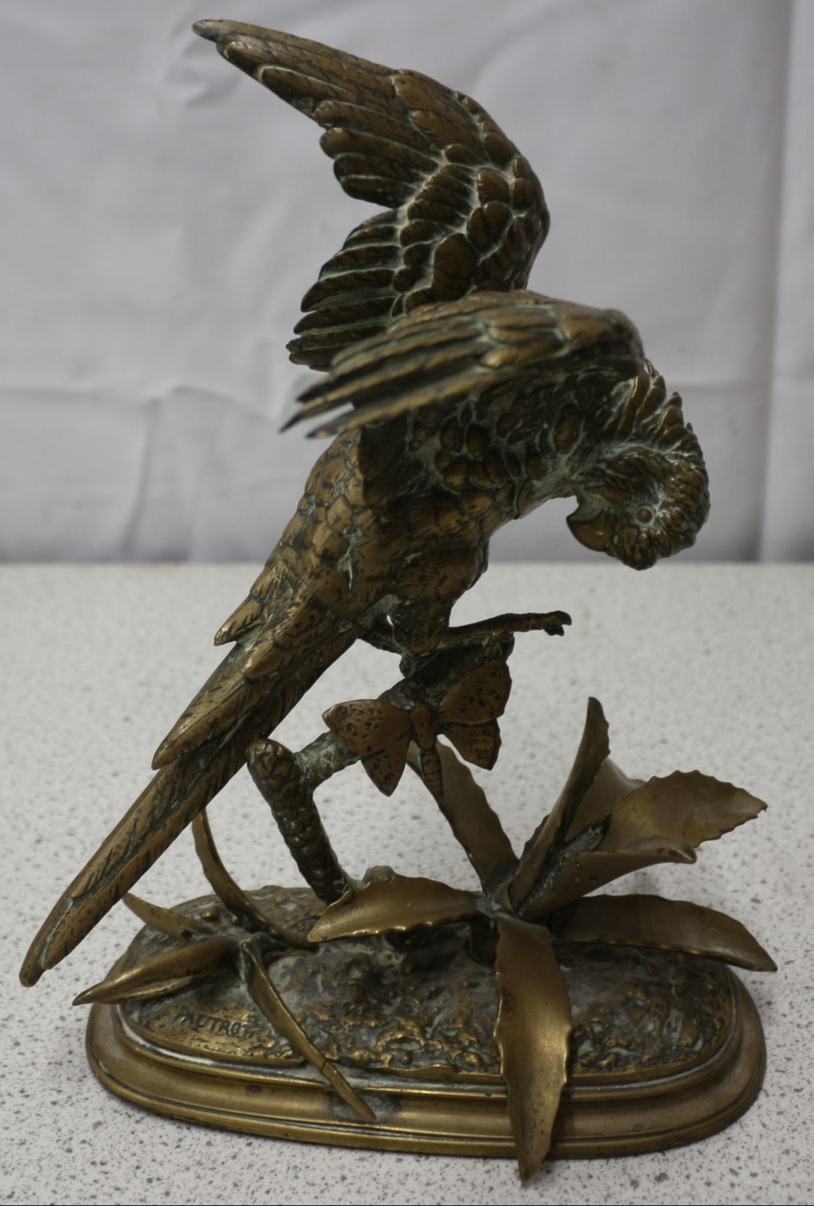 A single brass statue depicting a parrot or macaw perched on a branch with foliage, featuring an aged patina and inscribed “PAUTROT” on its oval base.