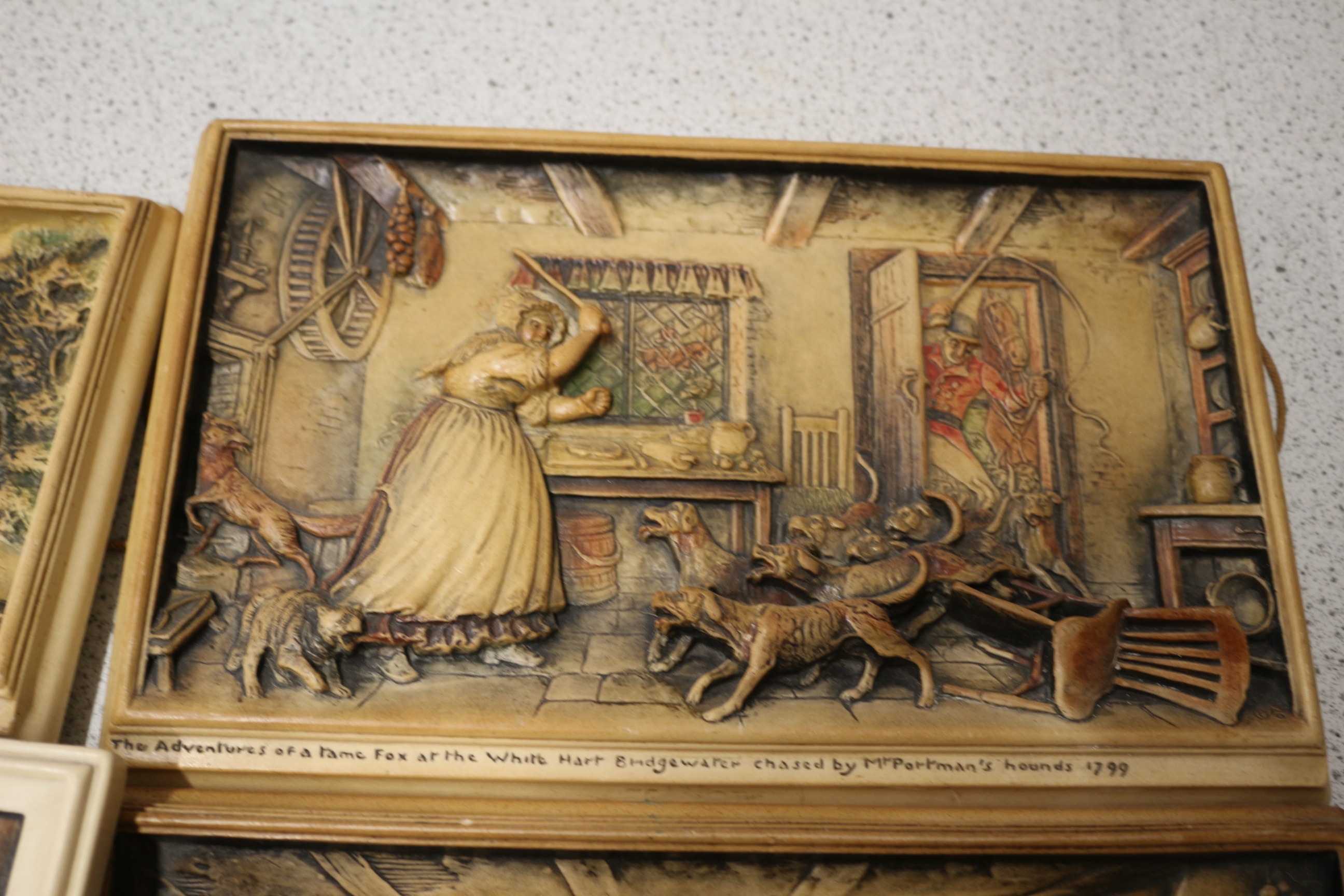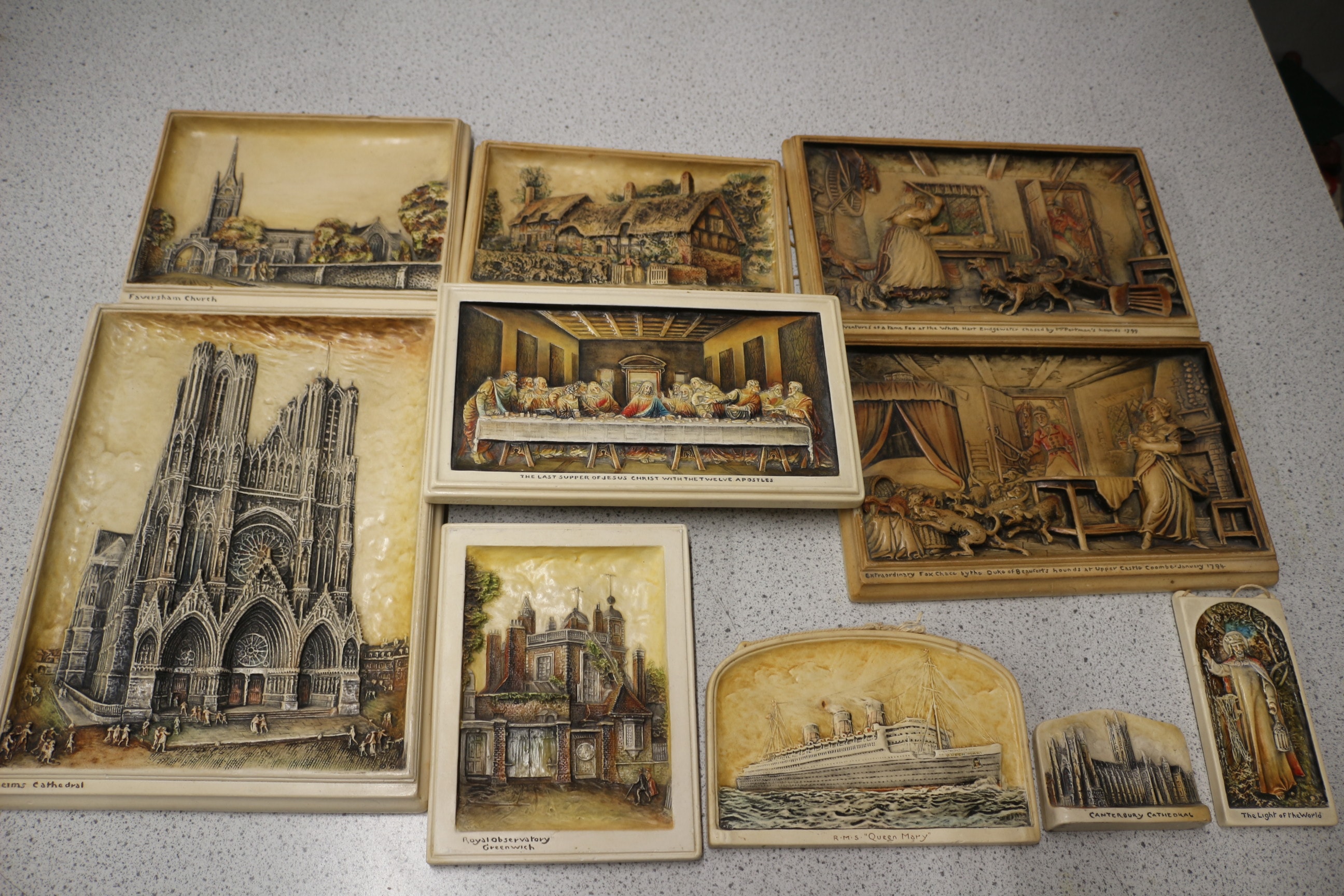A collection of 10 framed relief Ivorex plaques, primarily in cream, brown, and grey tones with accents of green, red, and blue, depicting various historical scenes and buildings, with visible labels including ‘Faversham Church’, ‘Ann Hathaway’s Cottage, Shottery’, ‘The Adventures of a Feme Fox at the White Hart Bridgewater chased by Mr Portmans hounds 1799’, ‘Rheims Cathedral’, ‘THE LAST SUPPER OF JESUS CHRIST WITH THE TWELVE APOSTLES’, ‘Extraordinary Fox Chace by the Duke of Beauforts hounds at Upper Castle Coombe January 1794’, ‘Royal Observatory Greenwich’, ‘R.M.S. “Queen Mary”‘, ‘CANTERBURY CATHEDRAL’, and ‘The Light of the World’.