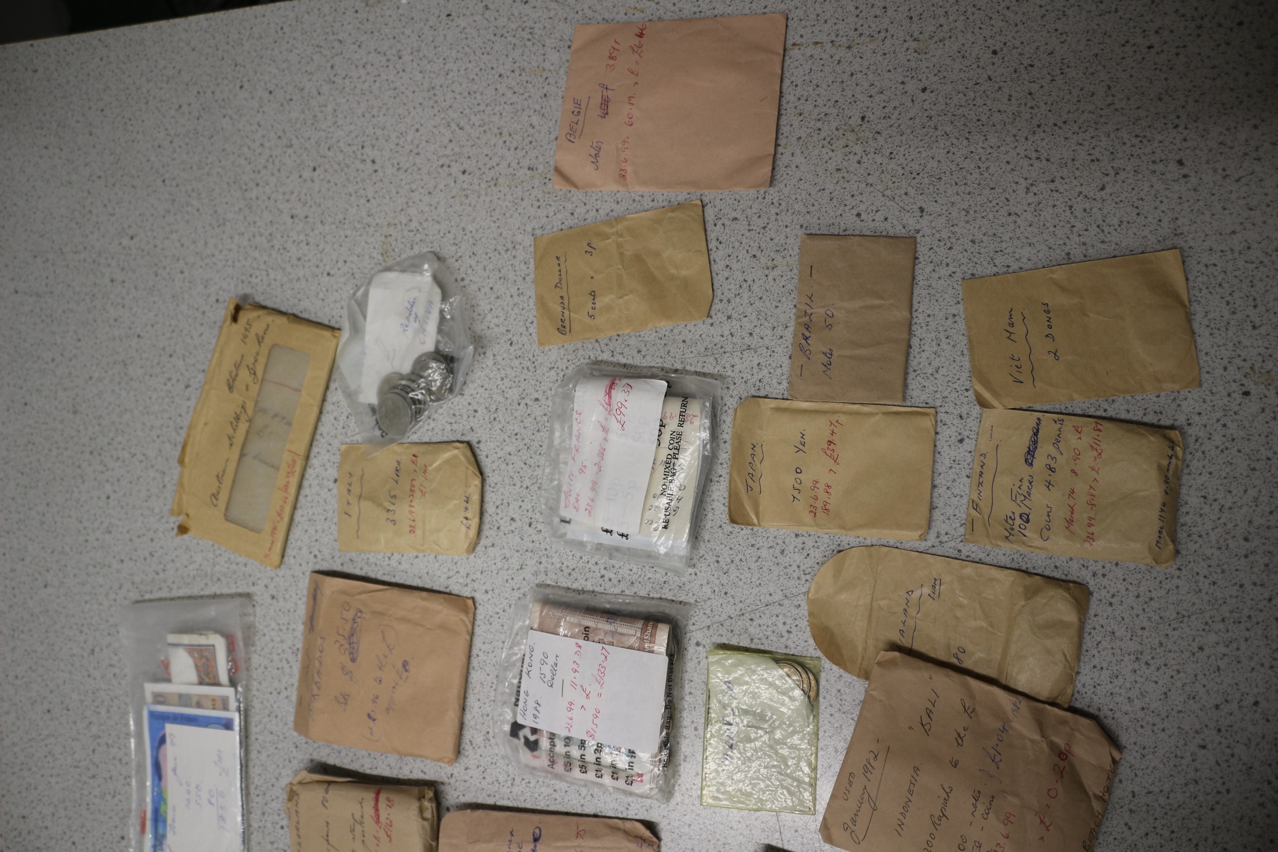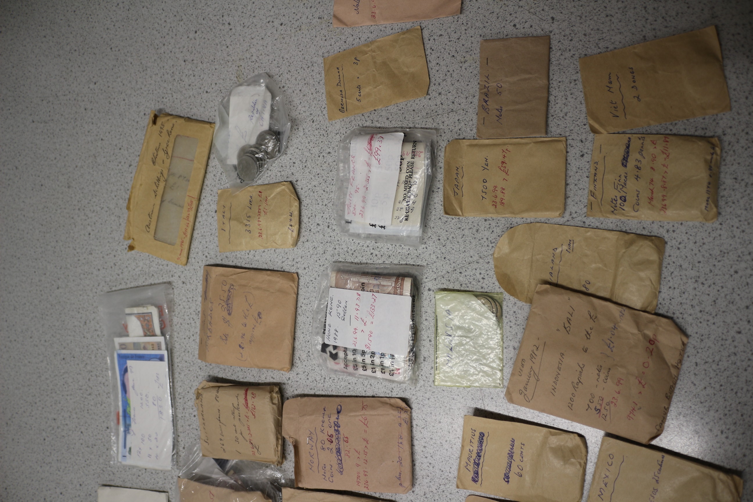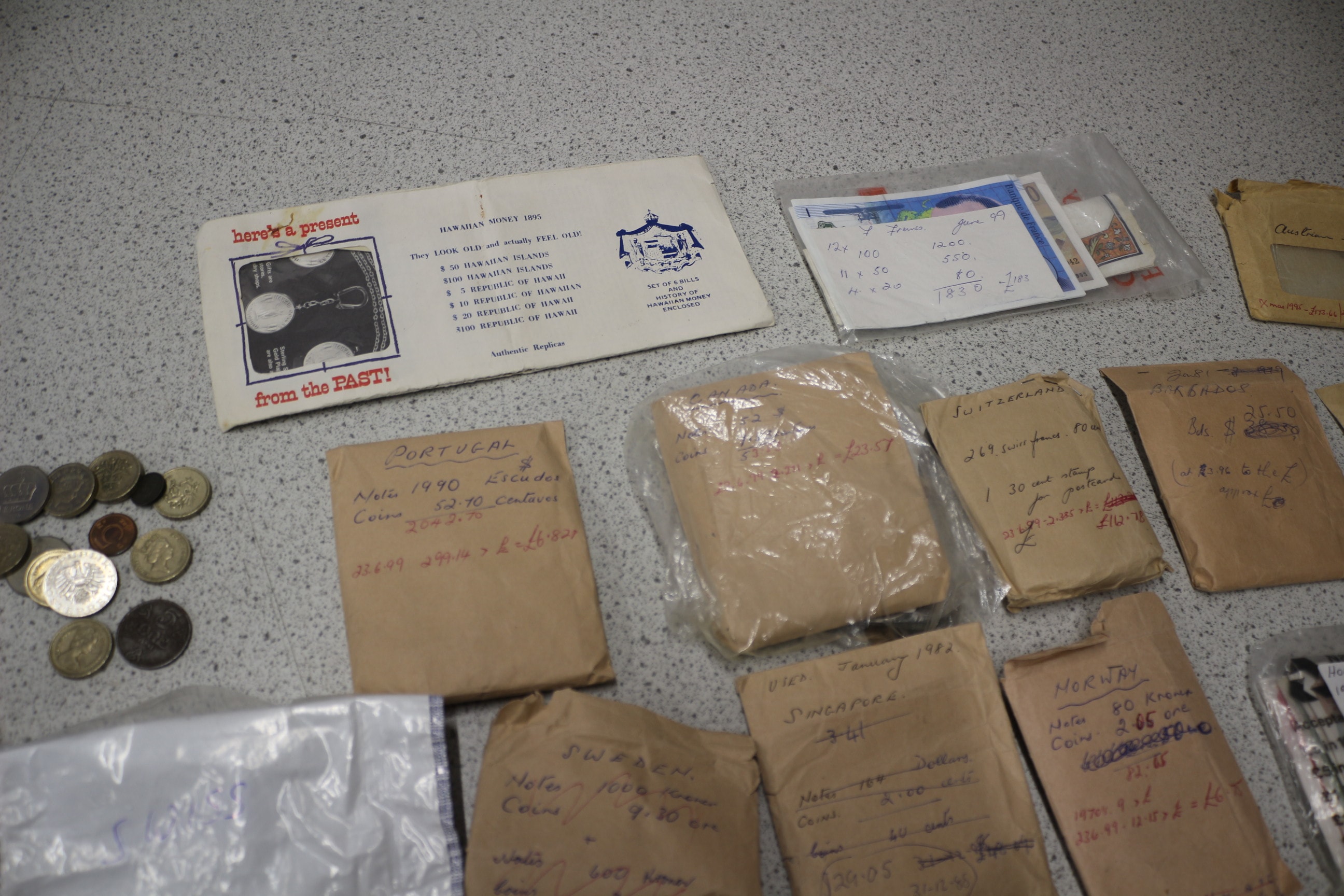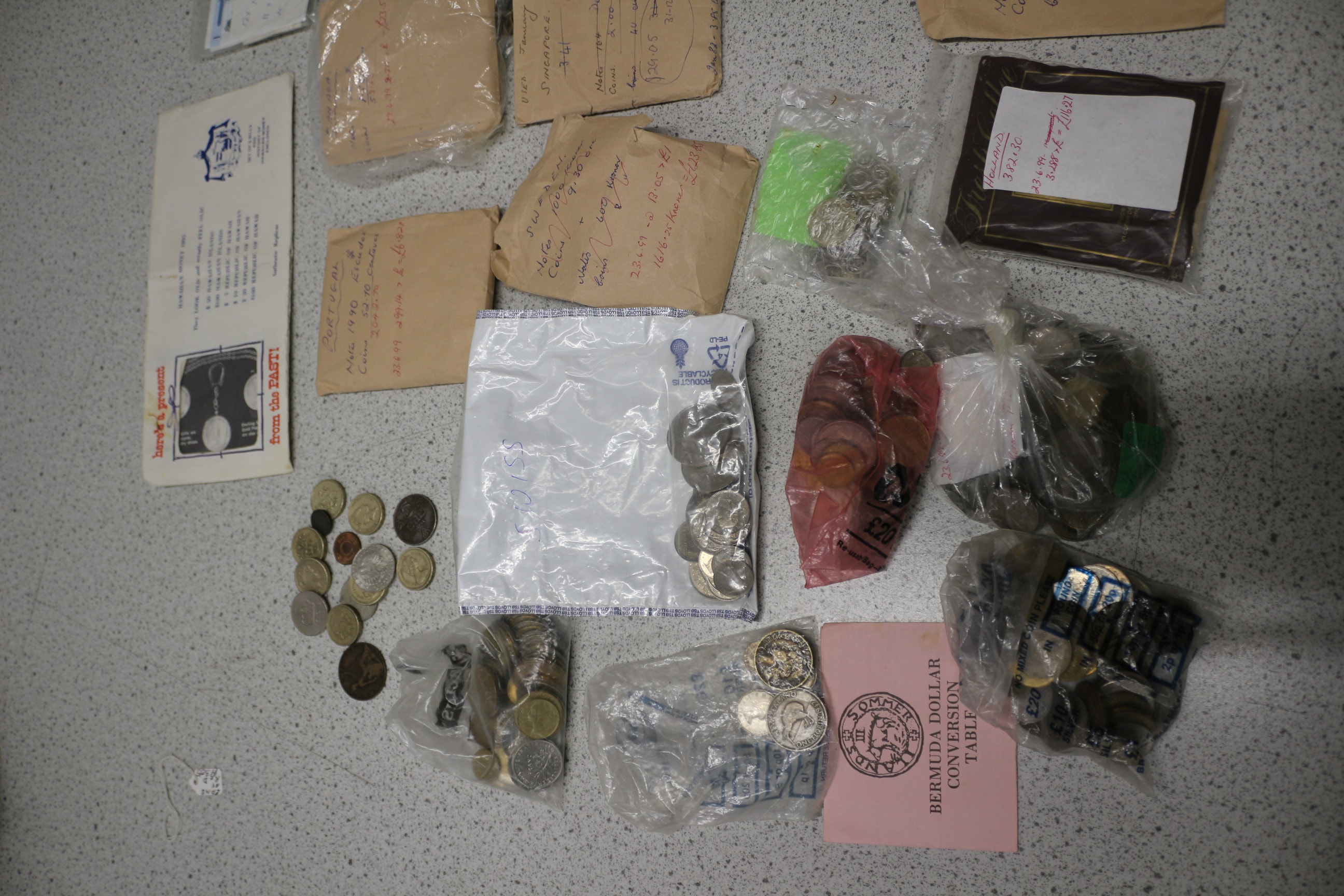 A diverse collection of world coins from various countries, presented loose, in plastic bags, and in numerous handwritten paper envelopes, alongside a ‘Hawaiian Money 1895’ replica set and a ‘Bermuda Dollar Conversion Table’.
