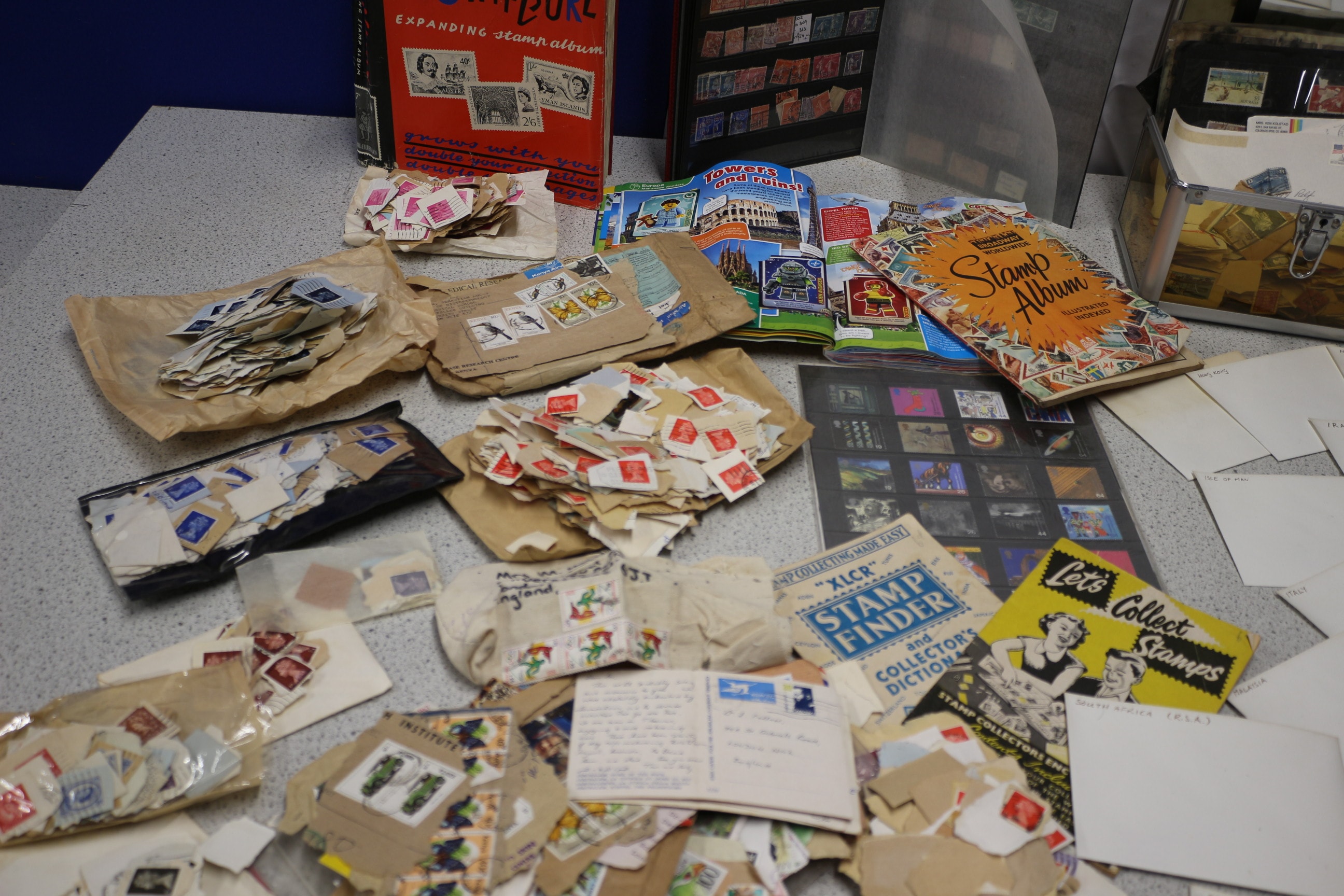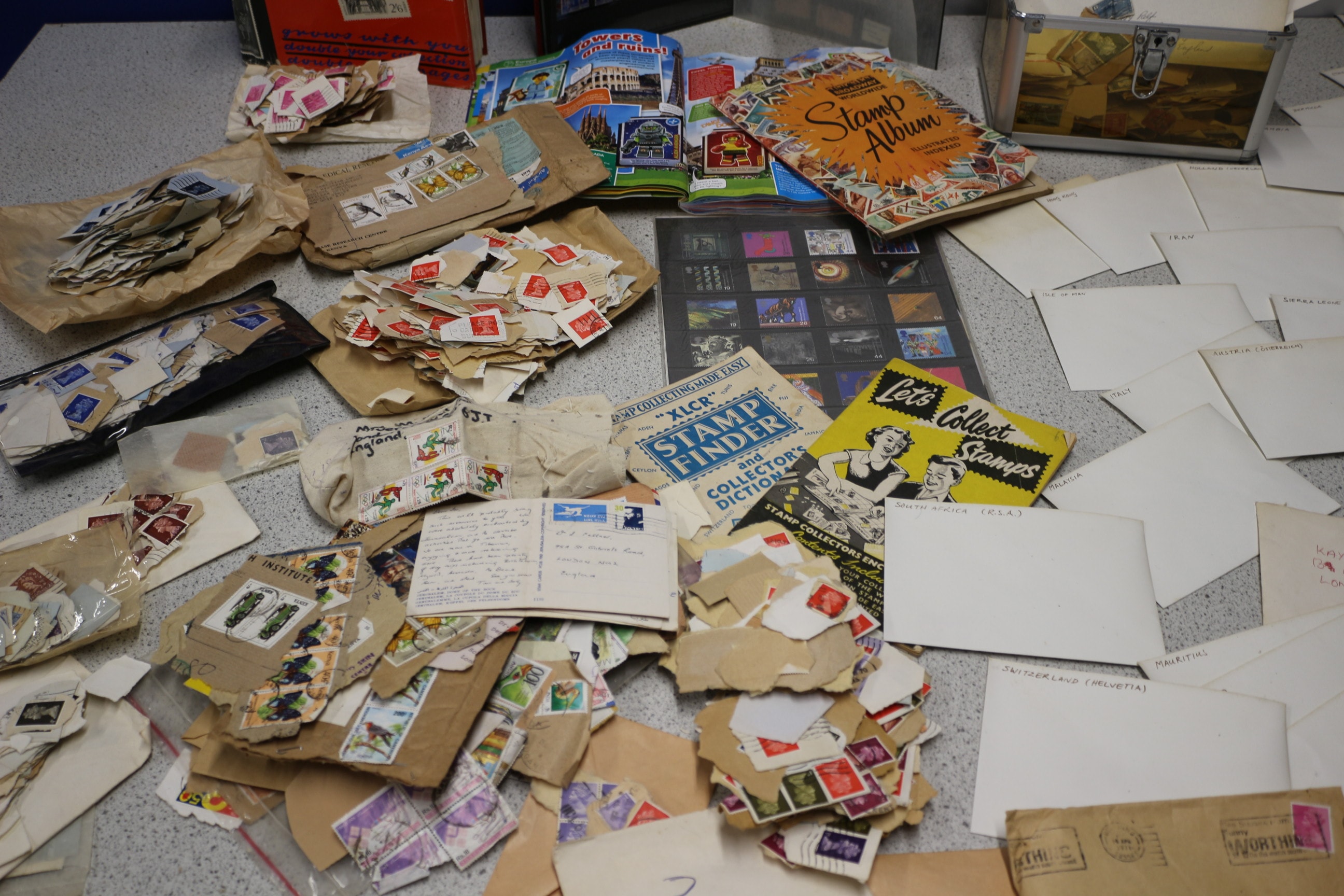 A large collection of postage stamps, including a red Stanley Gibbons “The SWIFTURE” Expanding Stamp Album, various loose stamps, and additional albums and envelopes.