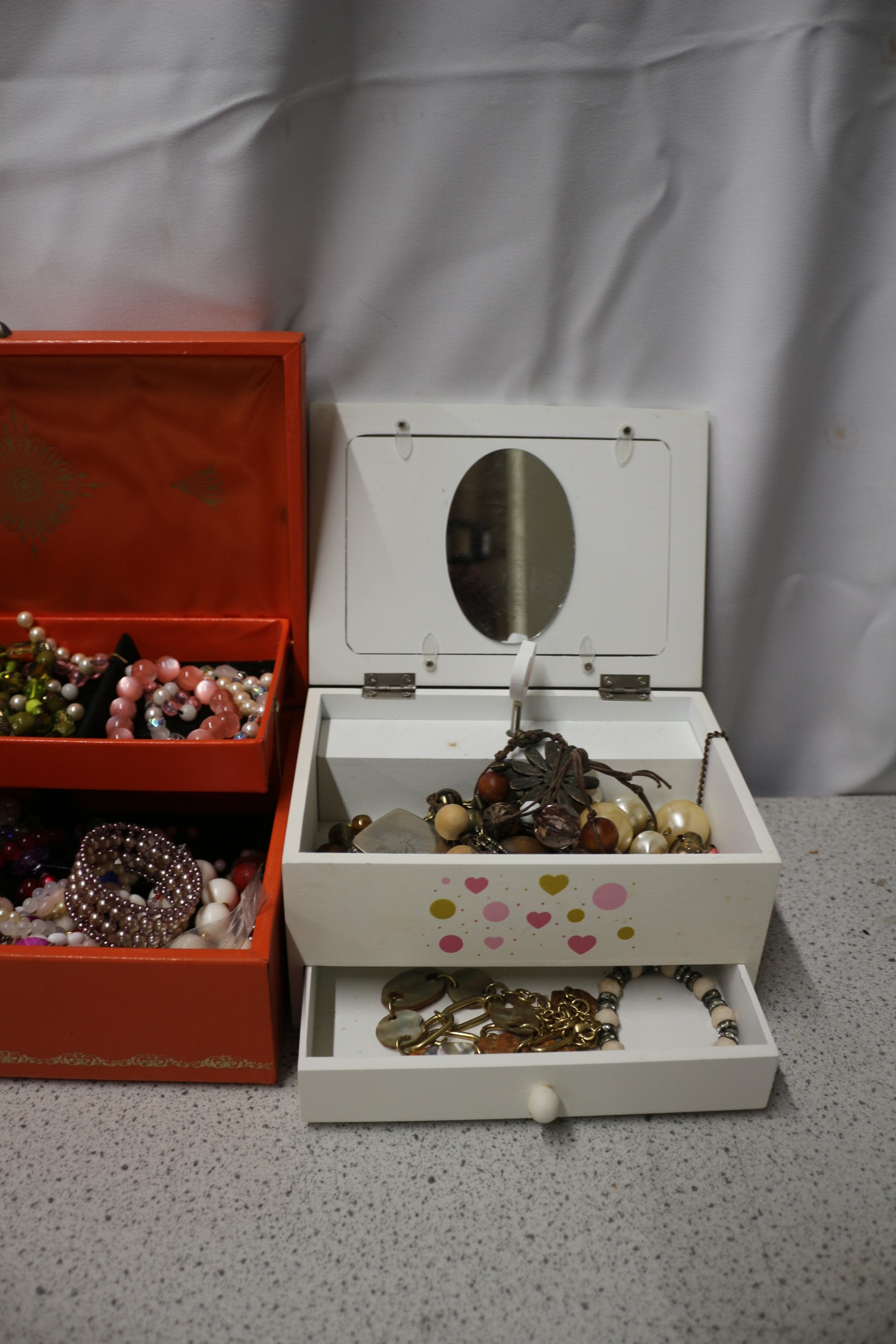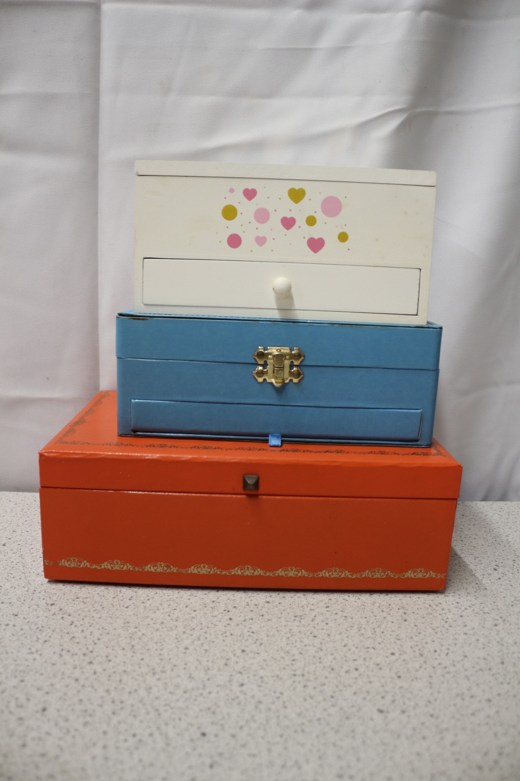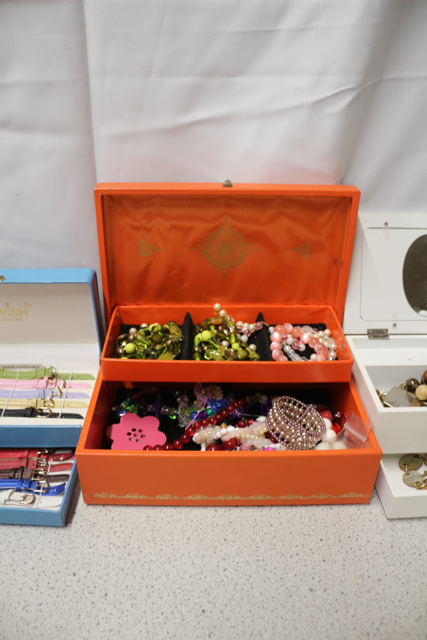 A light blue, two-tiered jewellery box with a gold-tone clasp, labelled “MX WISH COLLECTION®” and “BUTTON STRAPS”, containing multiple rings and numerous multicoloured watch straps, presented with two additional tiered jewellery boxes, all filled with assorted costume jewellery.